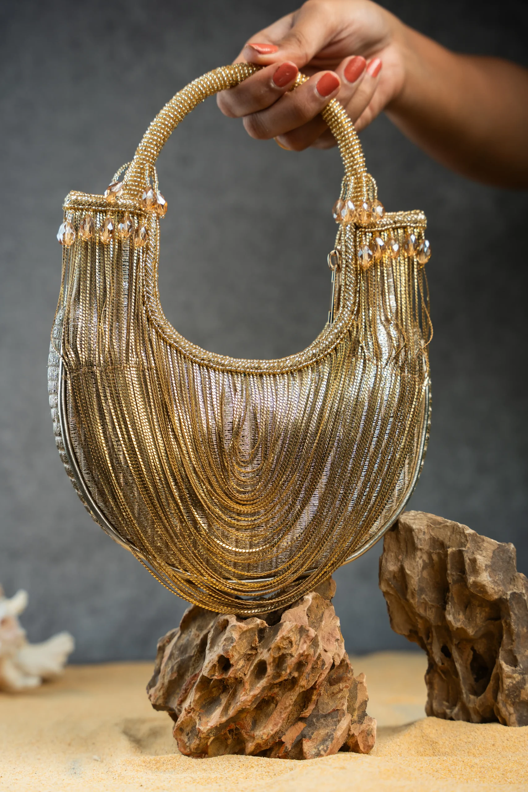 Gold Tasseled Boat Shape Potli Bag with Metallic Chains and Beaded Handle