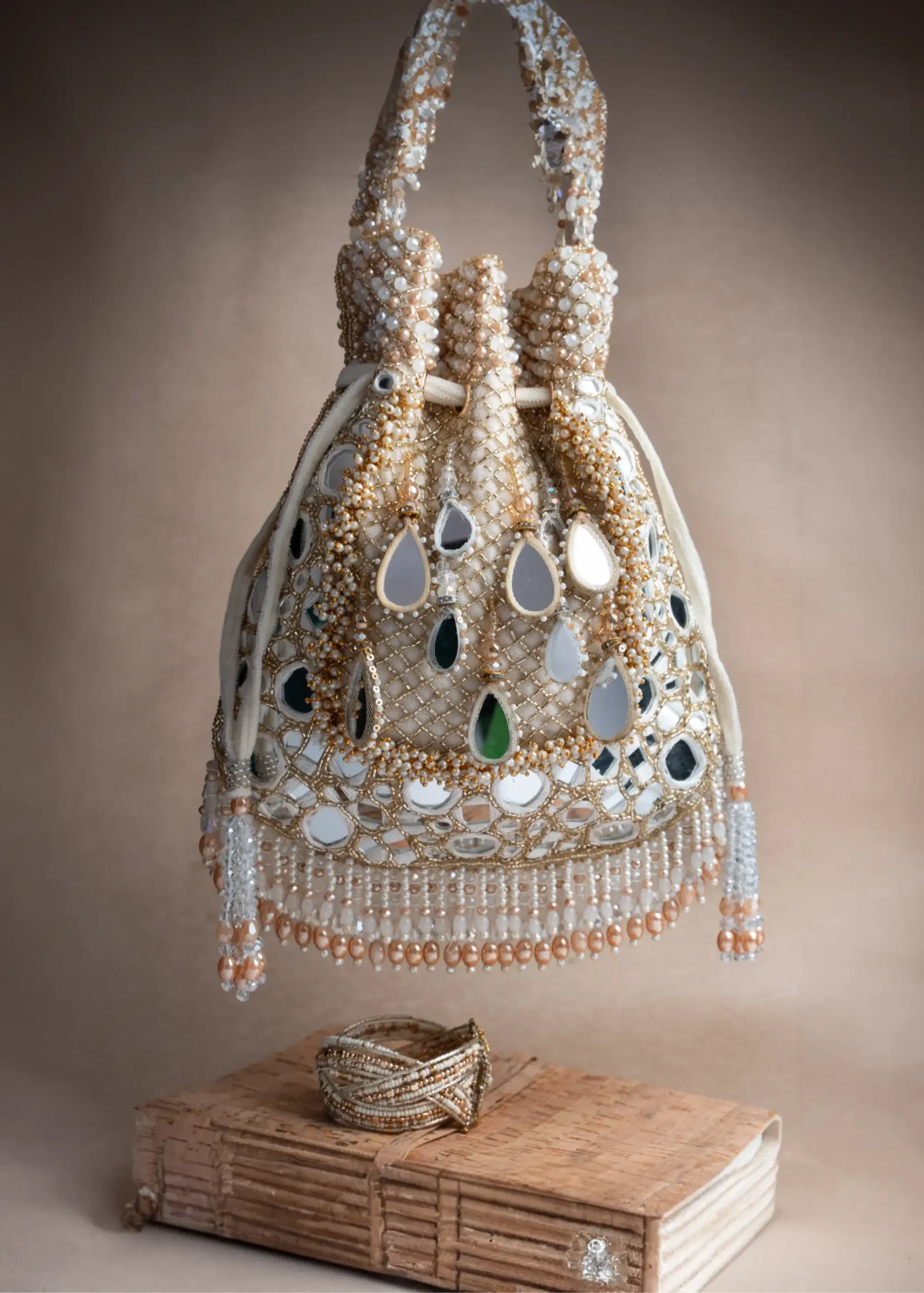 Ivory Mirror and Abla Work Potli with Pearl Finish and Tassel Detail