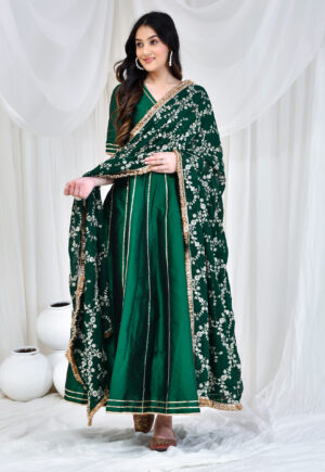 Emerald Green Taffeta Silk Anarkali Set with Embroidered Dupatta