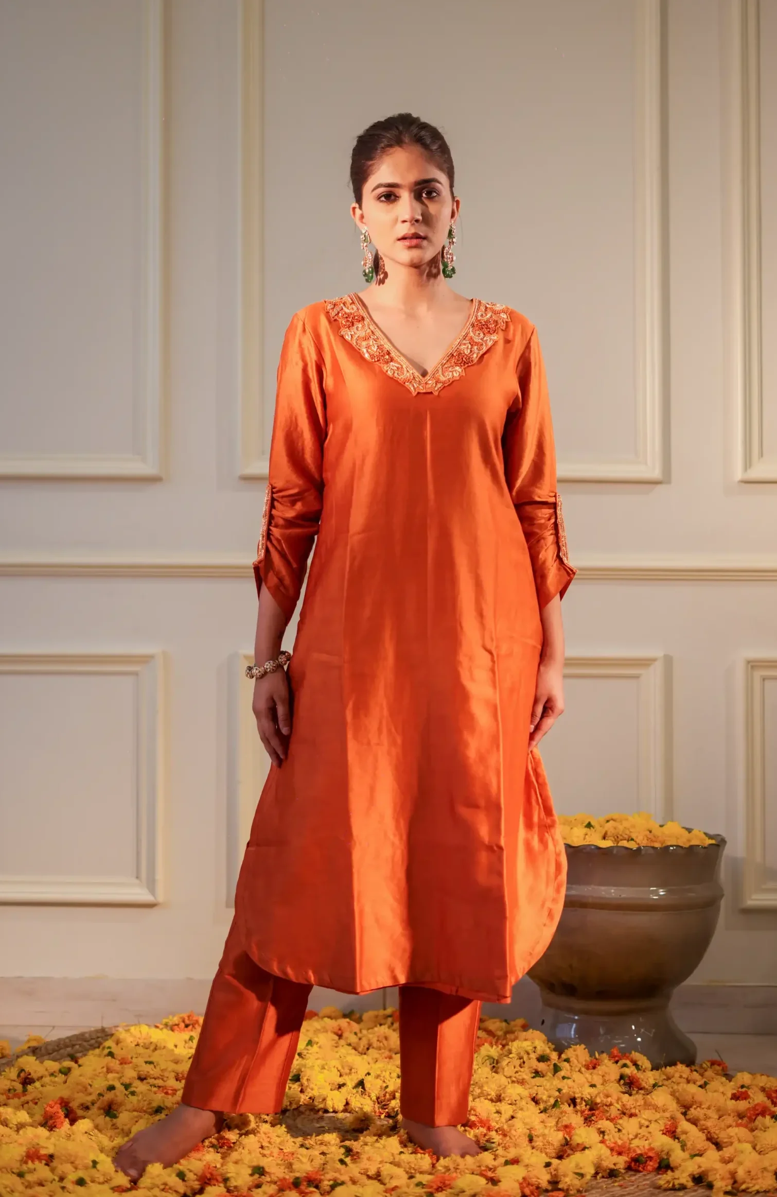 Vibrant Orange Embroidered Kurta Pant Set with Dupatta