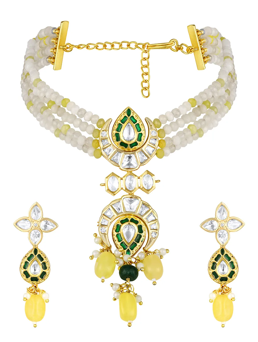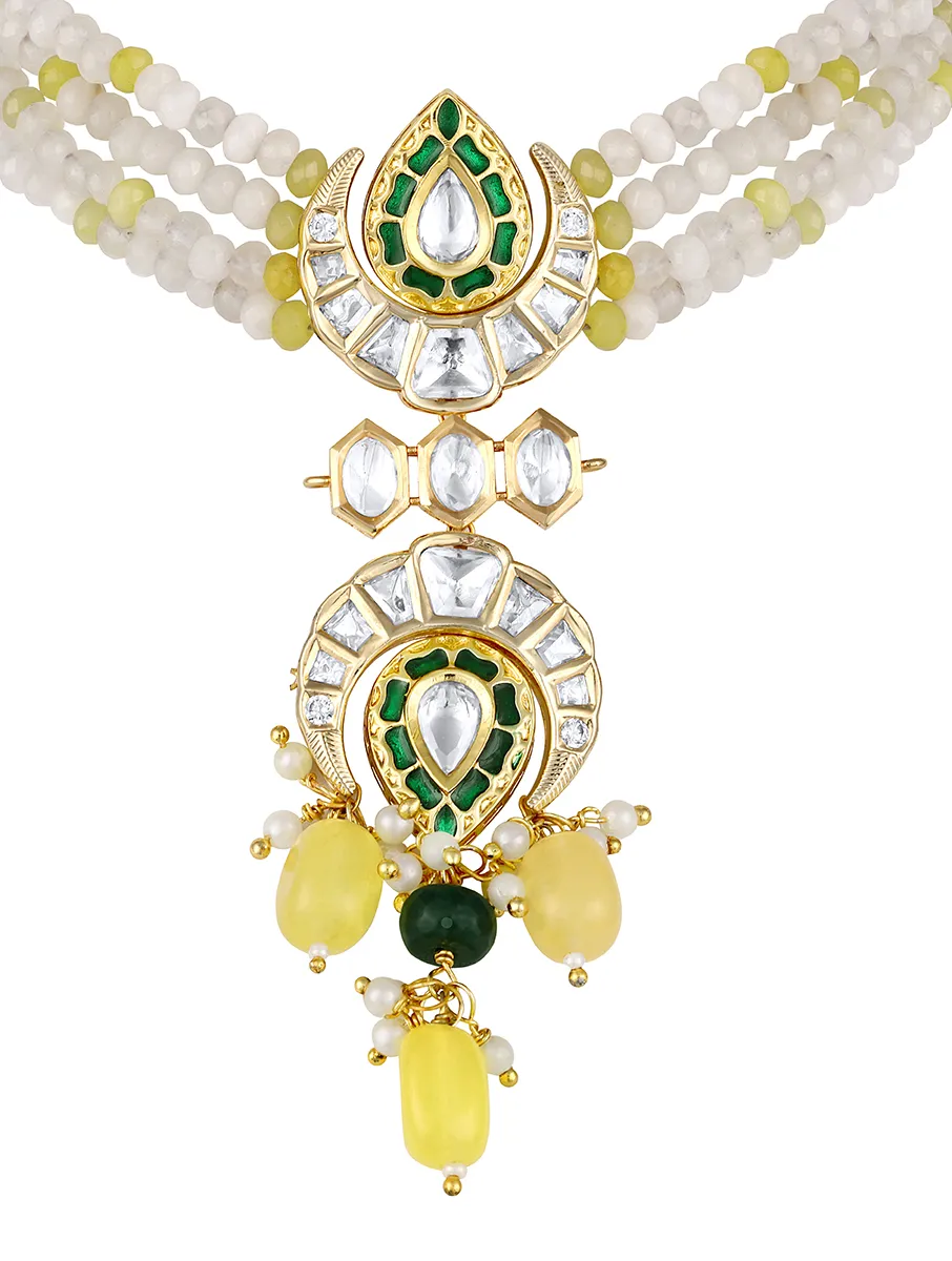Introducing Agate Kundan Polki Choker Set with Meenakari, Pearls and Tumble Drops Gold Finish, a striking handcrafted design in micron gold polished brass. Adorned with shimmering moissanite kundan polki, elegant agate beads, intricate hand-painted meenakari, delicate pearls, and vibrant tumble drops, this set brings regal charm to weddings and festive occasions.