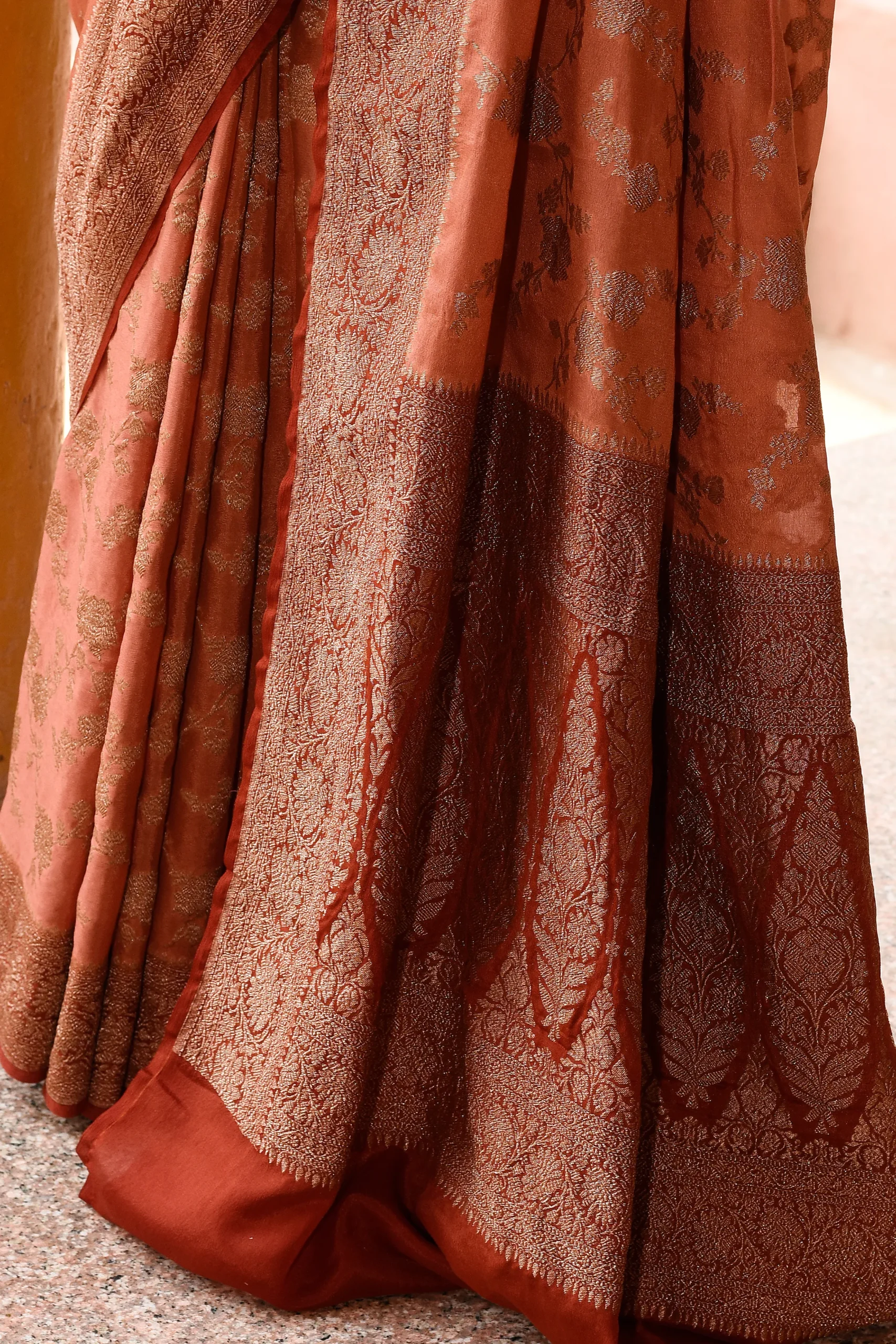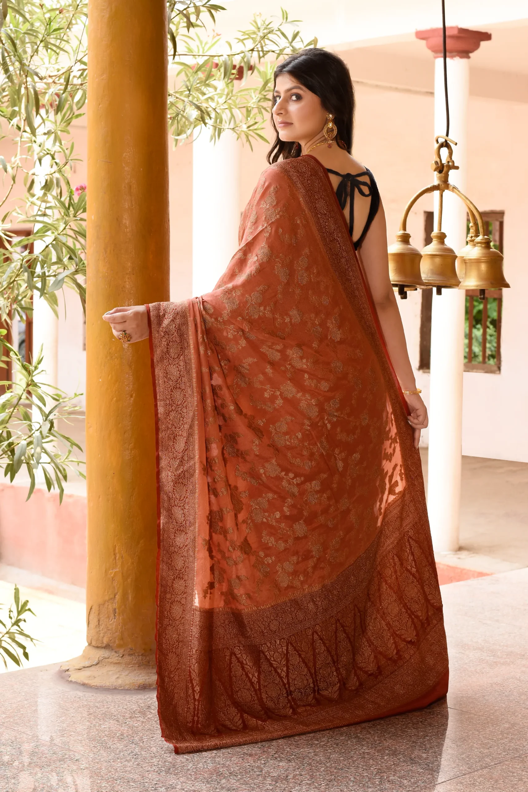 Introducing an amber-colored pure Banarasi crape chiffon silk saree, handwoven in Kashi with timeless elegance. Accented by a traditional contrast brown border and palla richly woven with gold zari, it features an all-over floral jaal crafted from delicately woven flower bels, offering a warm, ceremonial appeal. Comes with a matching running blouse piece.