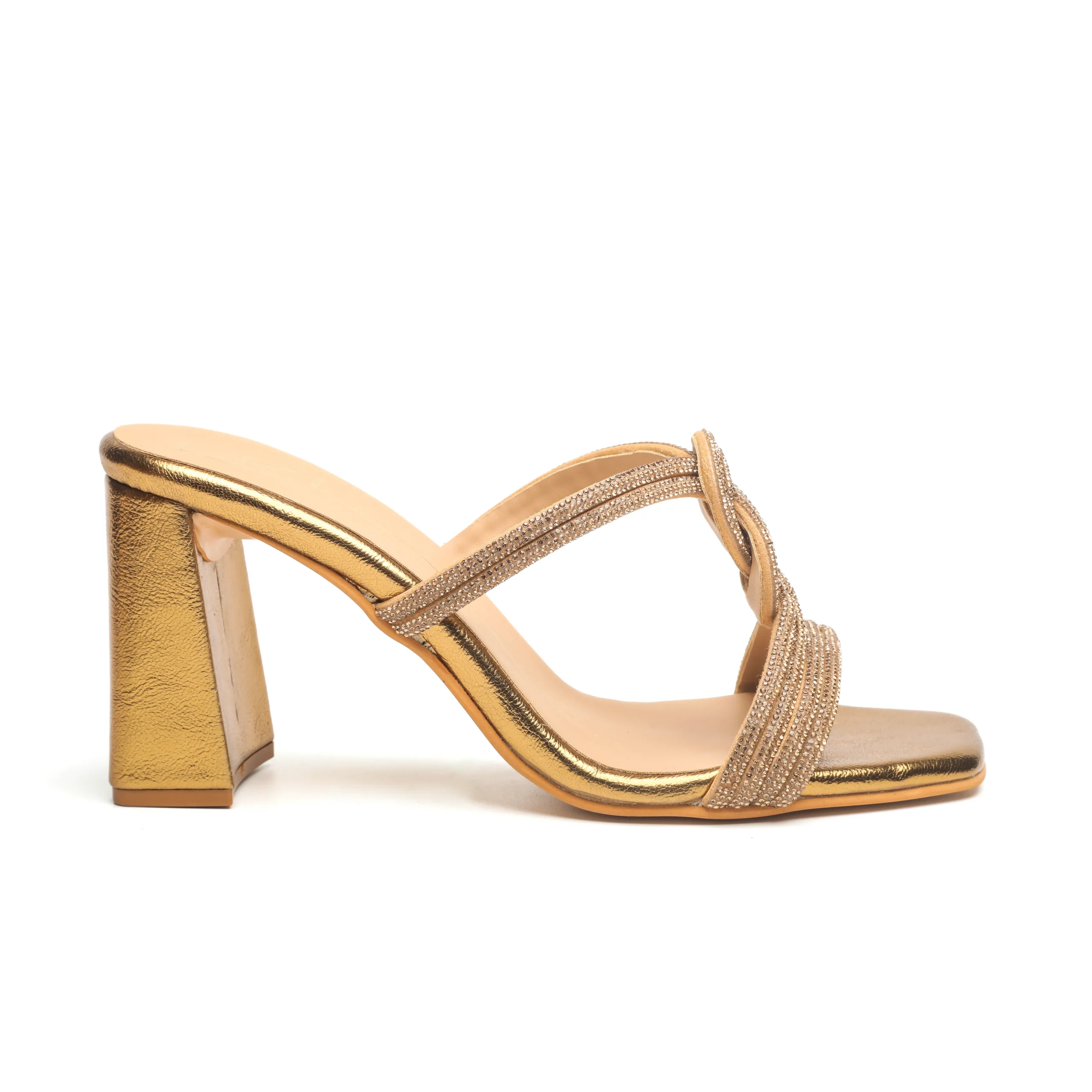 Featuring a pair of antique gold block heels in faux leather base with swarovski detailing. It has a faux leather underlining, 3.5 inch-heels and a gel cushioning.