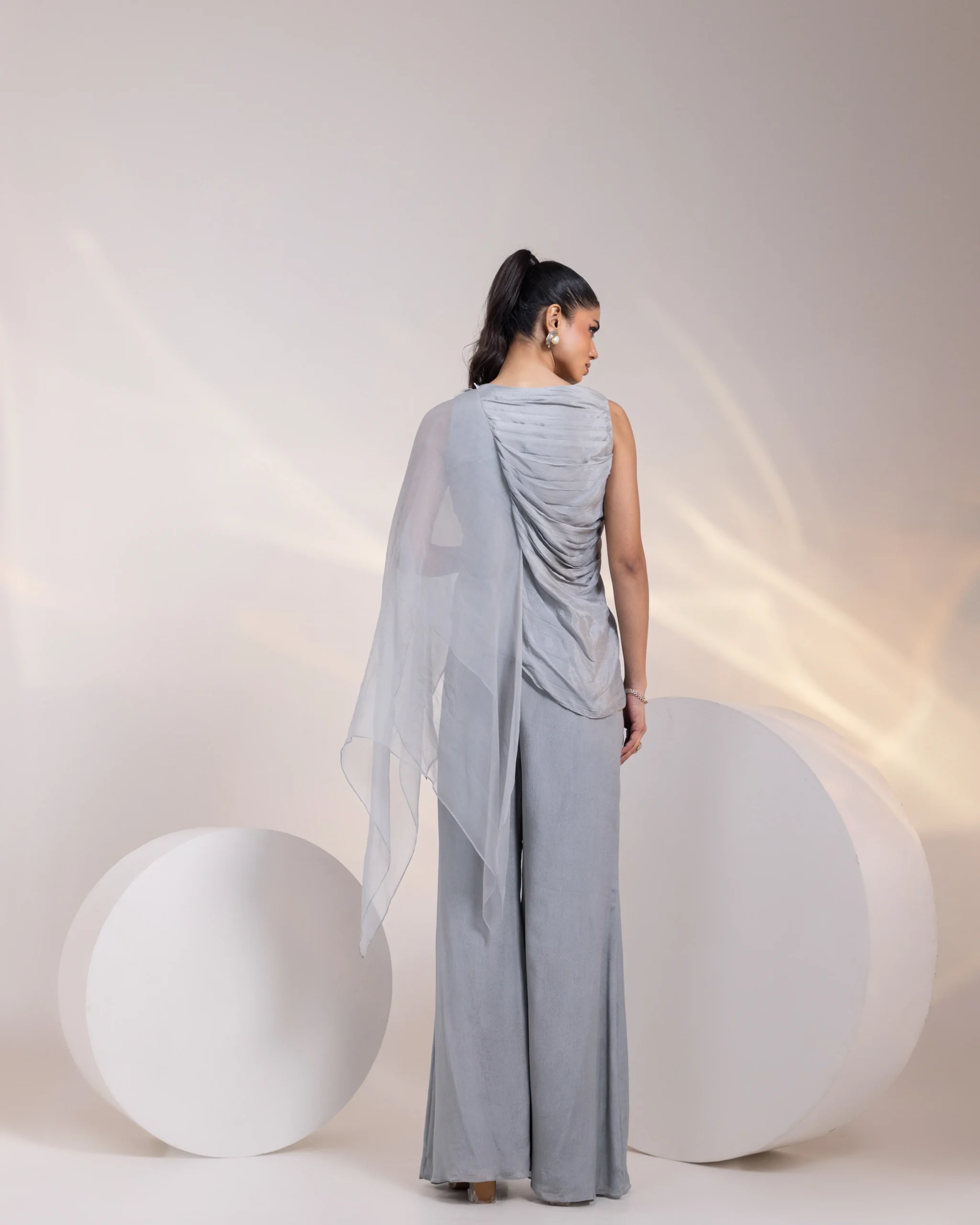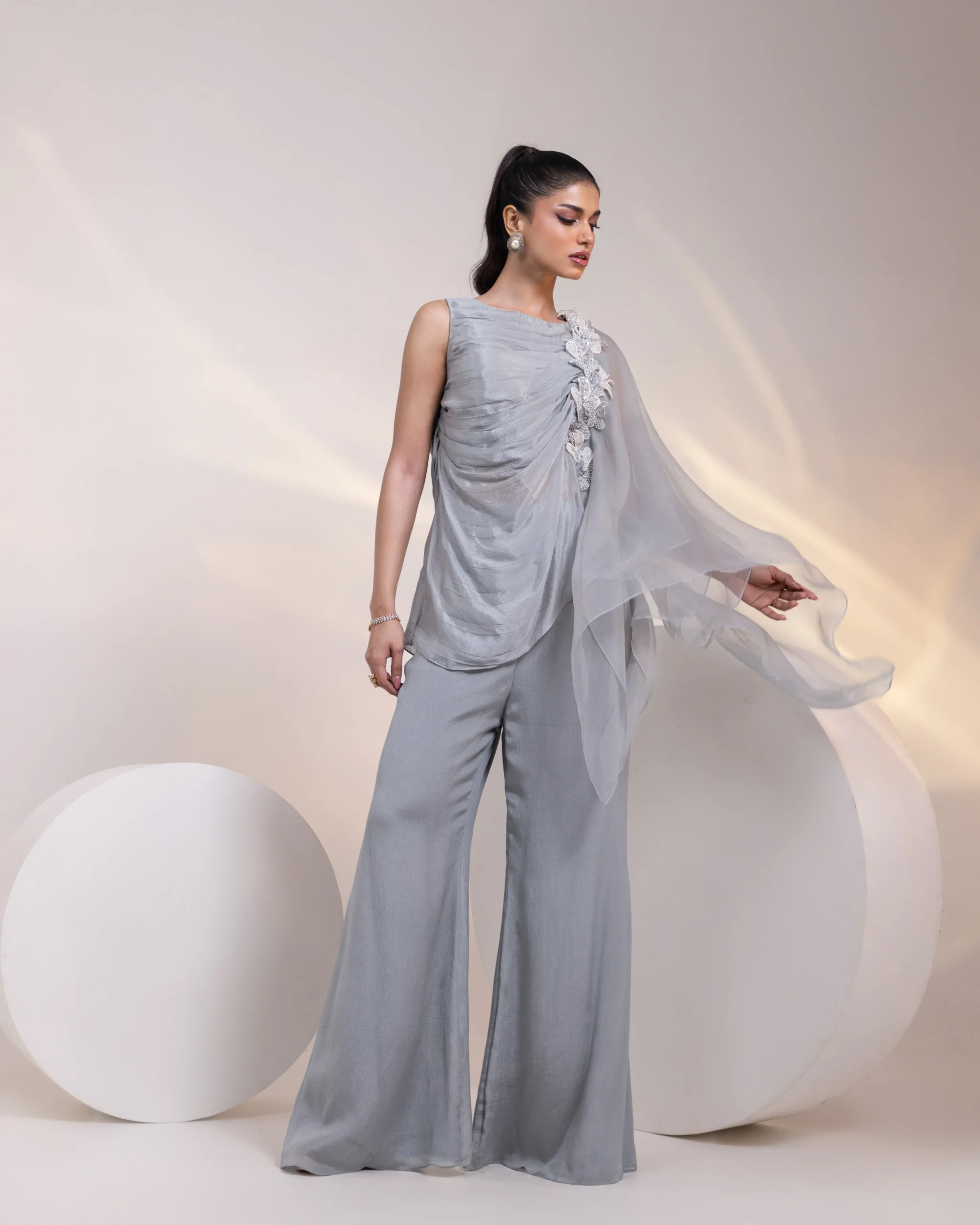 Ash Grey Embroidered Tunic & Wide-Leg Pant Set with Organza Drape