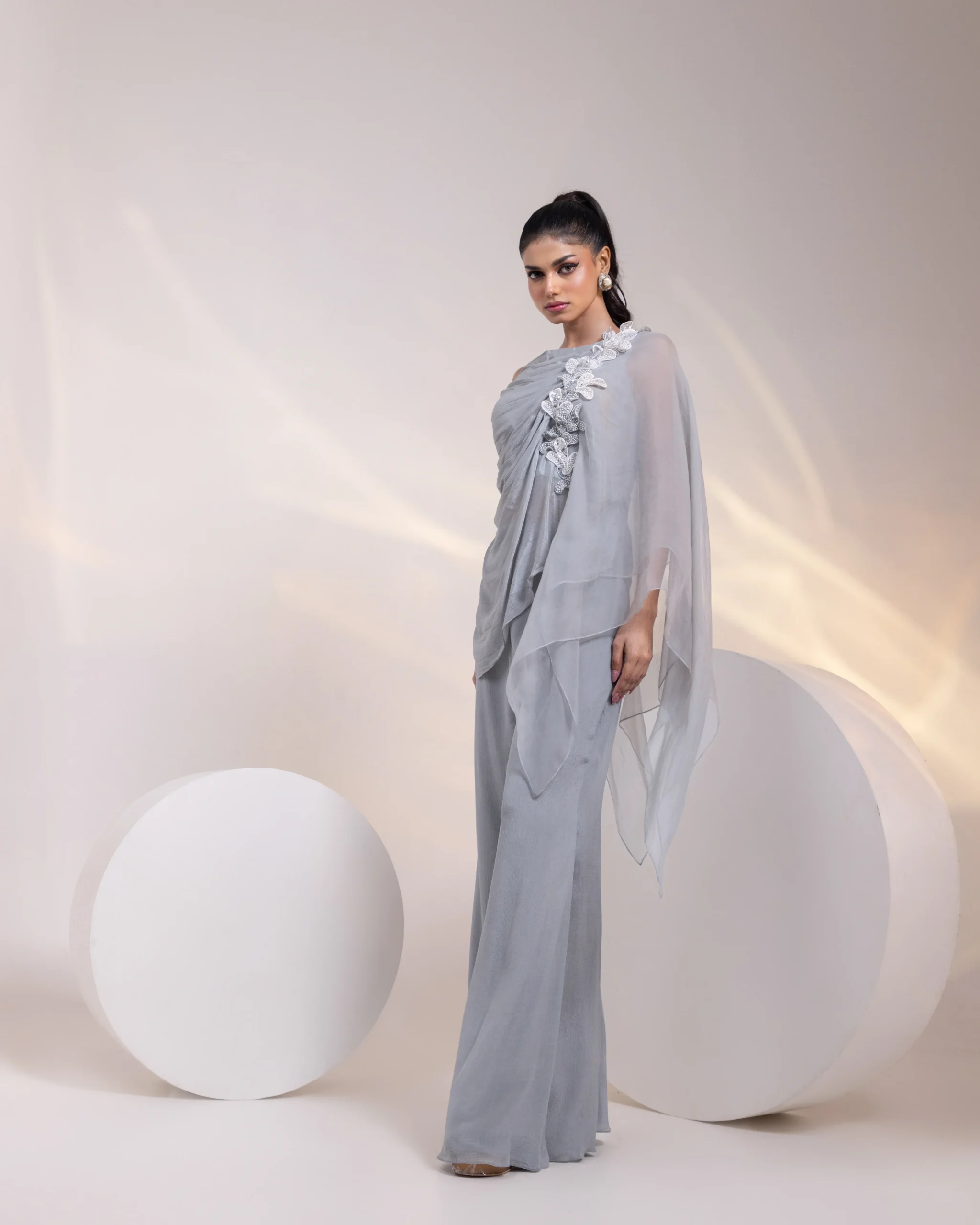 Introducing an elegant ash-grey contemporary ensemble that fuses traditional draping with modern tailoring. The sleeveless tunic is adorned with delicate silver floral embroidery and subtle sequin accents, enhanced by a gossamer organza drape cascading over the shoulder. Paired with fluid wide-leg trousers, this refined set offers effortless movement and sophisticated charm for galas and festive celebrations.