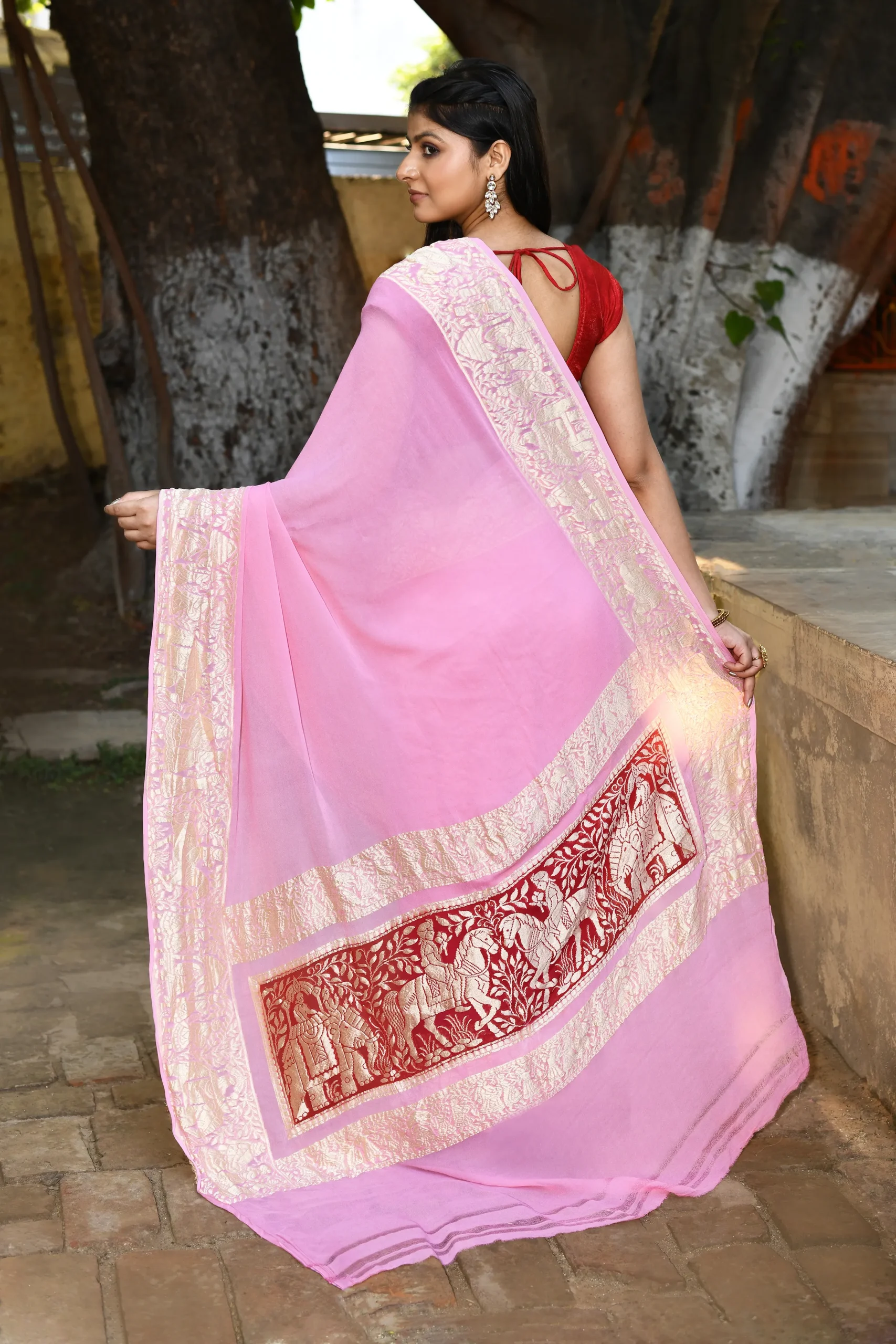 Introducing our Baby Pink Crape Chiffon Silk Saree, a masterpiece of flowy elegance. This exquisite drape features a unique border and palla embellished with shimmering water gold zari for a sophisticated glow. Complete with a running blouse piece, this lightweight silk saree blends modern minimalism with traditional heritage artistry.