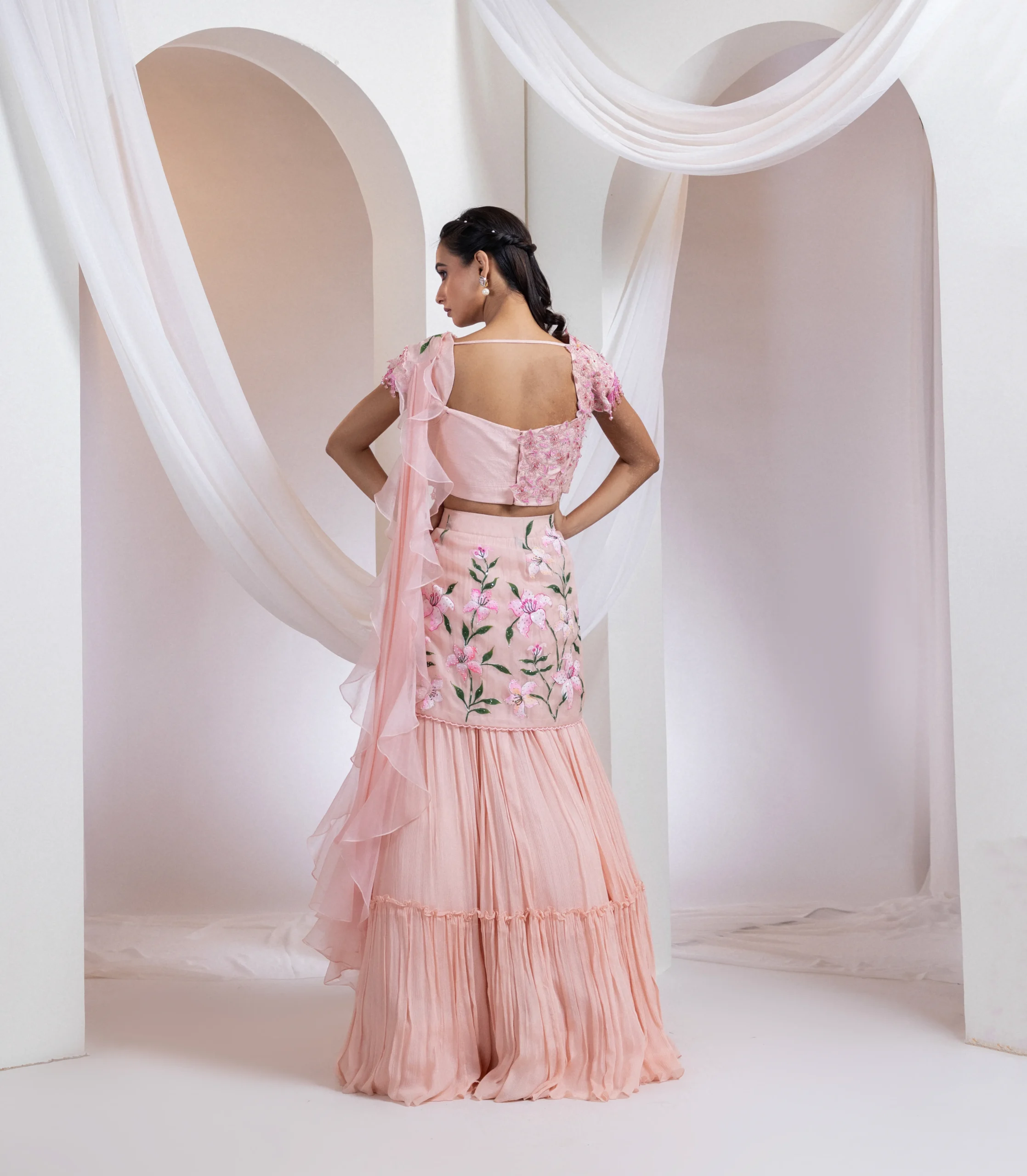 Pair this saree with delicate statement earrings and strappy heels to enhance its romantic appeal. Keep makeup fresh and luminous to complement the soft florals, and style your hair in loose waves or a soft bun to highlight the detailed blouse and flowing ruffles.