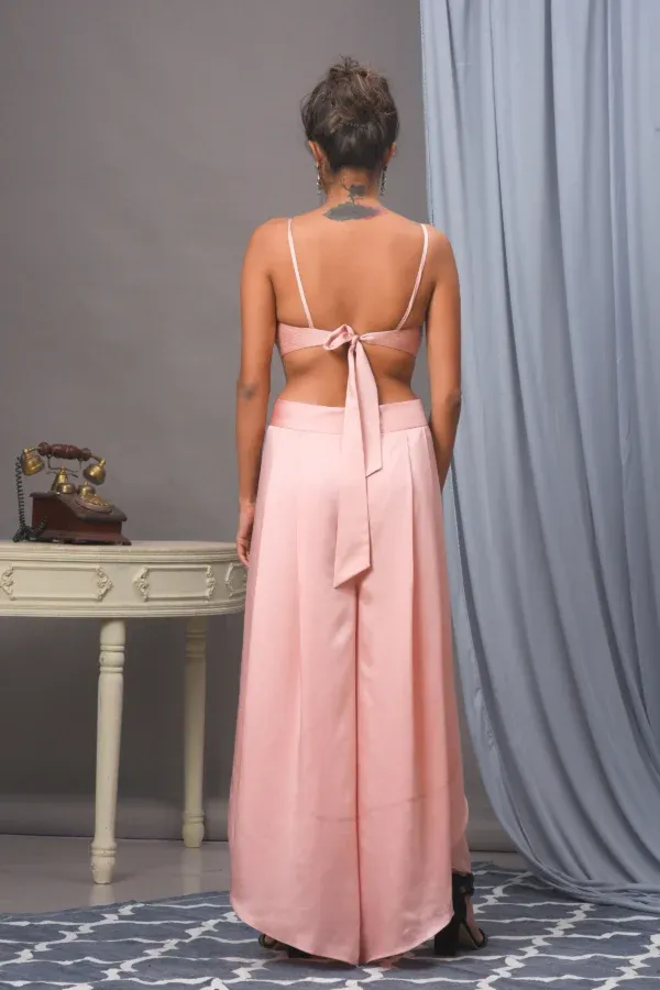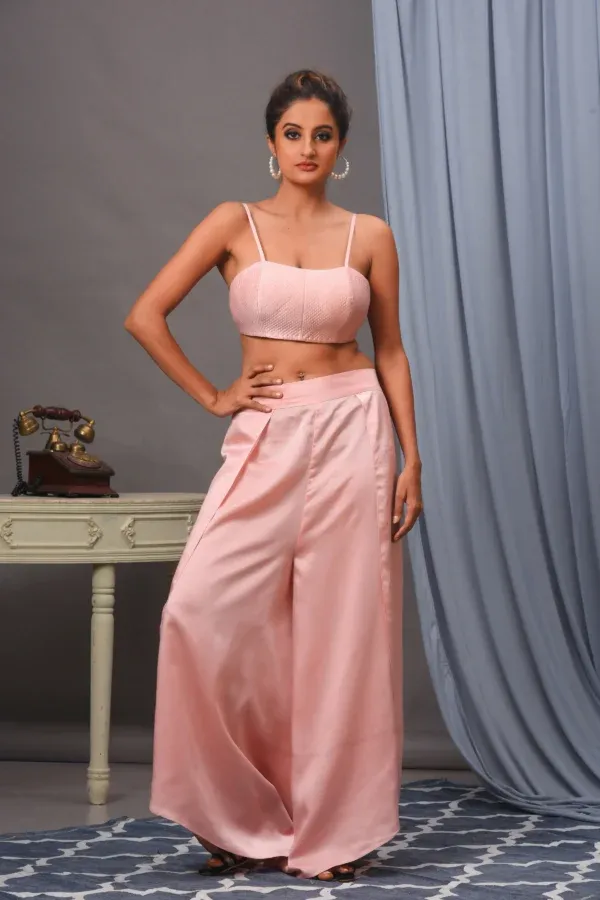 Introducing our gorgeous baby pink organza cape, adorned with exquisite embroidered lace trim and trendy tassels. This elegant ensemble includes a stylish quilted bustier and palazzo pants, enhanced with refined side flaps. Ideal for making a memorable impression at any occasion.