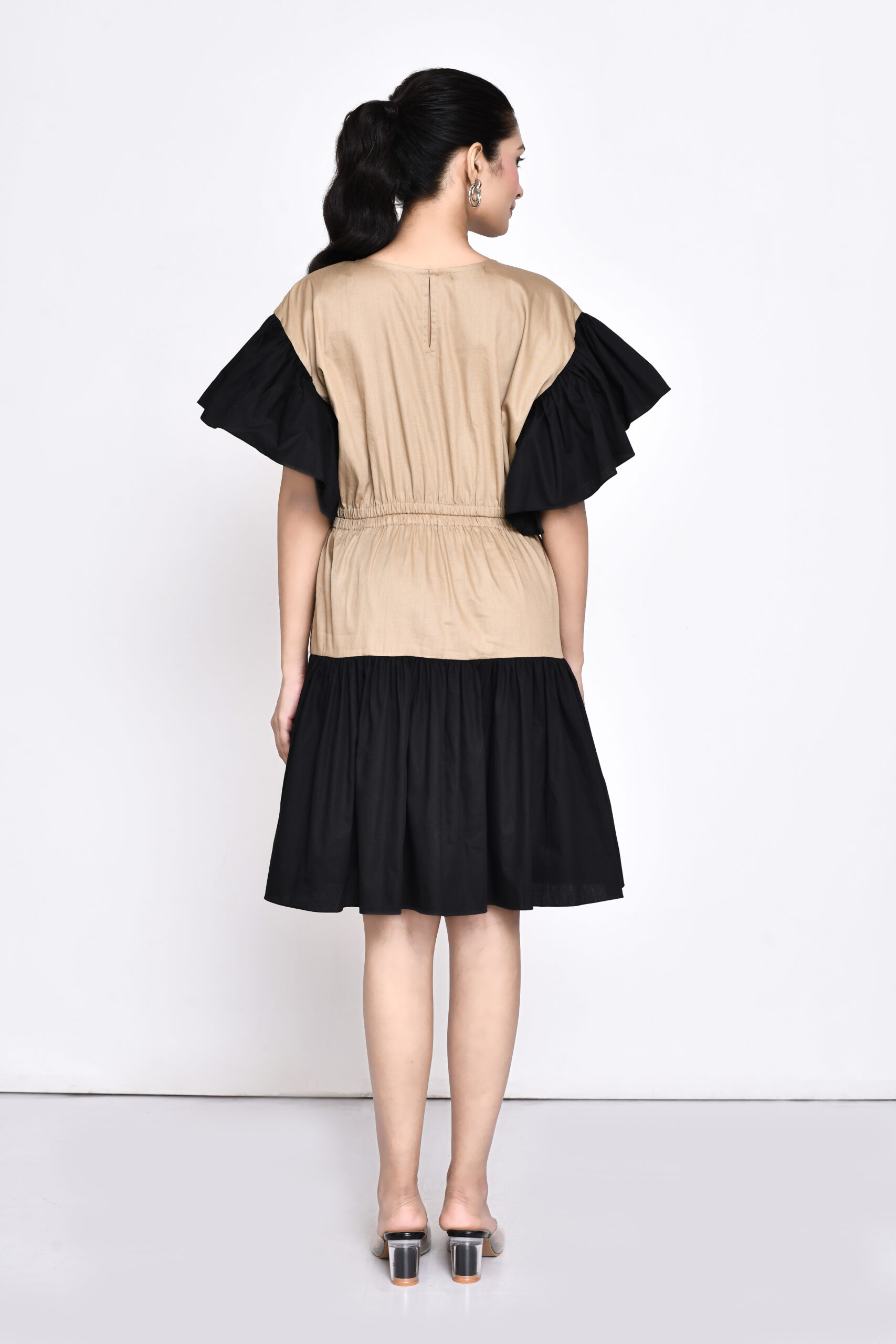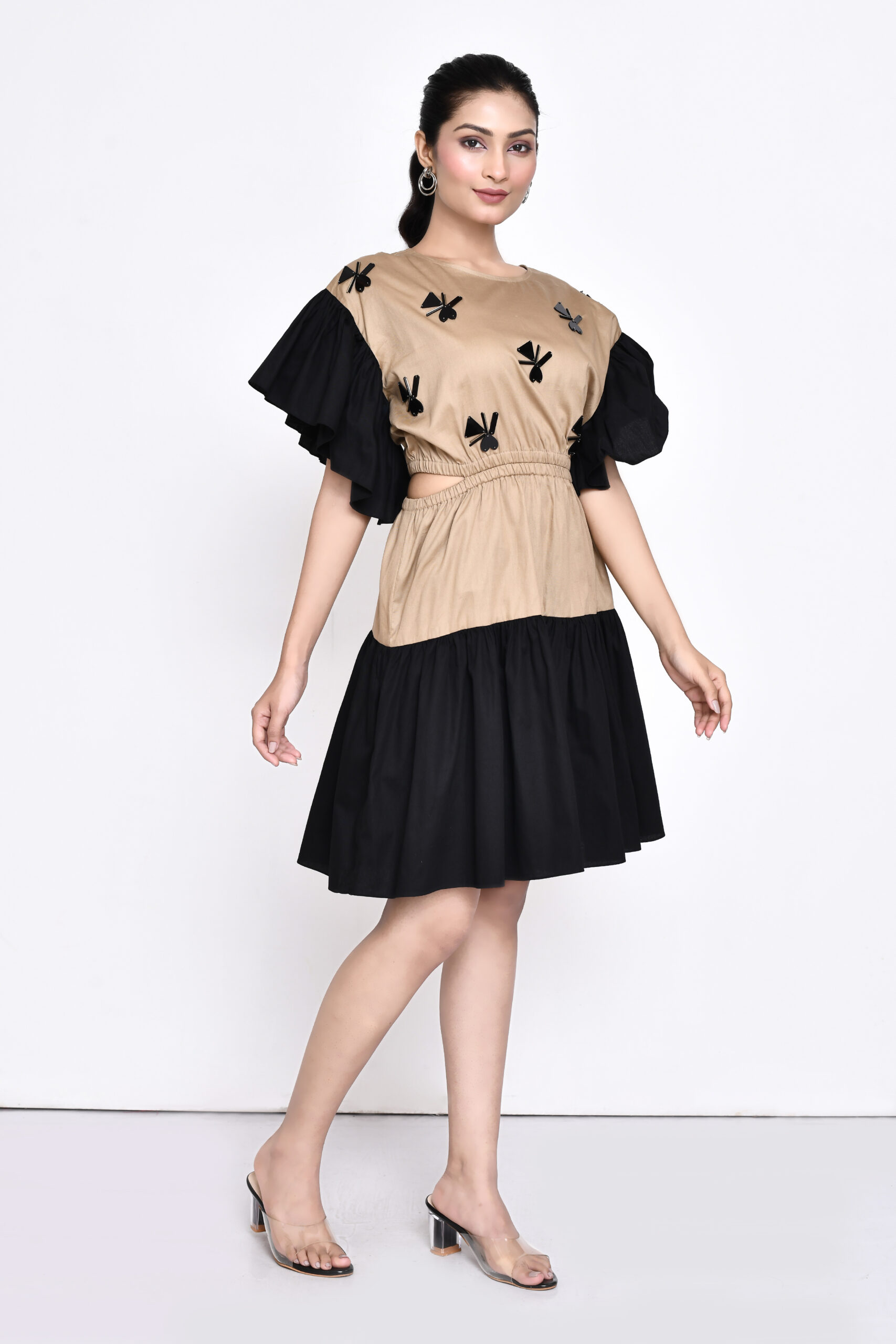Introducing our stunning beige and black color-blocked dress, a quirky addition to your wardrobe that perfectly balances bold design with contemporary style. This dress features eye-catching black chunky embellishments that elevate its unique look. The cut-out elasticated waistline offers a modern silhouette, accentuating your look while ensuring maximum comfort.