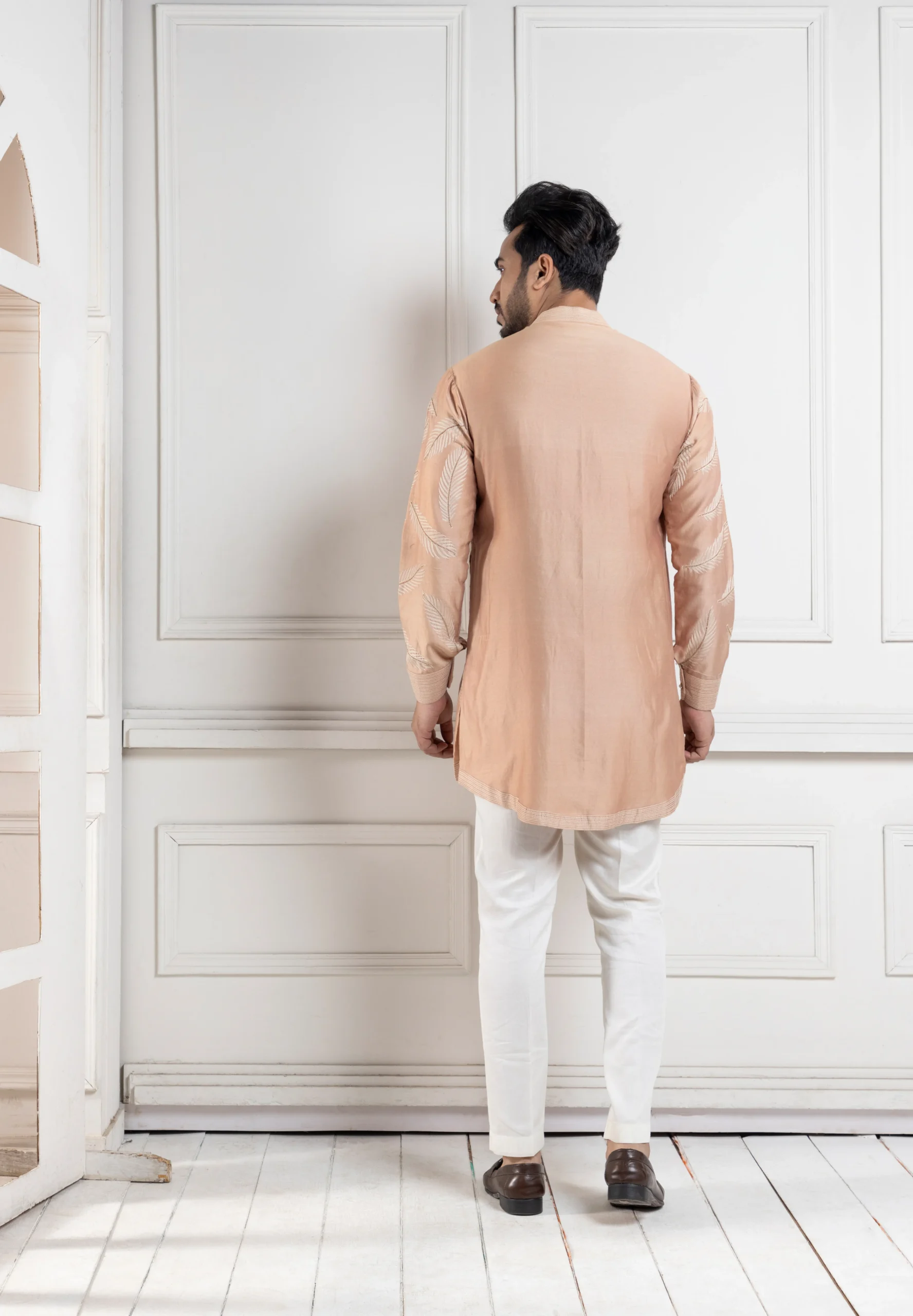 Introducing the beige embroidered kurta set, a refined expression of elegance and timeless craftsmanship. Crafted from soft chanderi, it features intricate palm leaf embroidery in subtle threadwork for a nature-inspired appeal. Paired with soft malai cotton pants. Designed for lightweight comfort and sophistication, this kurta is perfect for festive occasions, weddings, and evening celebrations.