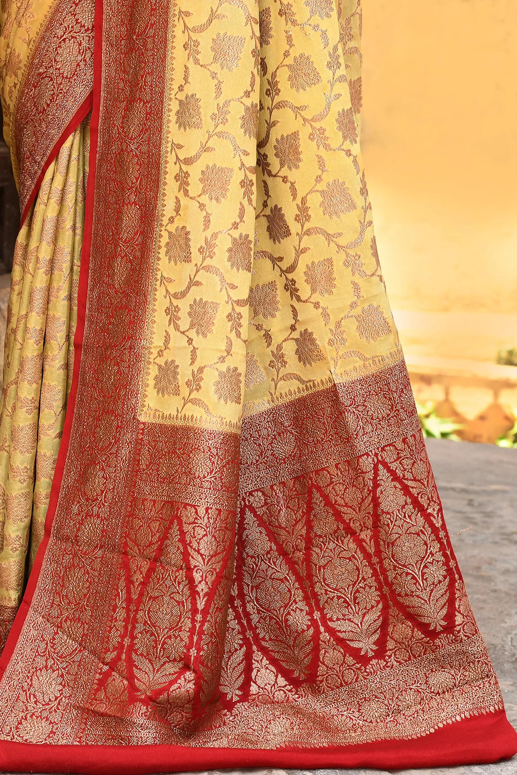 Beige Banarasi Crepe Chiffon Silk Saree with Gold Zari & Red Border