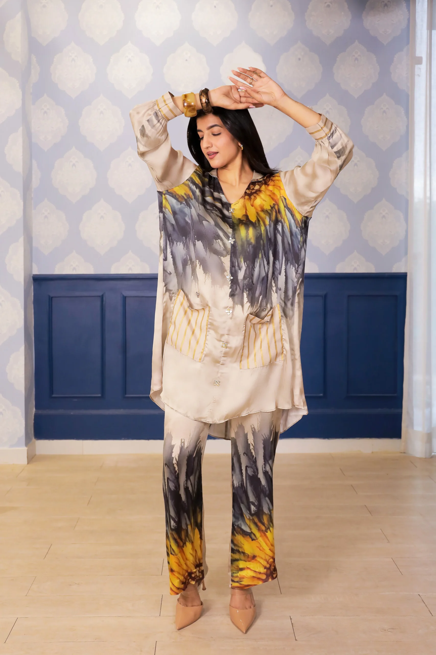 Style this co-ord set with minimal gold or oxidised jewellery to highlight the metallic accents. Pair with nude, tan, or metallic flats for daytime wear, or switch to block heels for a polished look. Keep makeup soft and natural with warm beige or peach tones, and finish with a structured tote or sling bag for effortless everyday sophistication.