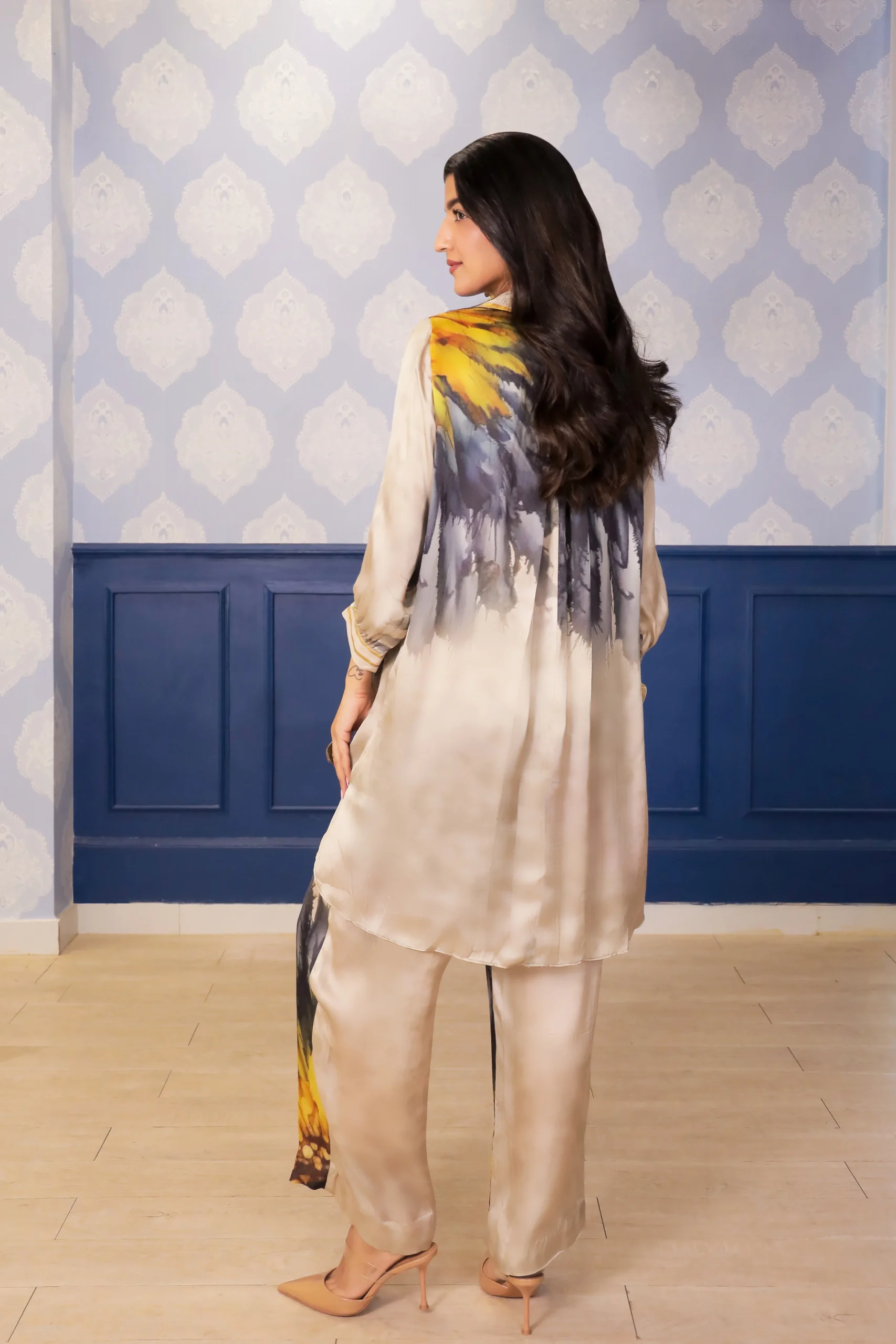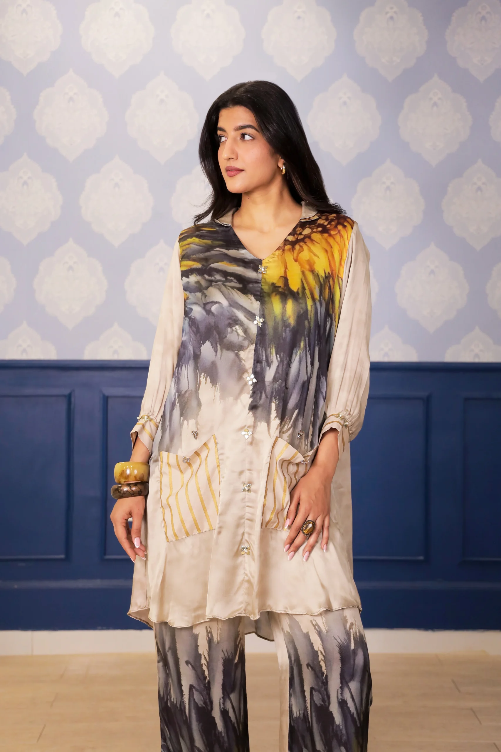 Introducing a refined beige sunflower print satin co-ord set designed for effortless everyday elegance. The straight-cut kurta features a classic Peter Pan collar, metallic floral patch accents along the placket, and oversized striped Chanderi foil pockets for a contemporary contrast. Coordinated sleeve cuffs and straight-fit pants complete this smart fusion of prints, textures, and comfort.