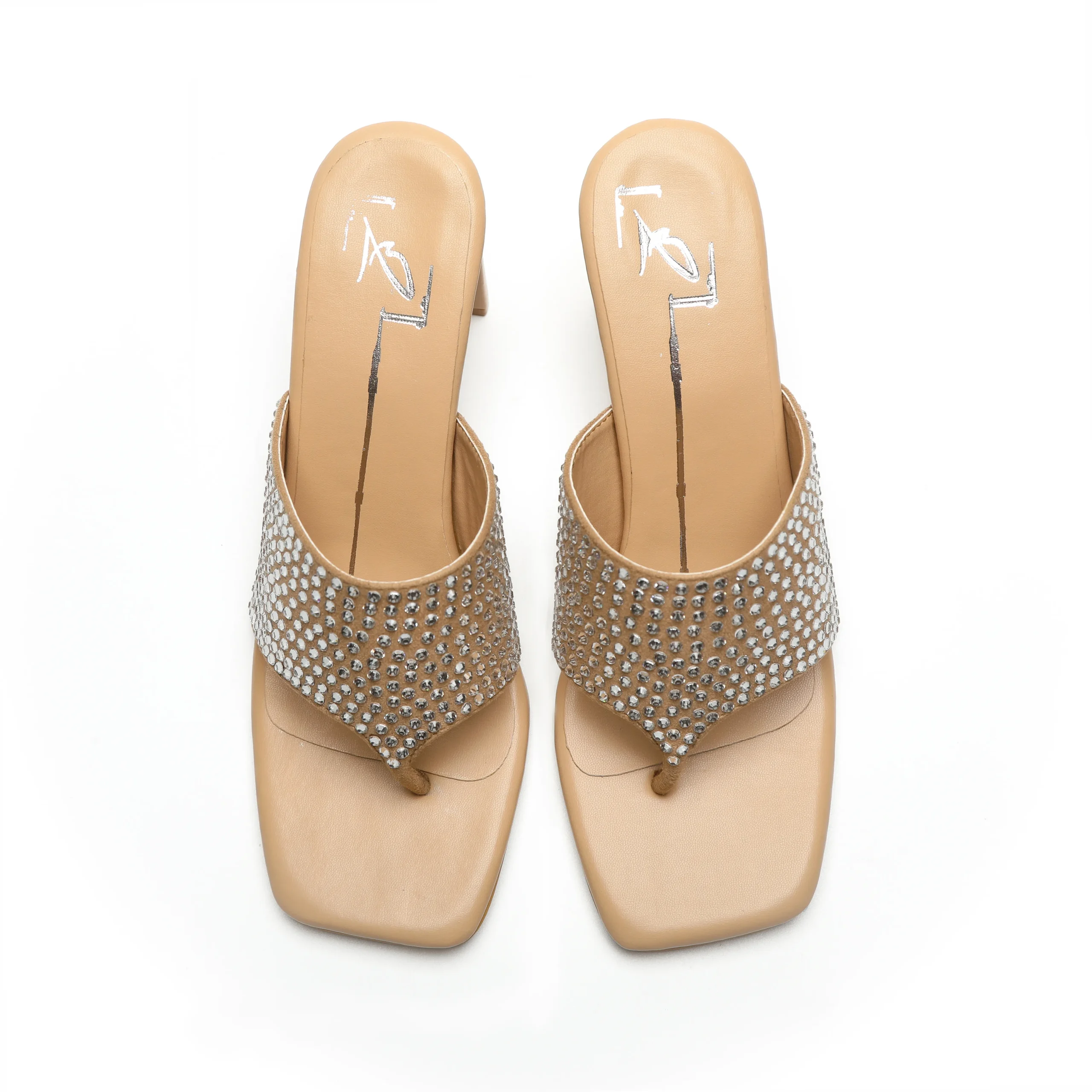 Style these beige Swarovski embellished block heels with elegant sarees, pastel lehengas, or chic Indo-western outfits for festive celebrations and special gatherings. The sparkling crystal-studded upper adds a glamorous touch while maintaining a soft neutral tone, making them versatile for both daytime and evening occasions. The comfortable block heel and gel cushioning ensure ease of wear throughout long events.