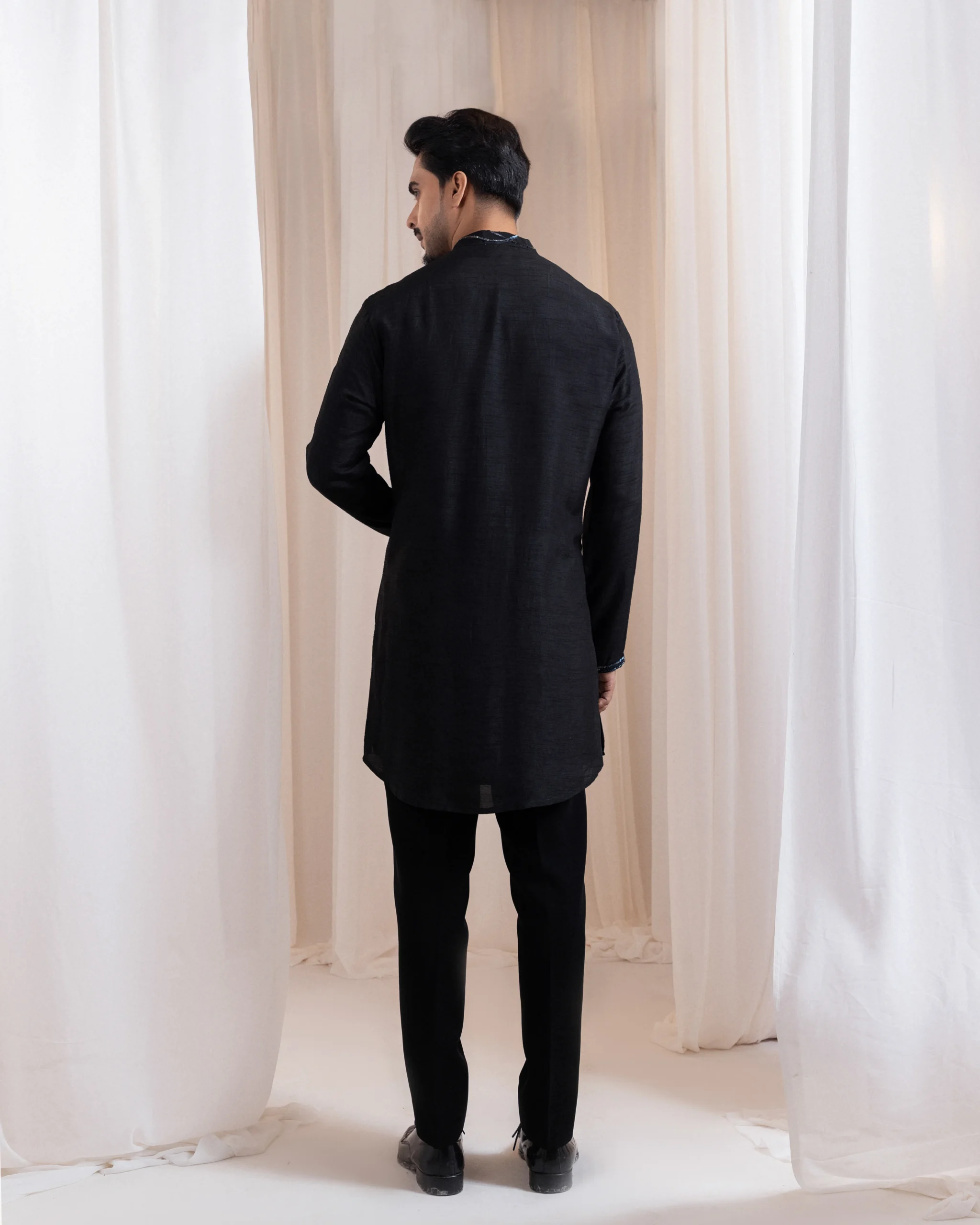 Introducing a sleek black kurta set crafted in structured sheen fabric, highlighted with abstract wave stitch detailing in threads, beads, and metallic pipes across the front panel, collar, and sleeve hems. Inspired by the dynamic trail of a meteor, the embroidery delivers bold texture with refined restraint—perfect for intimate celebrations and statement day-to-evening dressing.