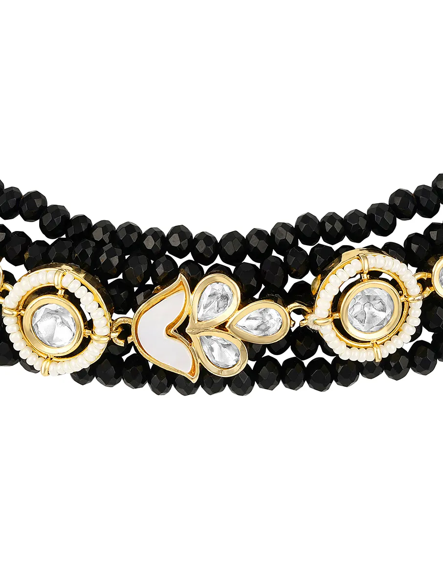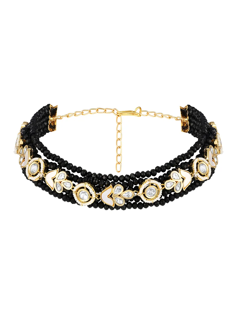 Introducing Black Agate Kundan Polki Choker Necklace with Pearl and Mother of Pearl, a bold handcrafted design set in micron gold polished brass. Adorned with shimmering moissanite kundan polki, deep black agate strands, lustrous pearls, and elegant mother of pearl accents, this choker brings dramatic sophistication to weddings, festive occasions, and evening celebrations.
