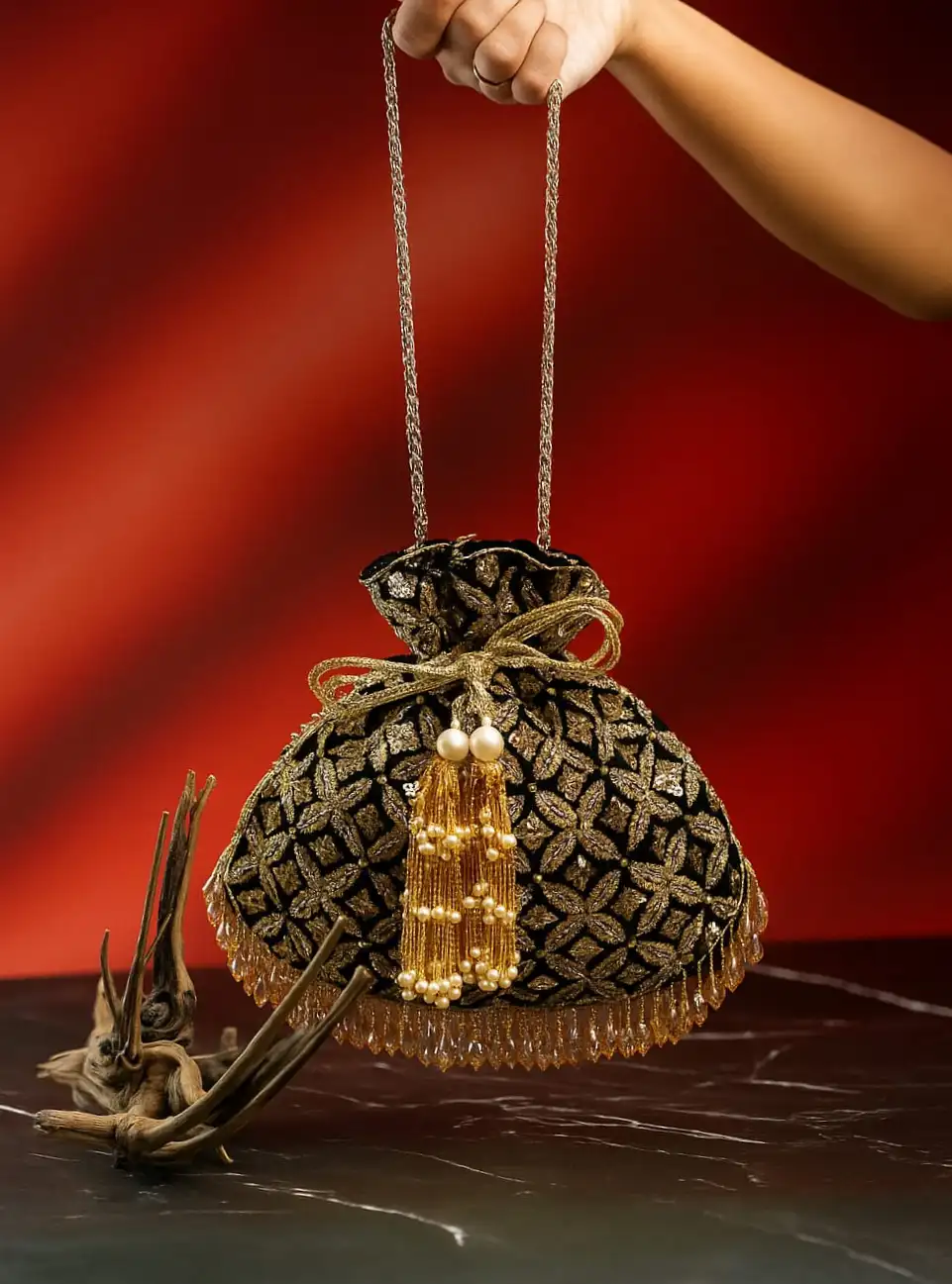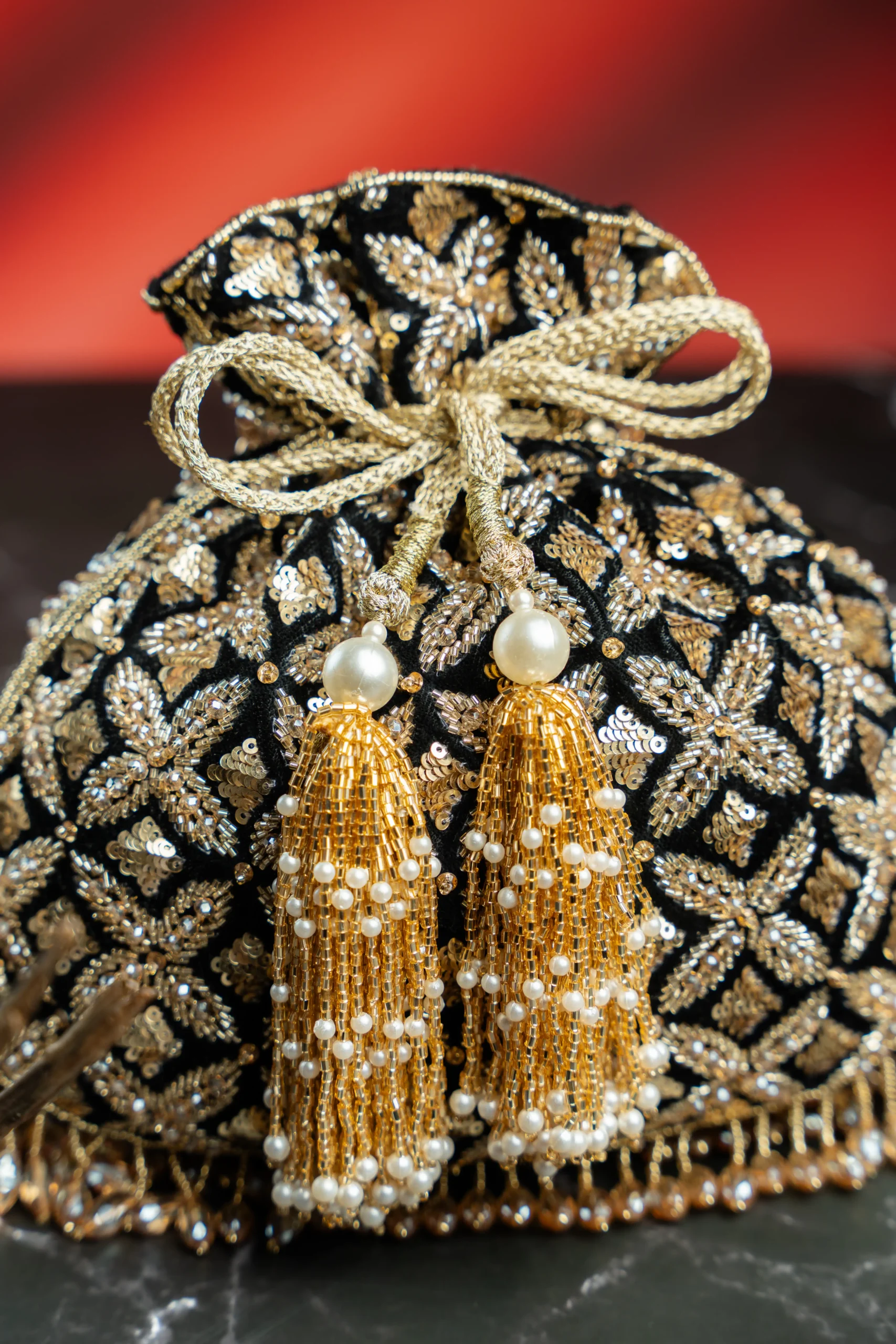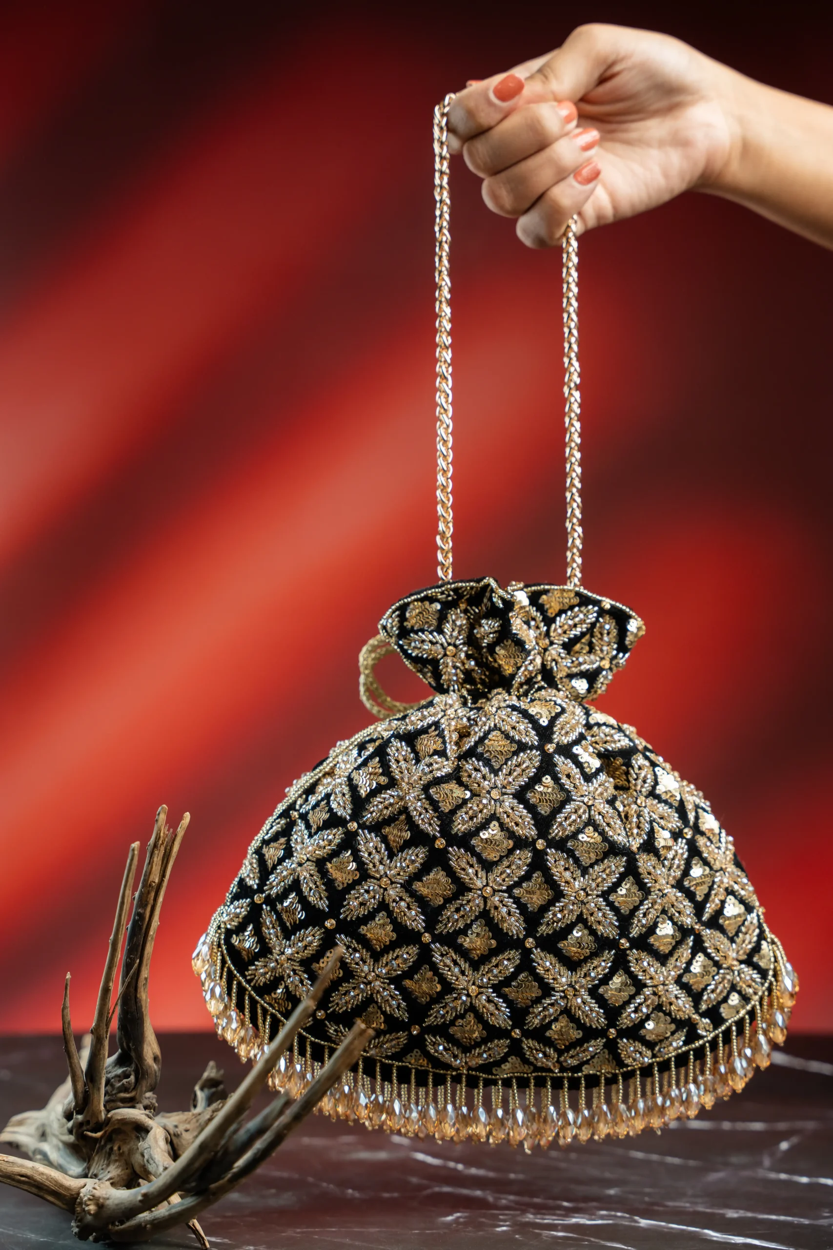 Black & Antique Gold Velvet Potli with Hand Embroidery and Crystal Fringe