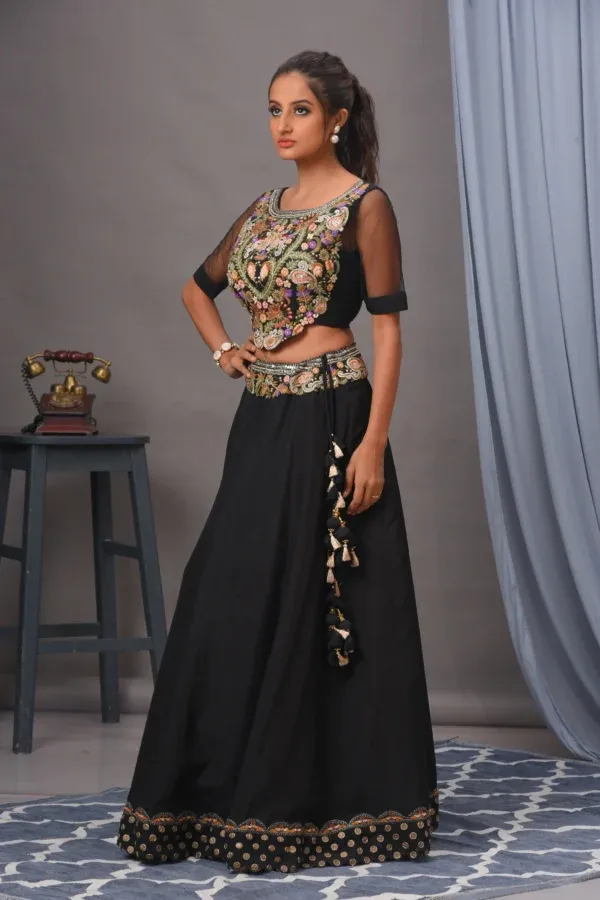 Introducing the epitome of elegance, a stunning black Bamberg silk lehenga, expertly adorned with exquisite multicolored embroidery at the waist. This beautiful piece is paired with a cotton silk blouse featuring all-over intricate embroidery, creating a perfect blend of sophistication and style. Completing the look is a delicate organza dupatta, adding a graceful touch.