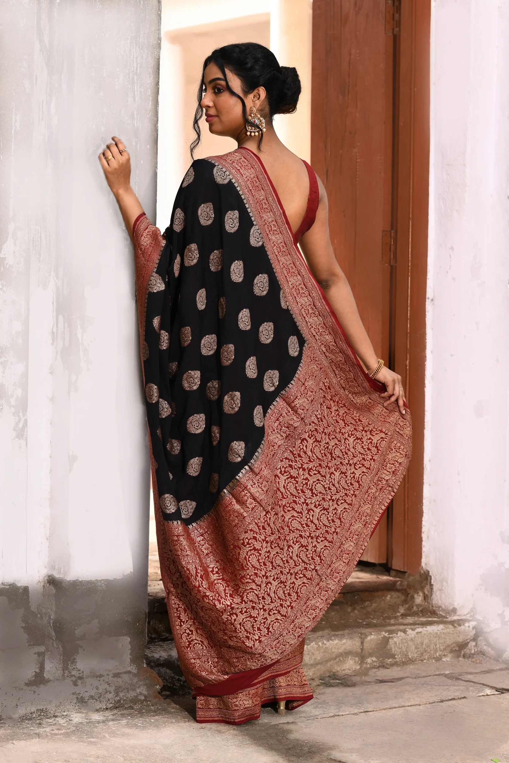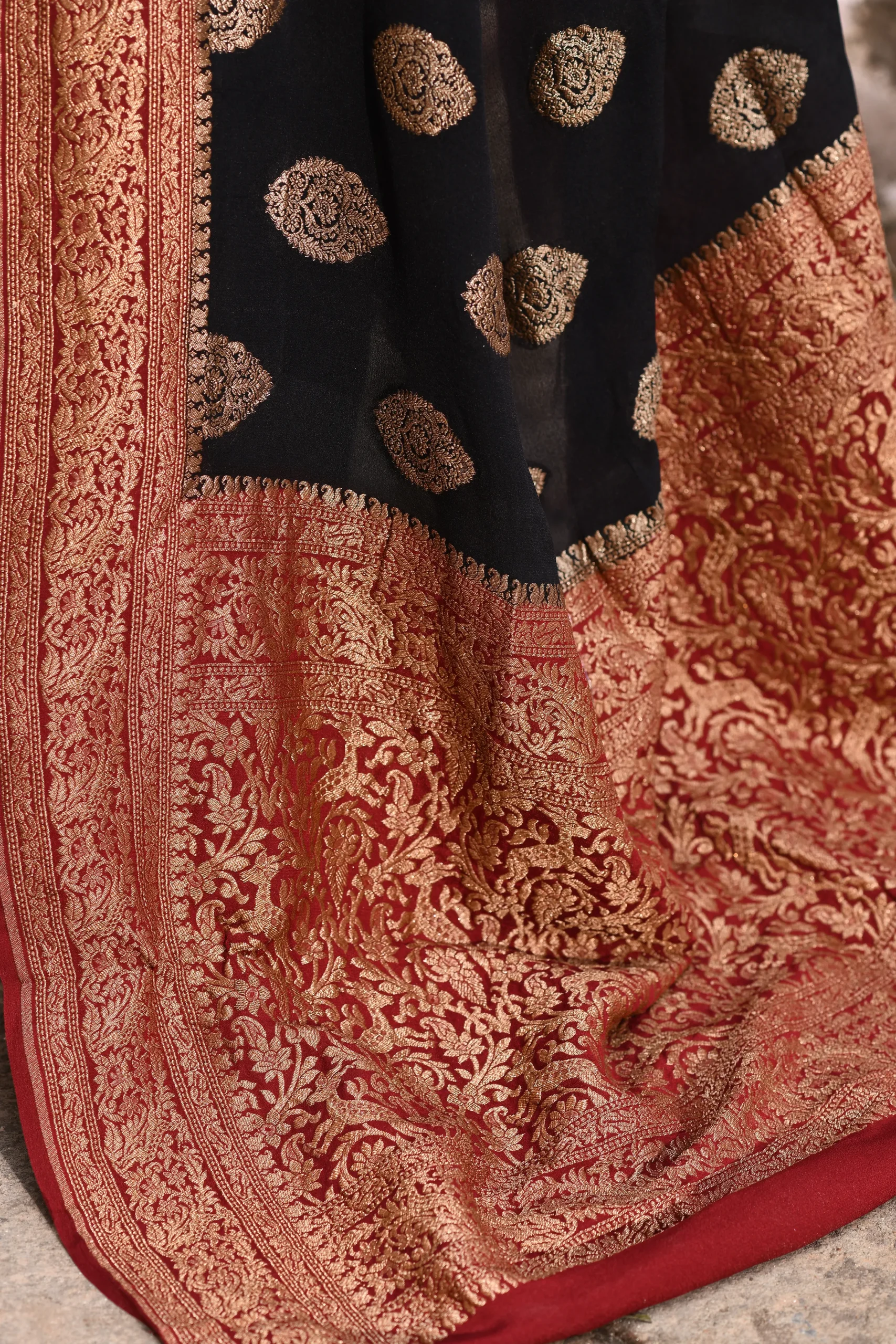 Black Banarasi Crepe Chiffon Silk Saree with Gold Zari Buta & Red Border