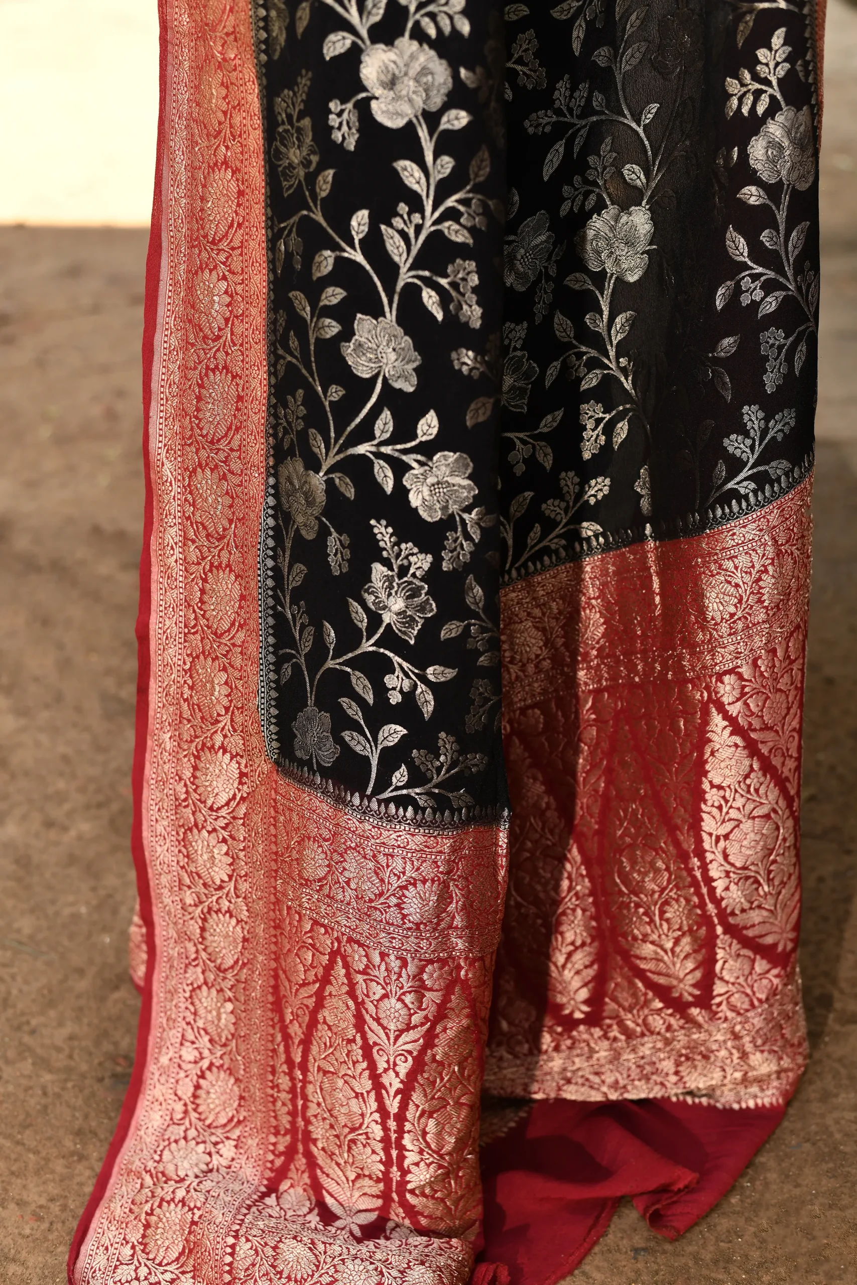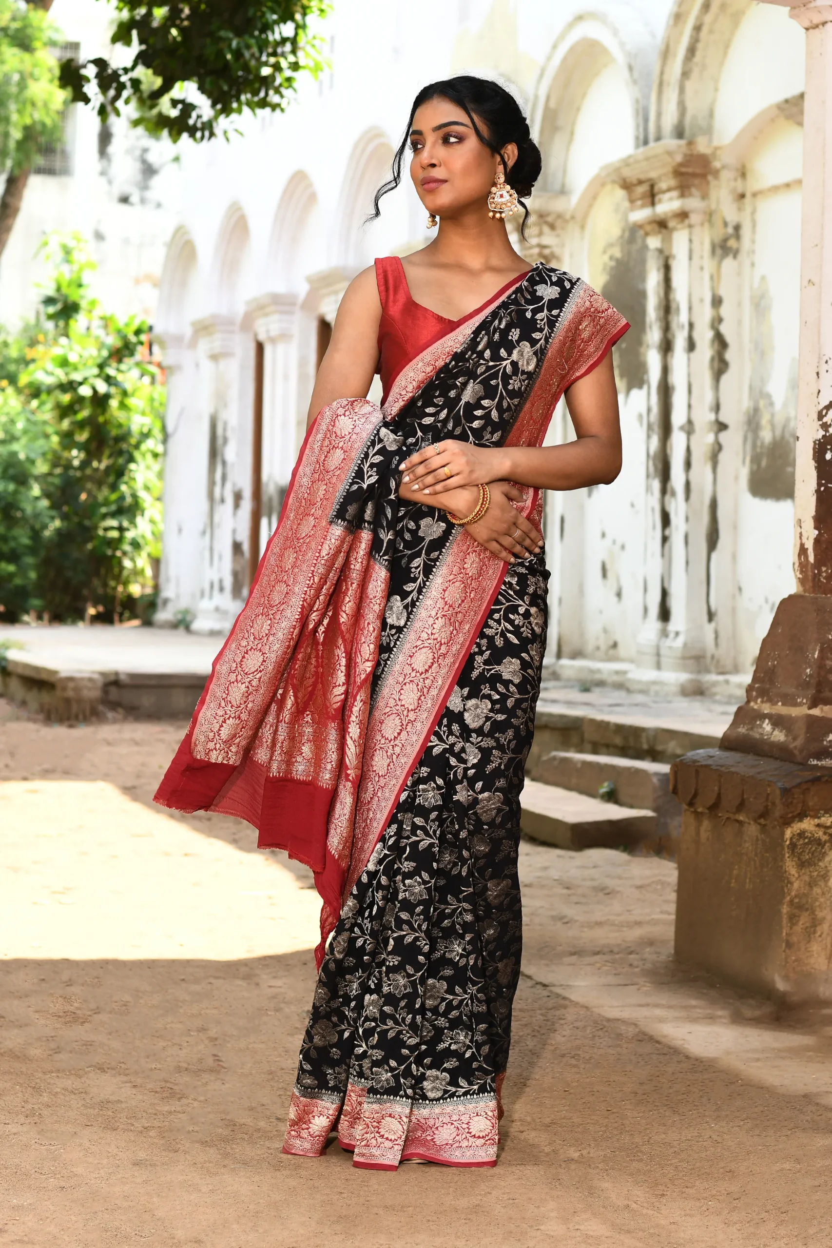 Pair with antique gold or temple jewellery and a brown or gold potli bag to complement the rich zari work.