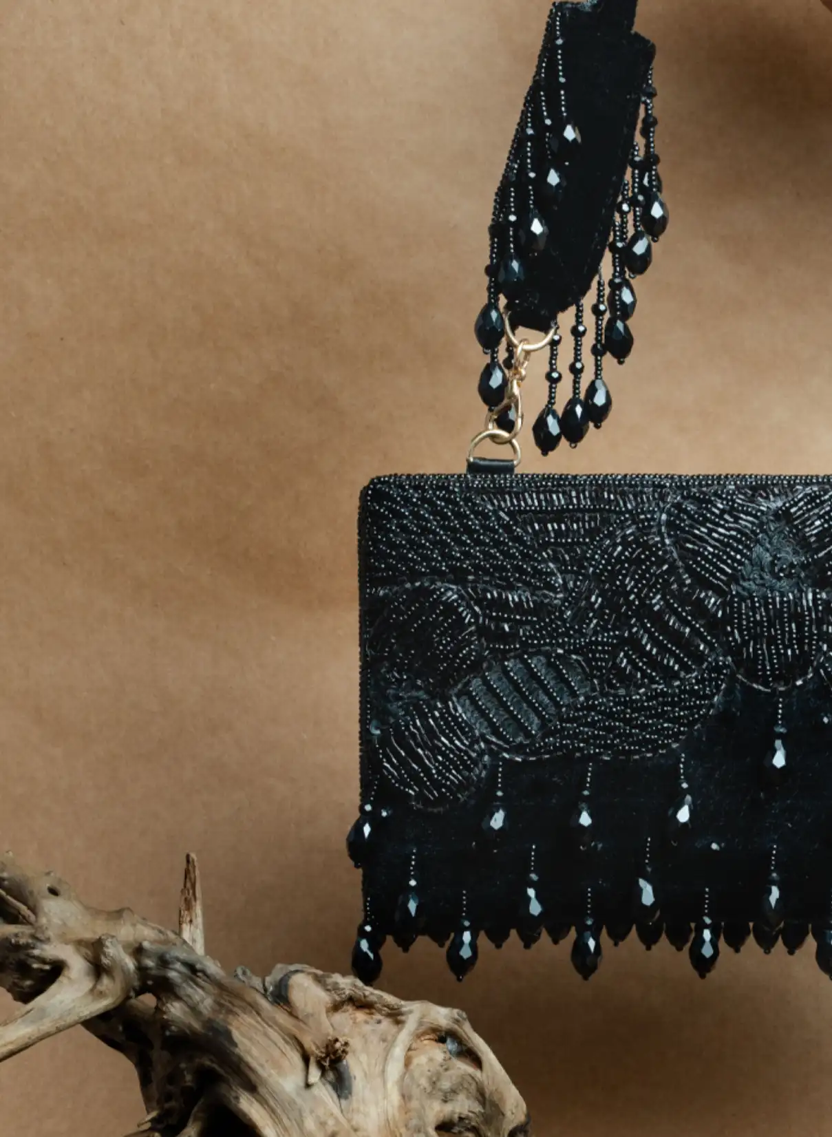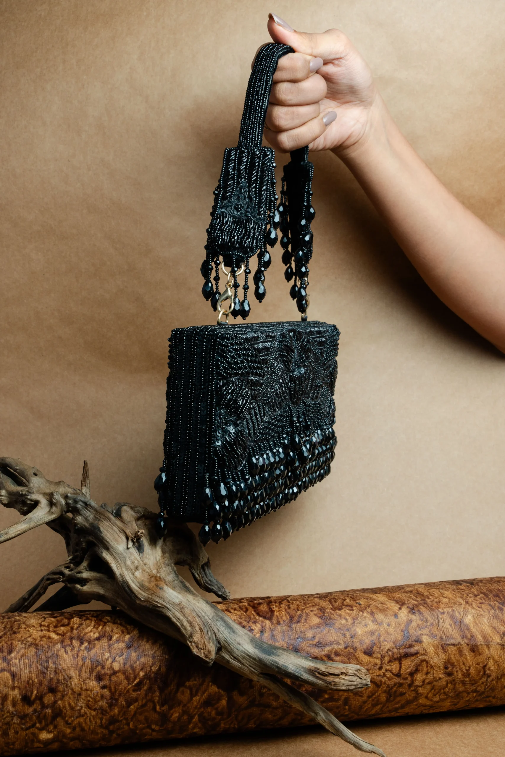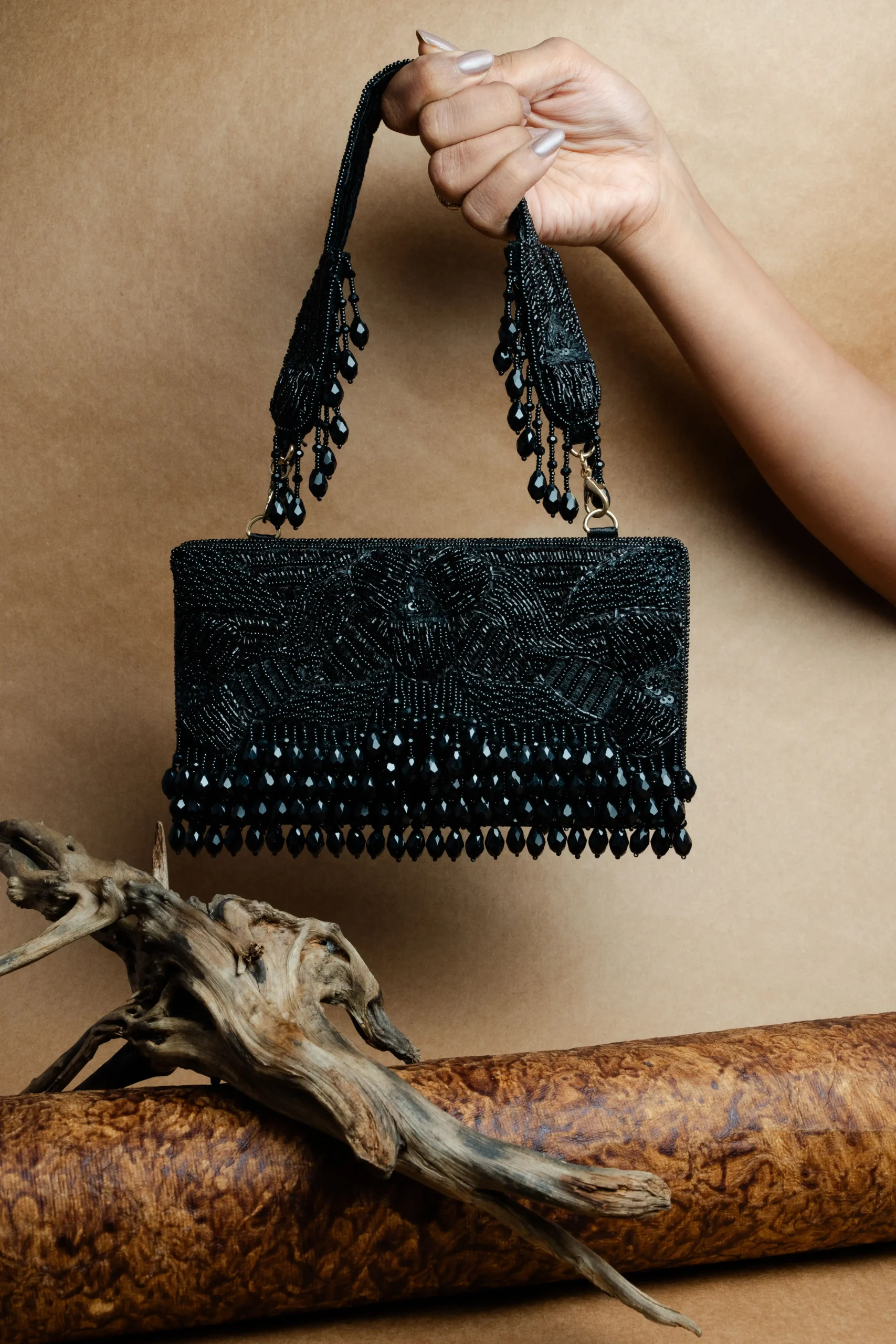 Black Beaded Box Clutch with Embellished Handle and Elegant Tassels