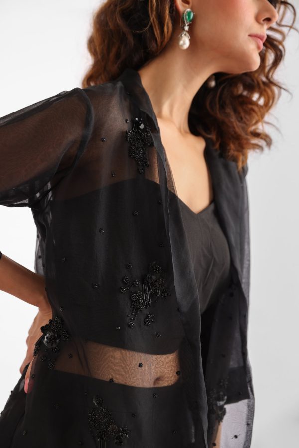 Step into sophistication with our “Black Beaded Organza Jacket Set.” This exquisite piece is adorned with intricate black beadwork, adding a touch of elegance to any ensemble. Versatile and timeless, it can be paired with a black inner and pants for a classic look, or styled with a variety of tunics for any occasion. Elevate your wardrobe with this sophisticated and exclusive addition that promises to make a statement wherever you go._x000D_