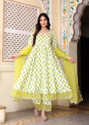 Golden Muslin pink cotton A-line kurta with inverted pleat, embroidered neckline and panels, bell sleeves, and scalloped hem, paired with straight pants and organza dupatta with scalloped edges.