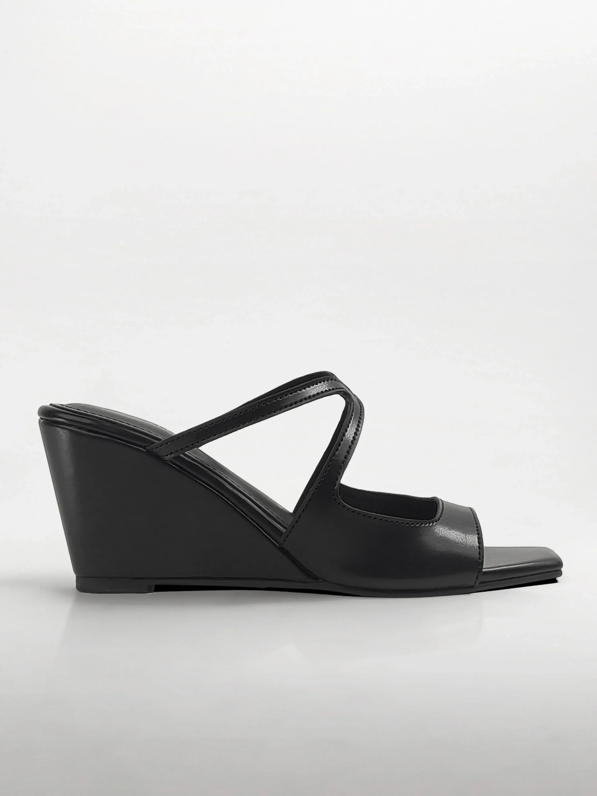 Featuring two thin diagonal straps forming an X cross with tonal construction in faux leather, this Black Cross-Strap Wedge Heel Mule offers clean modern appeal.