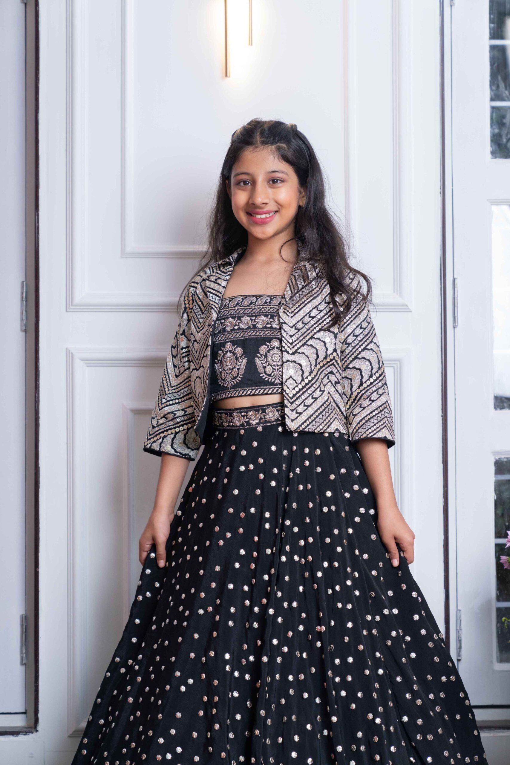 Showcasing our exquisite Black Embroidered Jacket Lehenga Set for Girls, a truly regal ensemble perfect for any grand celebration! The top is a chic, sleeveless crop blouse in striking black, adorned with intricate silver embroidery featuring beautiful floral motifs and geometric patterns, giving it a sophisticated and elegant appeal. It boasts a sleek, straight neckline with detailed borders, adding to its refined look. This stunning set also includes a matching embroidered jacket with three-quarter sleeves and a contemporary open front design. The jacket showcases striking silver embroidery in zigzag and geometric patterns, beautifully complementing the blouse and lehenga. It’s made from lightweight fabric, ensuring comfort and grace. The bottom is a voluminous, floor-length black lehenga, dazzling with scattered silver sequins and mirror work that add sparkle and glamour with every movement. Its flared silhouette is enhanced with a can-can lining for structure, making it perfect for twirling and grand entrances. The waistband is also intricately embroidered to perfectly match the blouse, ensuring a cohesive and breathtaking look.