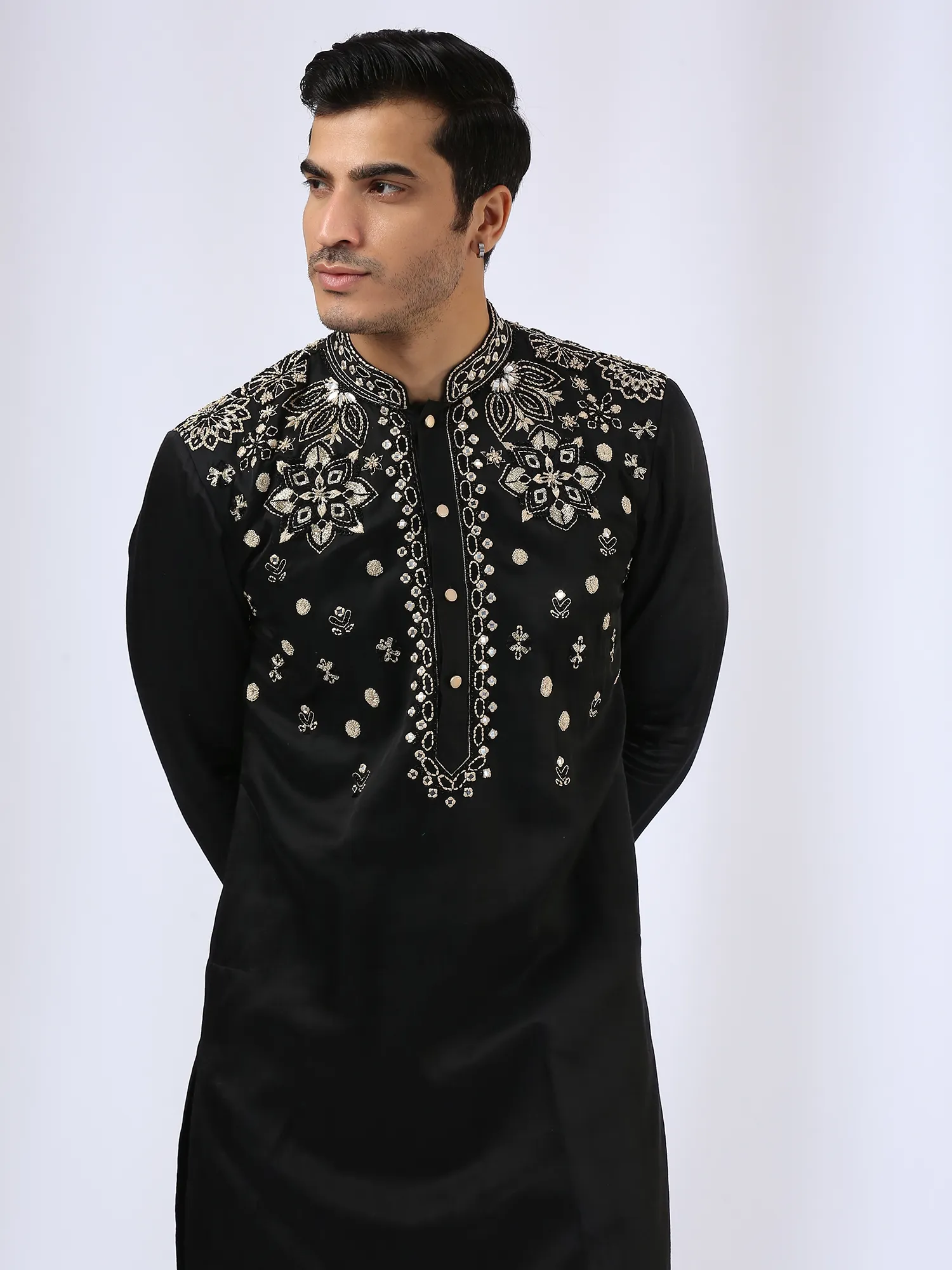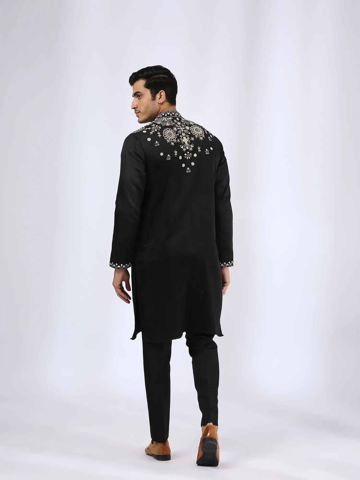 Introducing a black kurta set crafted in satin linen, featuring intricate threadwork embroidery across the shoulder, collar, placket, back, and sleeves. Paired with matching narrow pants, this ensemble delivers a bold yet elegant look, blending traditional detailing with modern sophistication for festive and evening occasions.