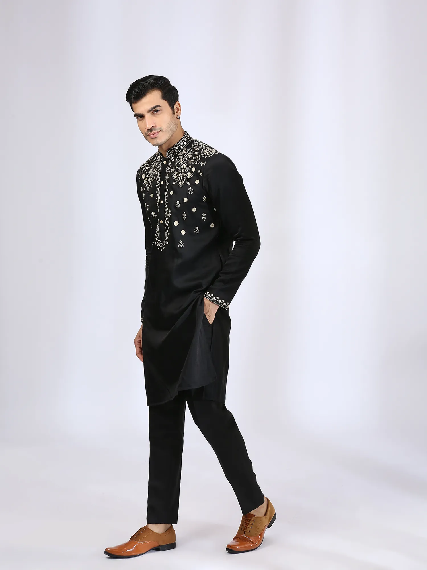 Black Embroidered Kurta teamed with matching narrow pants