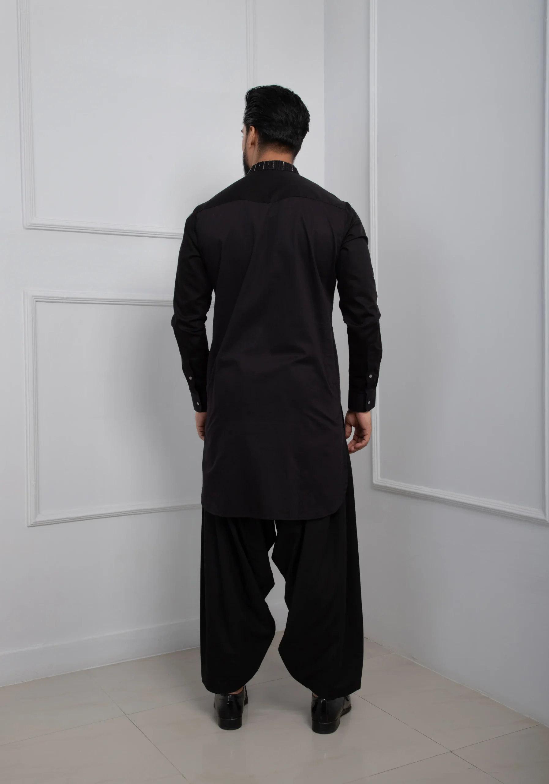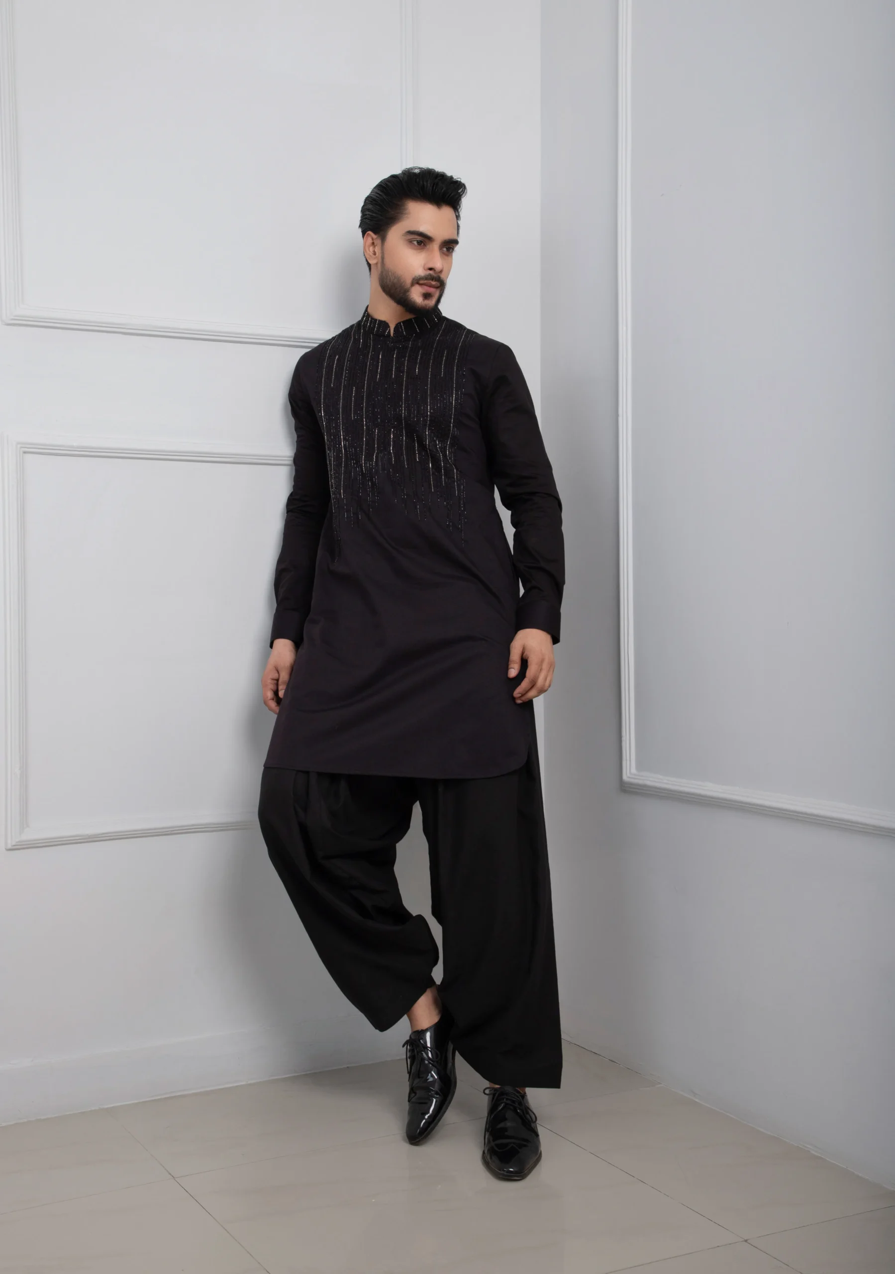 Introducing black embroidered pathani kurta set, an embodiment of timeless elegance and modern ethnic charm. Crafted from premium fabric, the black kurta features refined vertical stitch embroidery on the chest, adding depth to the silhouette. Paired with traditional voluminous black patiala-style salwar pants, this sophisticated ensemble is perfect for weddings, formal evenings, and elevated celebrations.