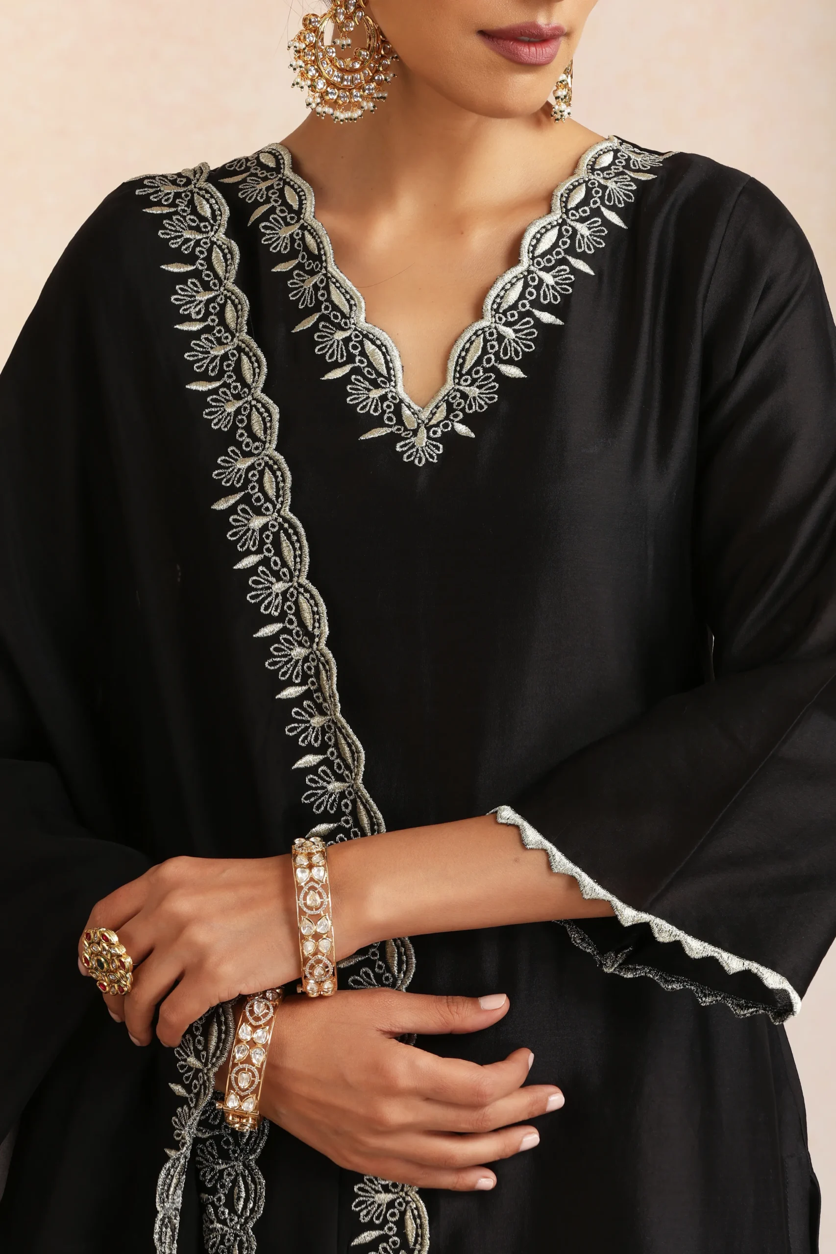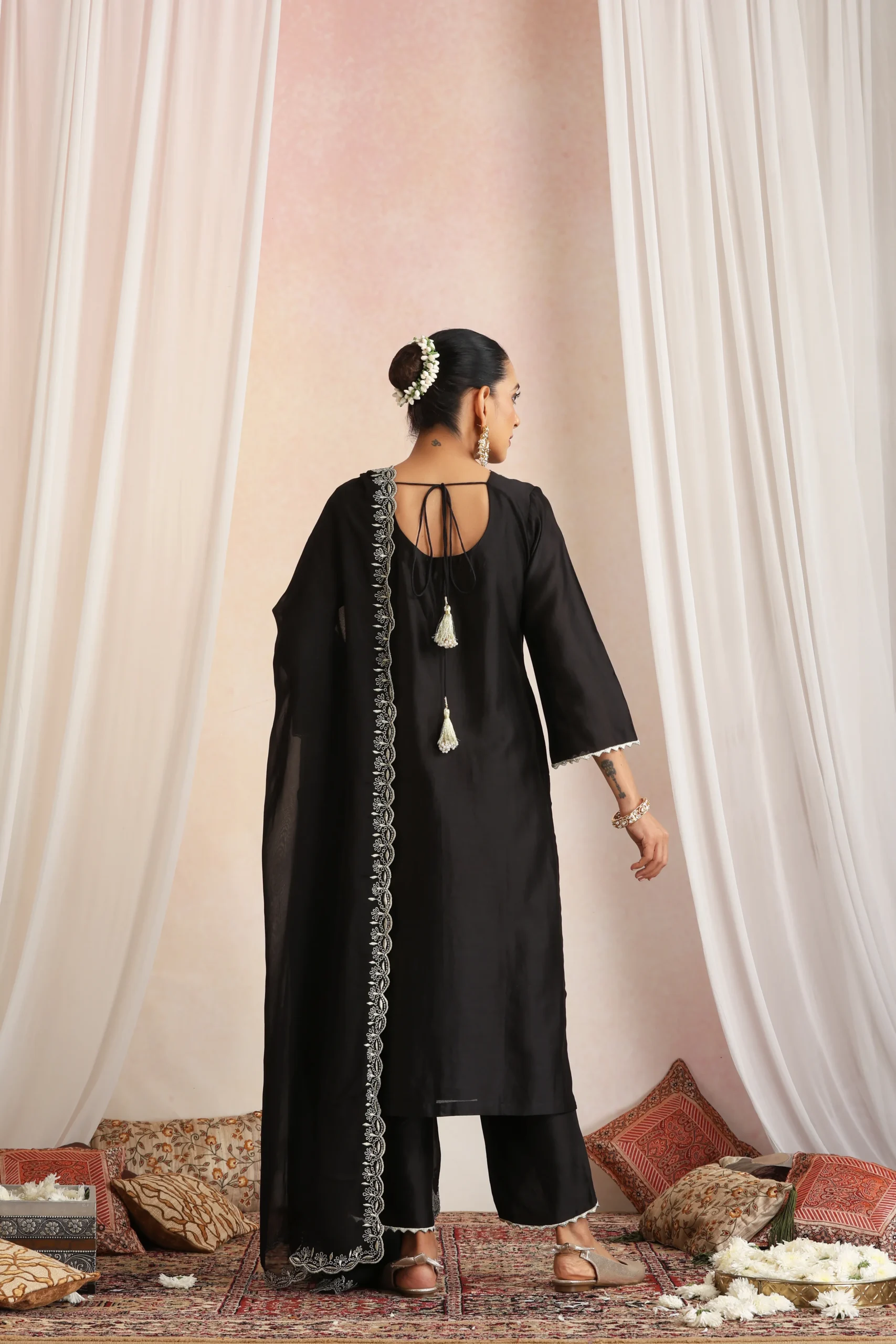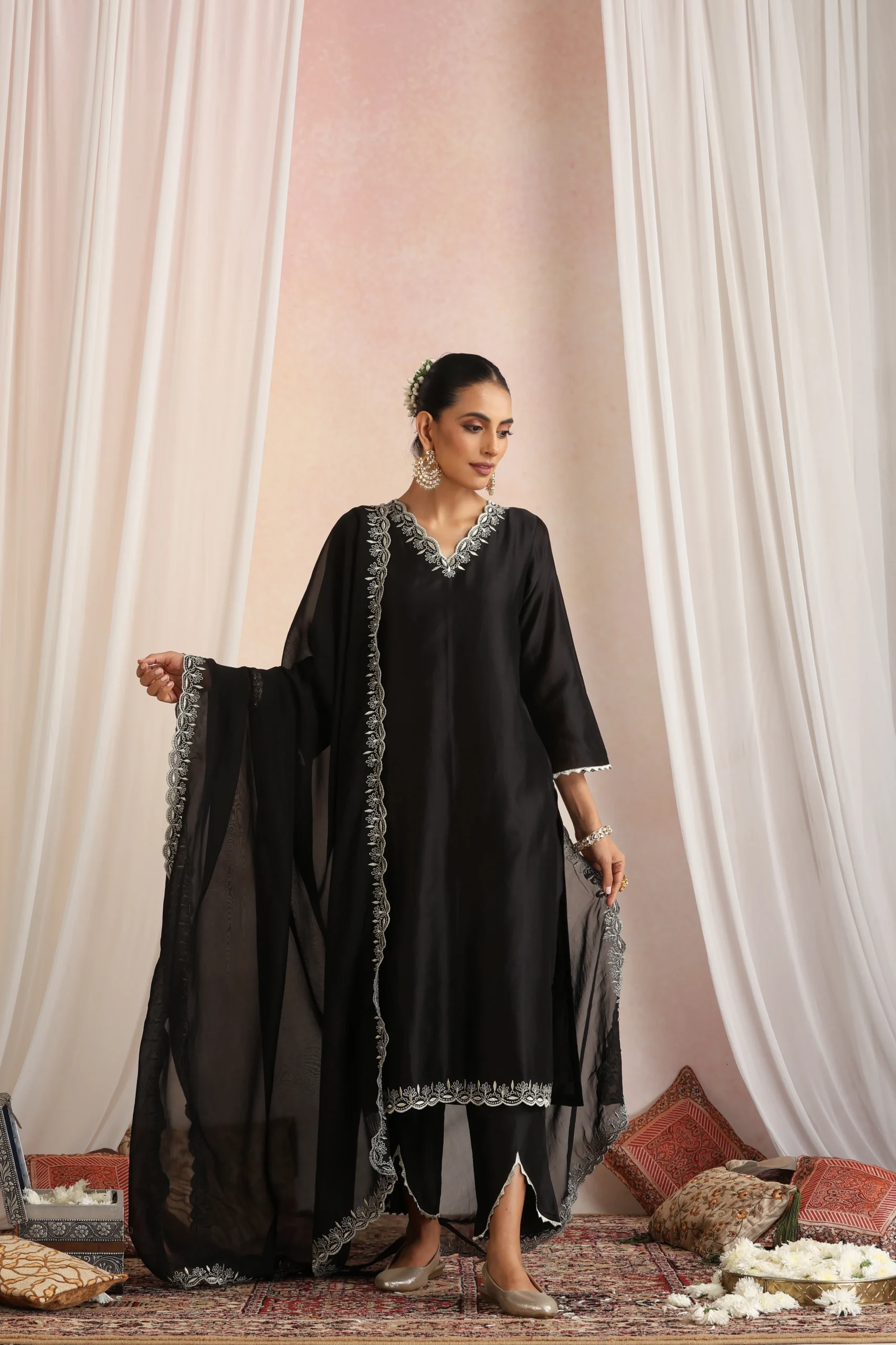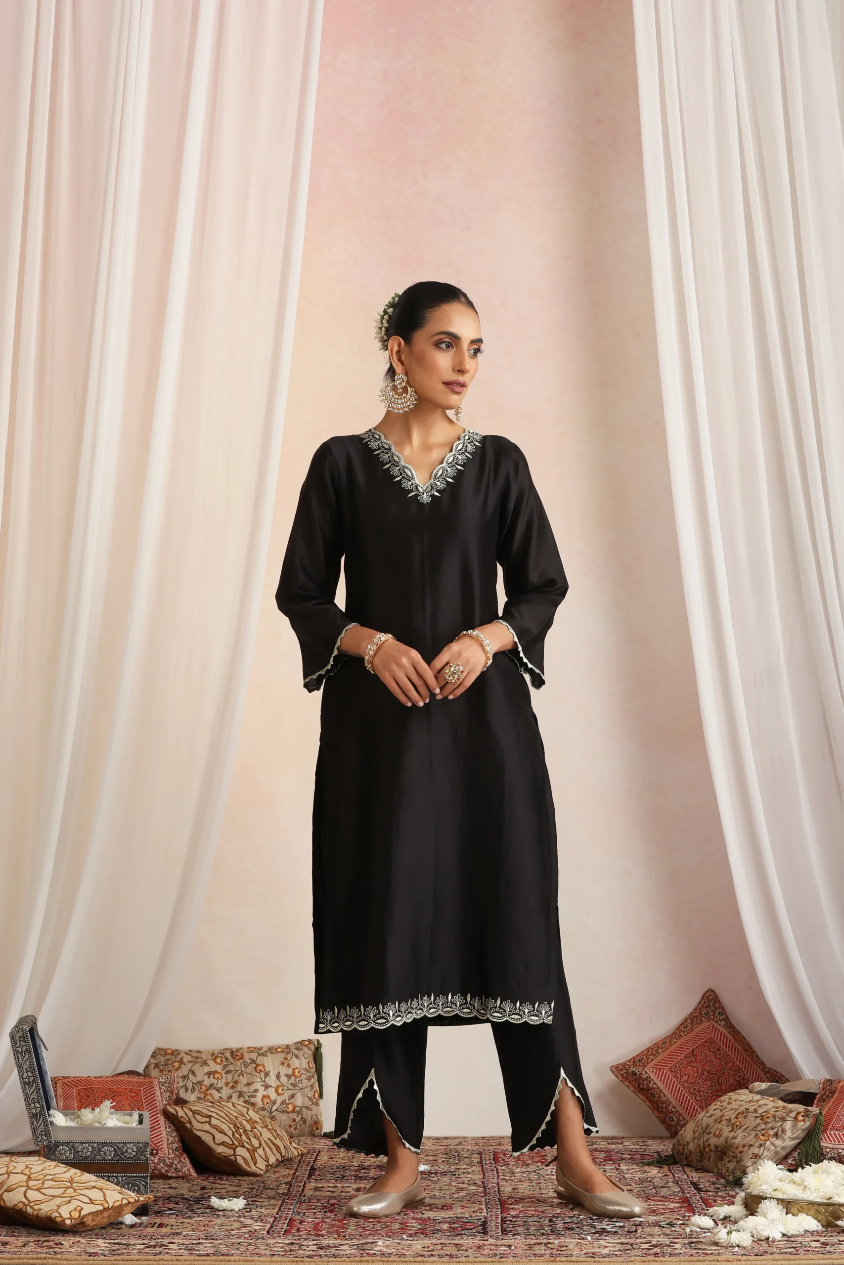 Style this elegant black kurta set with statement gold, oxidised silver, or stone-studded jewellery to enhance its classic and sophisticated appeal. Pair it with metallic gold or black heels, embellished sandals, or embroidered juttis for a polished ethnic look.