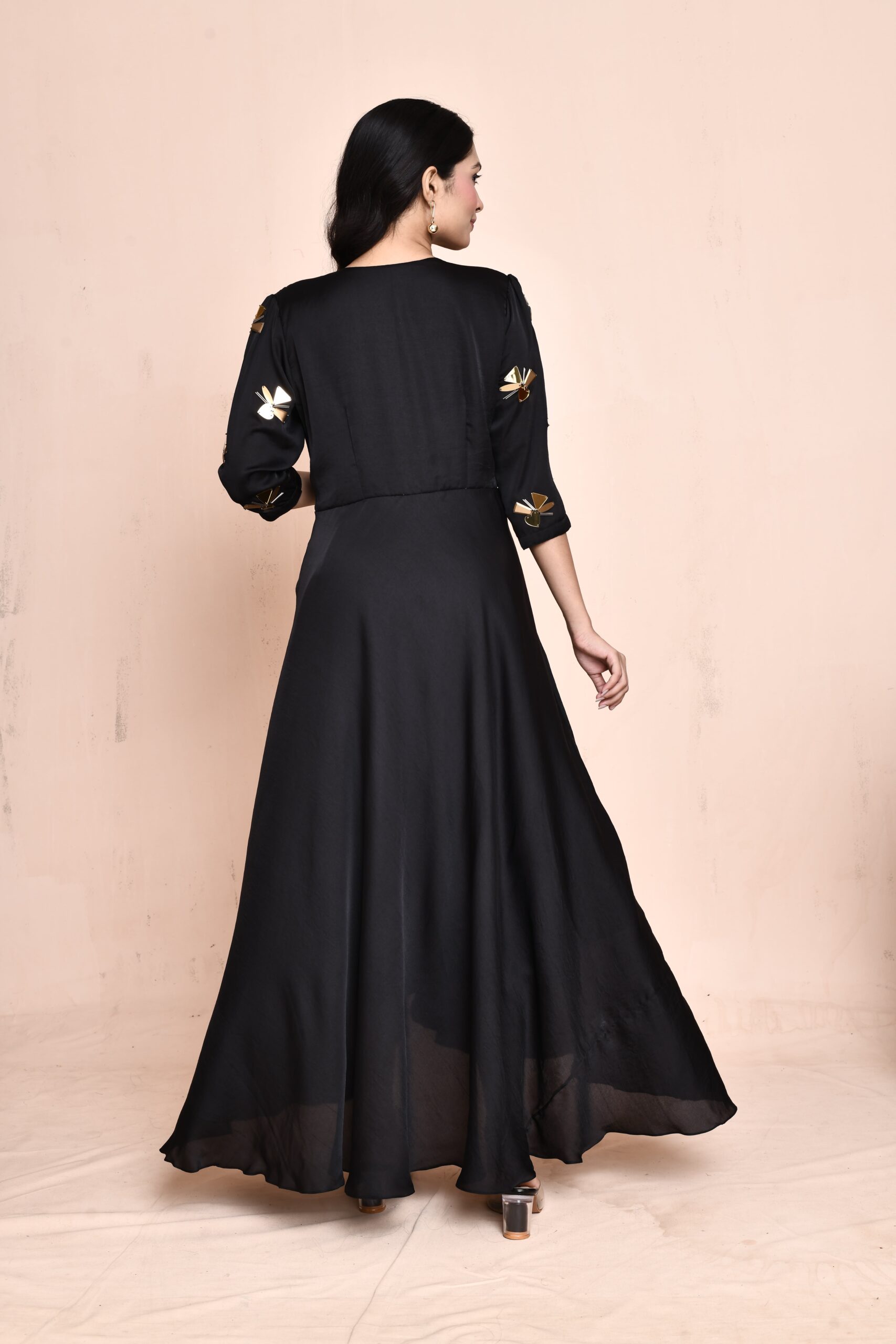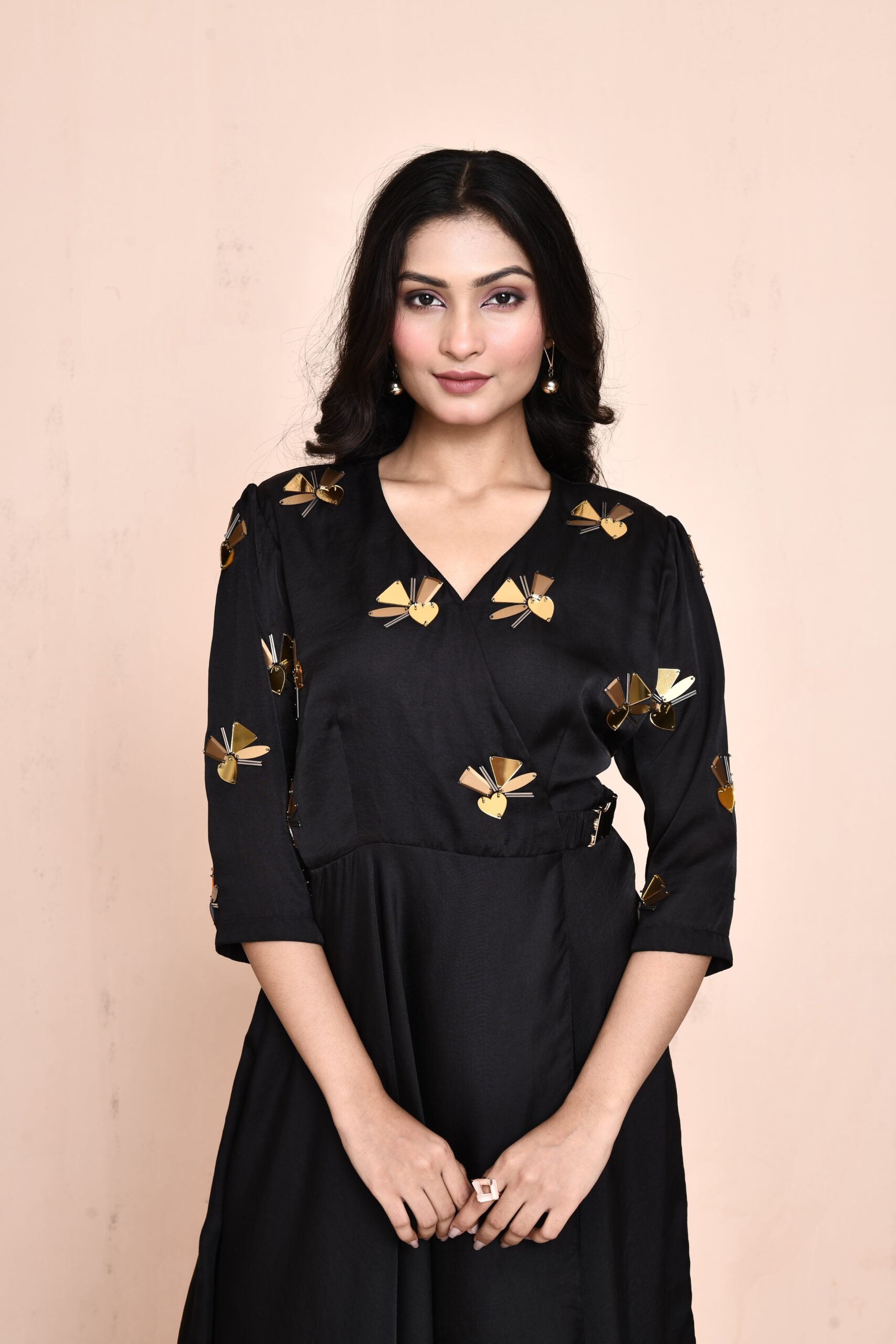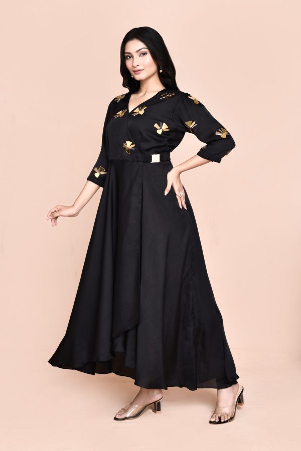 Featuring a stunning black flowy overlap design, this dress is the epitome of elegance. The flattering V-neckline is beautifully complemented by golden buckle detailing on the side and exquisite chunky handwork, making it a statement piece for any occasion. Crafted to drape effortlessly, this dress ensures both comfort and sophistication.