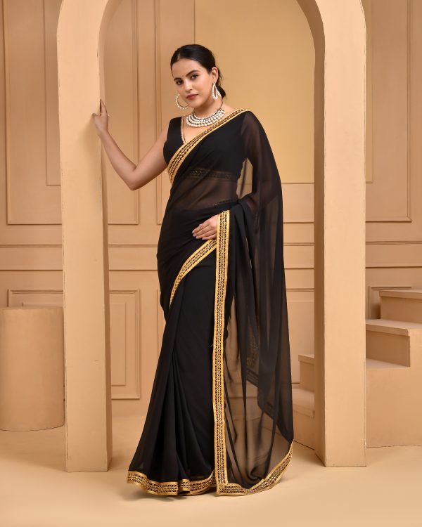 Introducing a timeless black georgette saree that embodies fluid elegance and refined sophistication. Crafted in smooth, lightweight georgette, it drapes effortlessly for a graceful silhouette. Enhanced with intricate lace work borders, the saree adds subtle detail and elevated charm, making it a versatile choice for celebrations, evening events, and formal occasions.