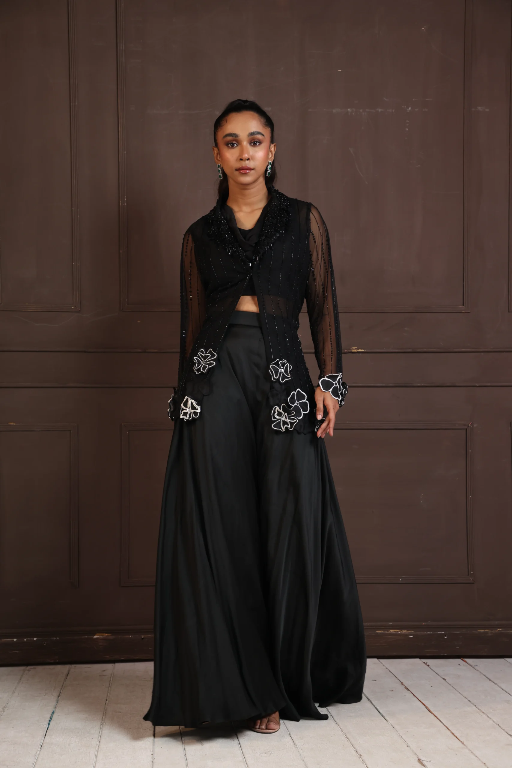 Introducing a bold monochromatic ensemble that redefines contemporary evening wear. Featuring a sheer-paneled bodice layered over a minimalist cropped base, it is paired with high-waisted, floor-sweeping palazzo trousers for dramatic movement. Intricate floral embellishments at the waist add refined elegance, making it perfect for modern formal occasions and high-profile events.