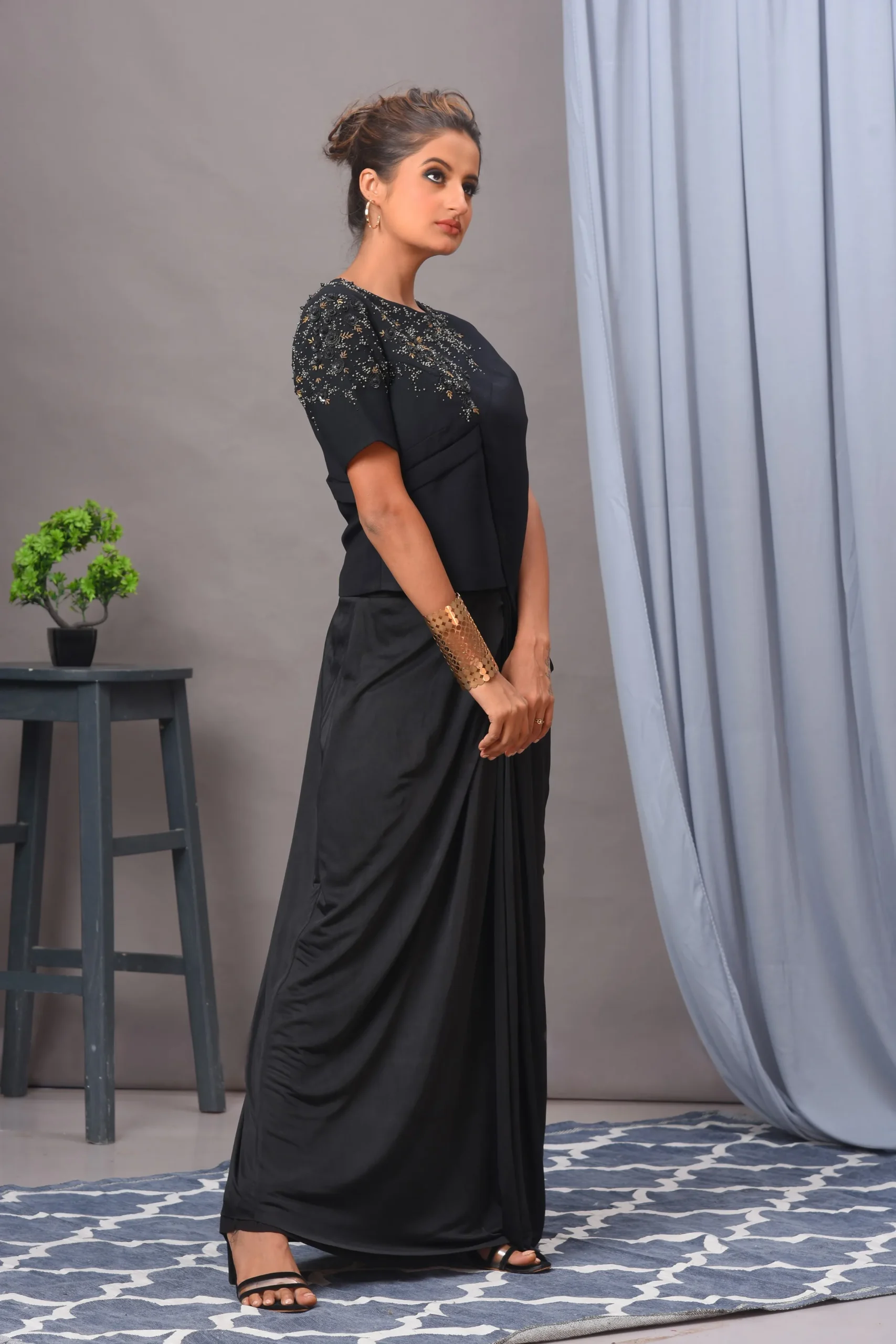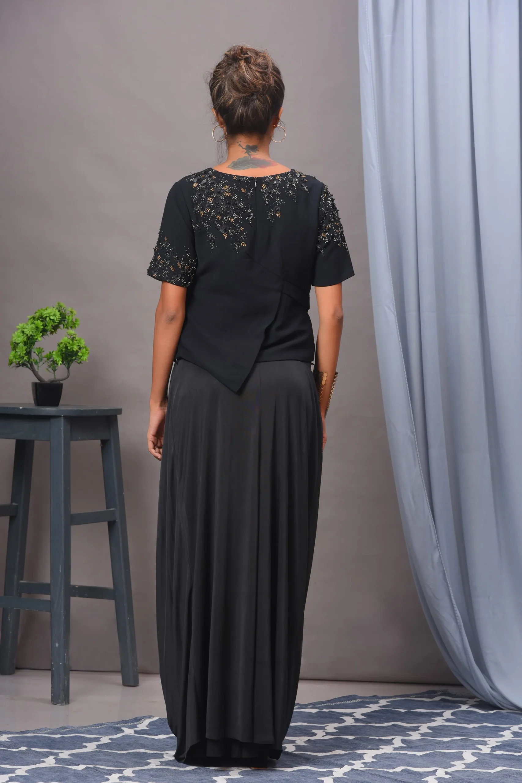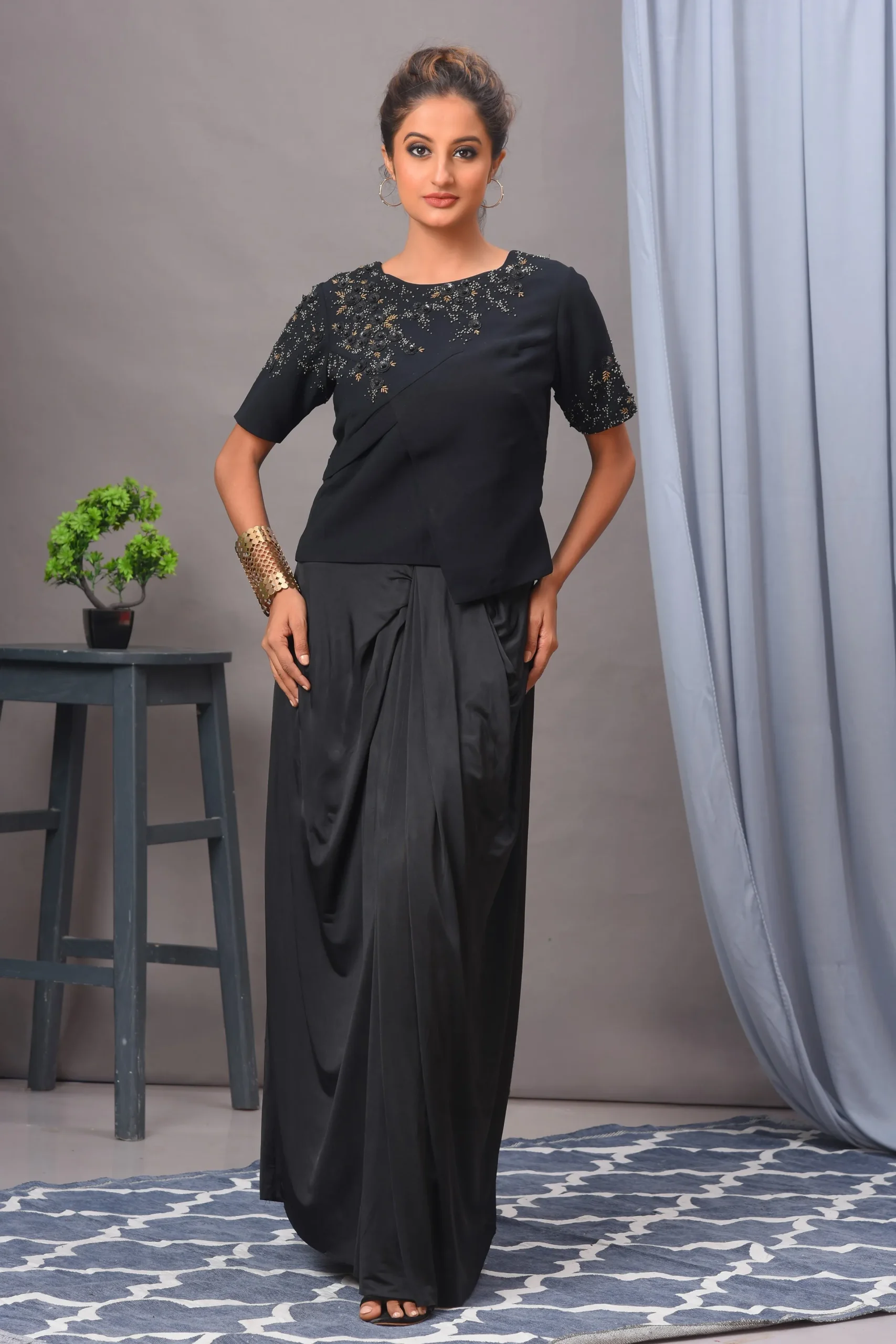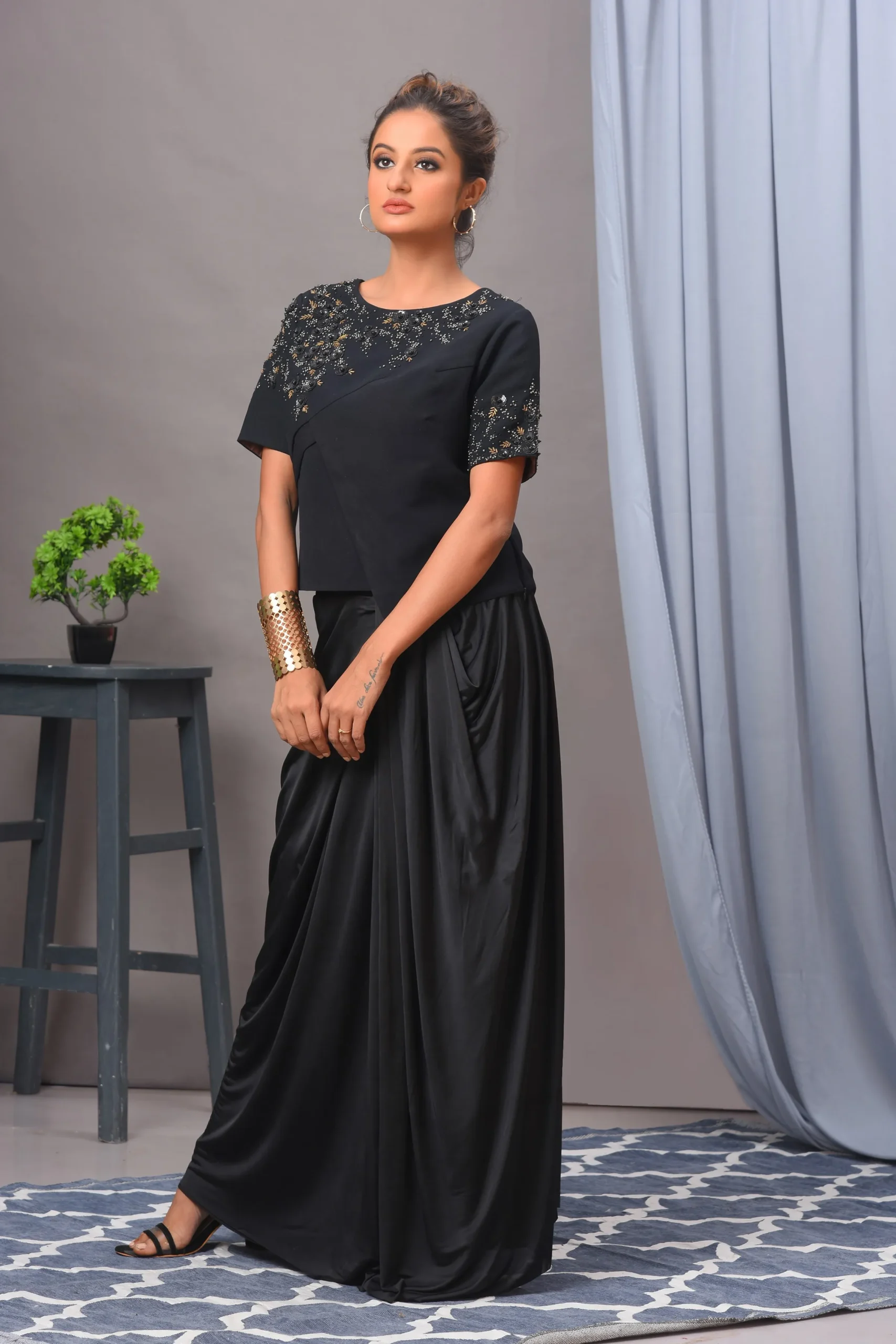 Embrace the versatility and sophistication of this outfit, and make a statement wherever you go! This chic Indo-Western black set is perfect for a variety of occasions, including: dinner dates, cocktail, festive celebrations, parties. Opt for statement jewellery, sleek clutch and strappy heels, you’ll be ready to make a memorable impression at any event!