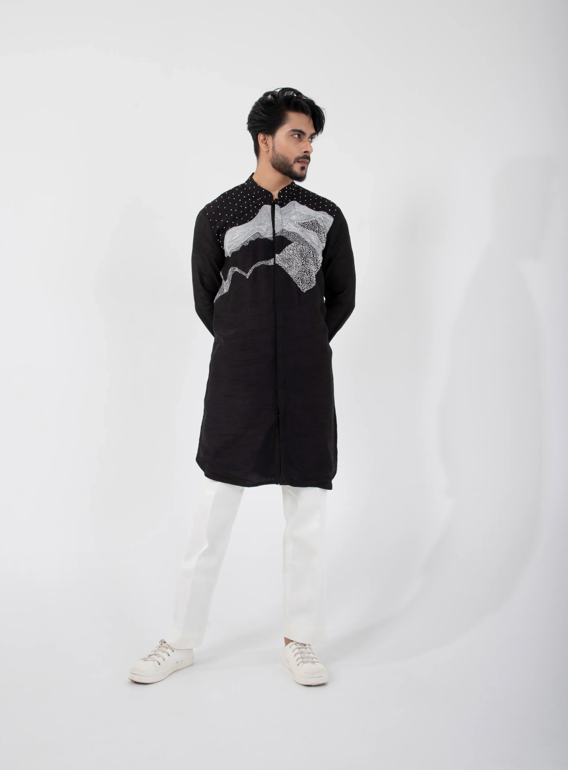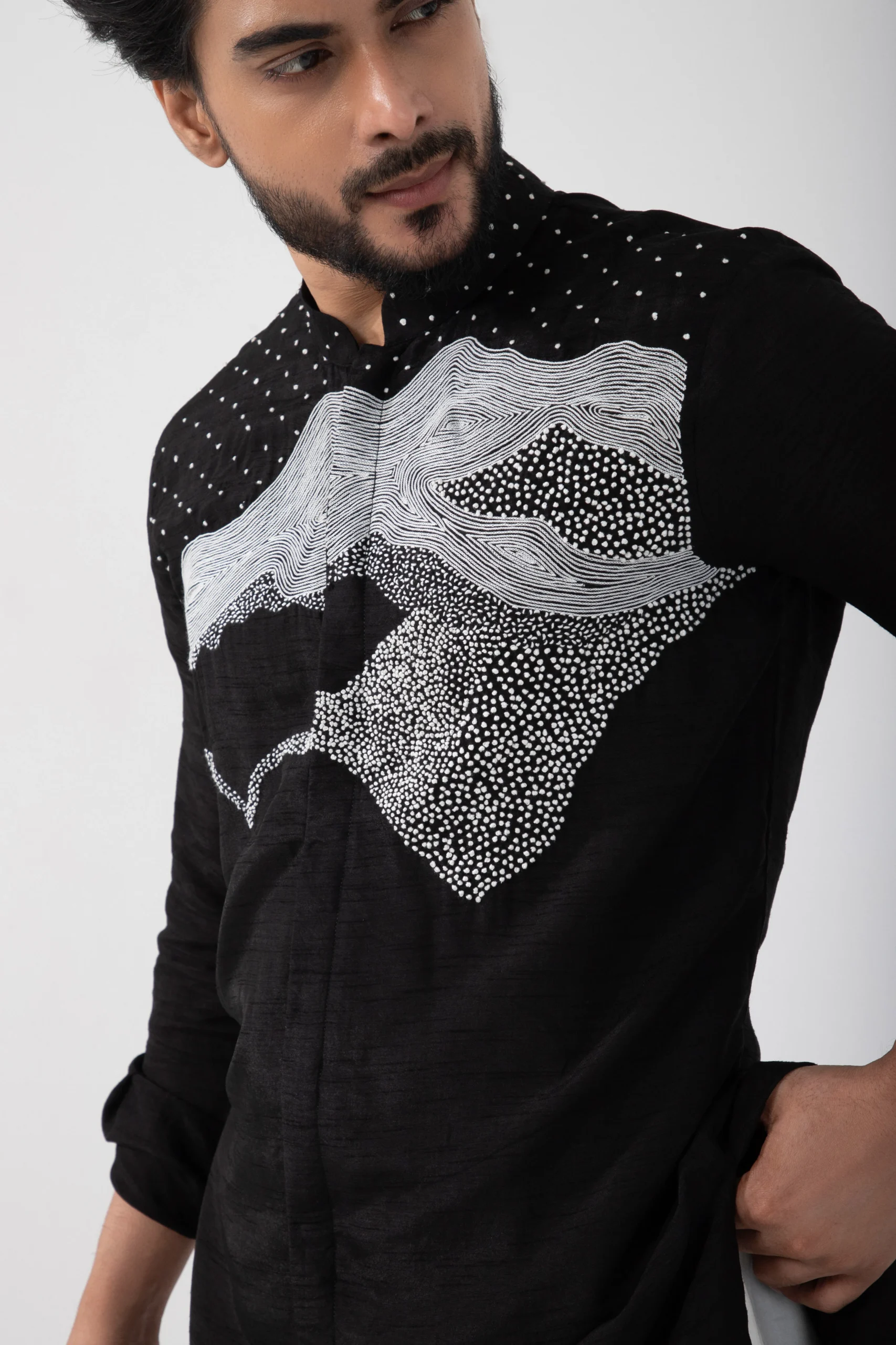 Introducing this striking black designer kurta based in khadi, cotton, where traditional craftsmanship meets avant-garde art. Featuring a bold, marble-textured chest panel and intricate dot-patterned shoulders, this piece is a masterclass in monochrome contrast. Designed for the man who dares to stand out, it’s the ultimate statement for any high-profile event.