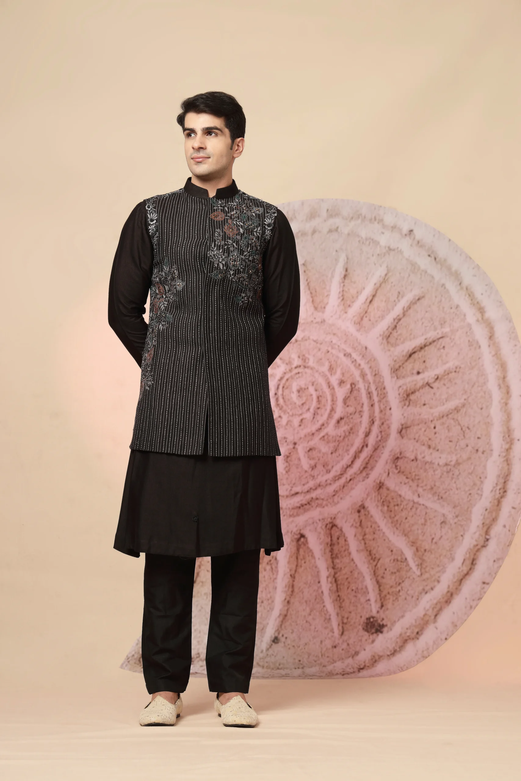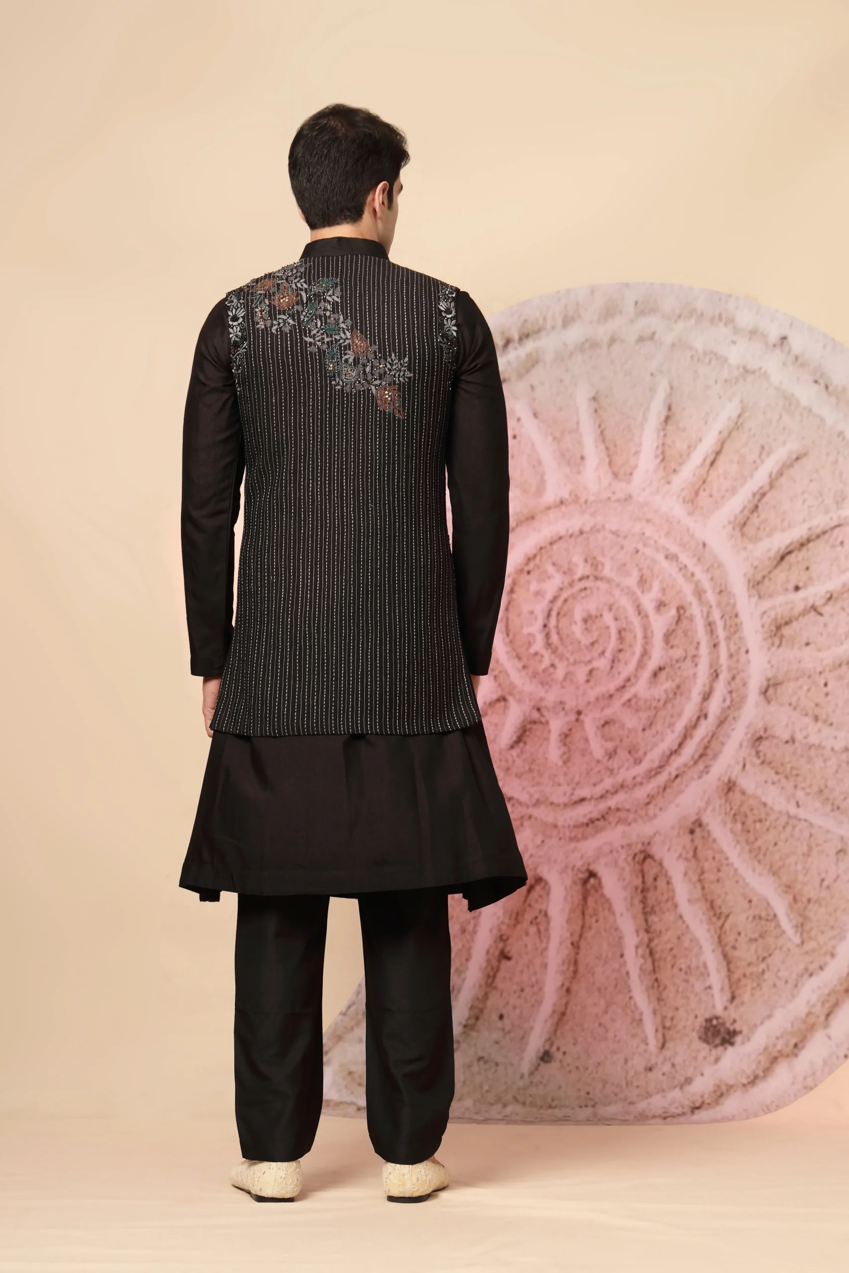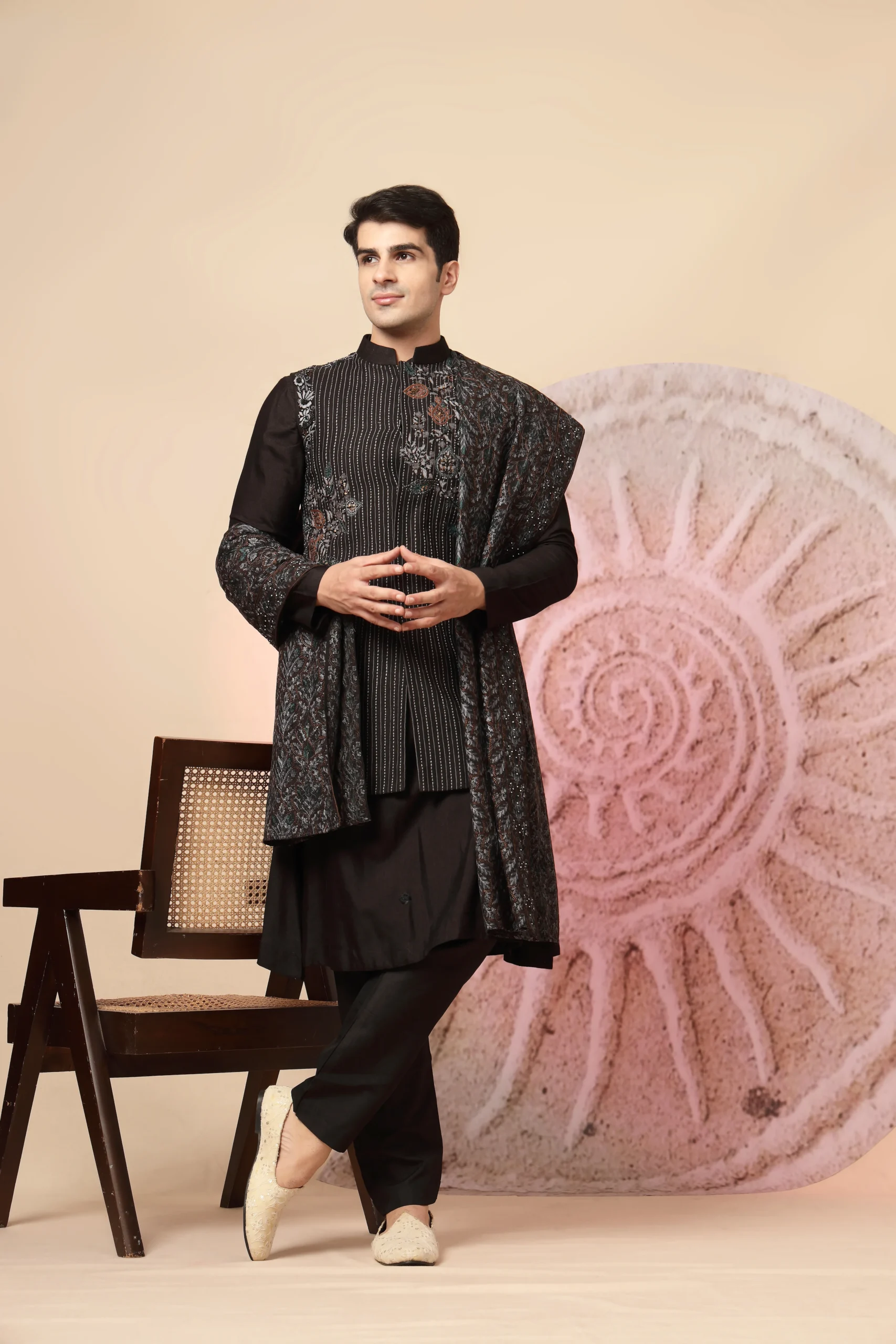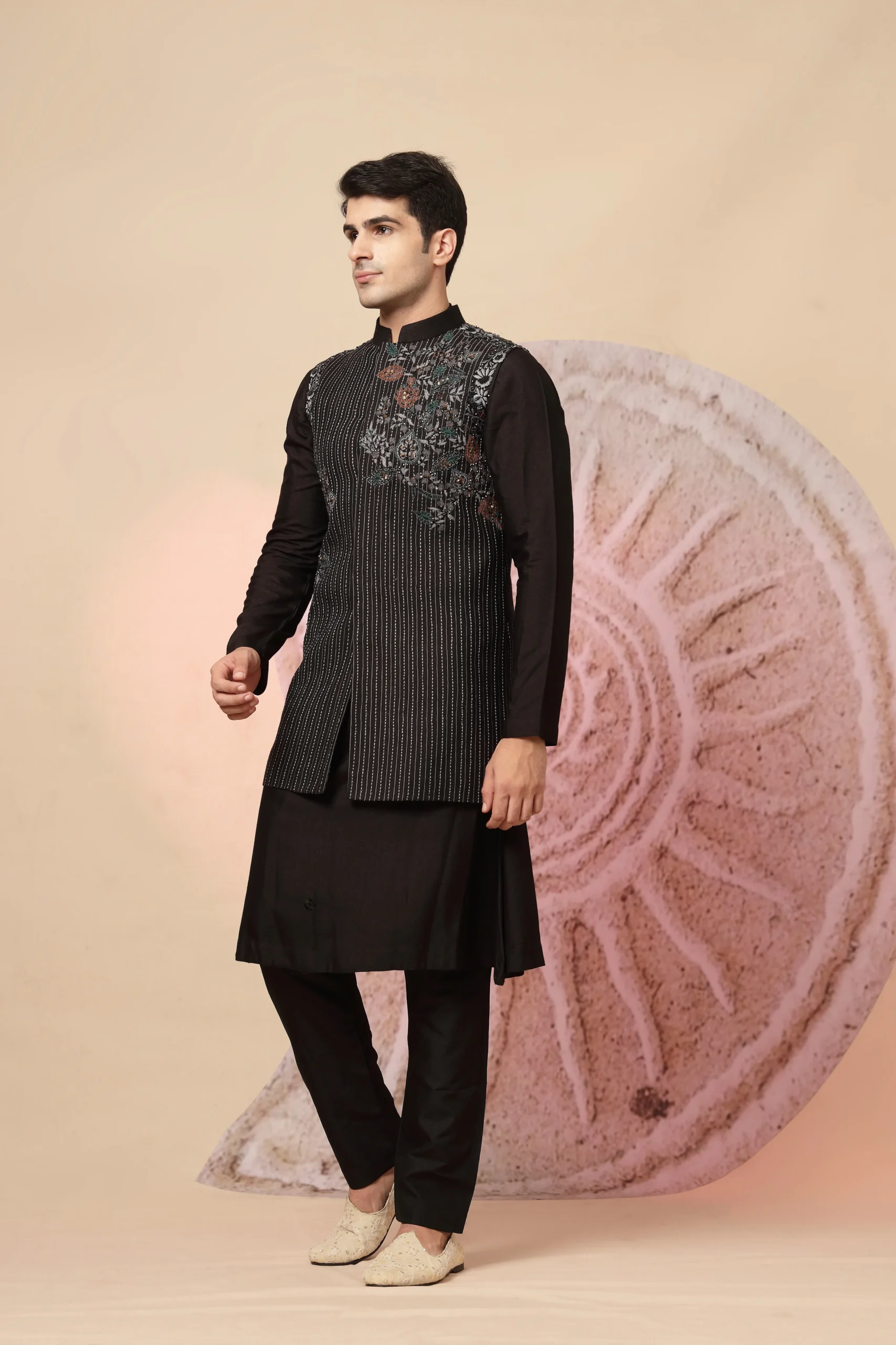 Introducing a refined black ethnic ensemble crafted for timeless elegance. Featuring a sleek black kurta paired with matching trousers, the look is elevated by a finely tailored waistcoat adorned with vertical pinstripes and subtle floral embroidery in earthy tones. Completed with a patterned dupatta, this ensemble exudes regal sophistication perfect for weddings, festive occasions, and evening celebrations.