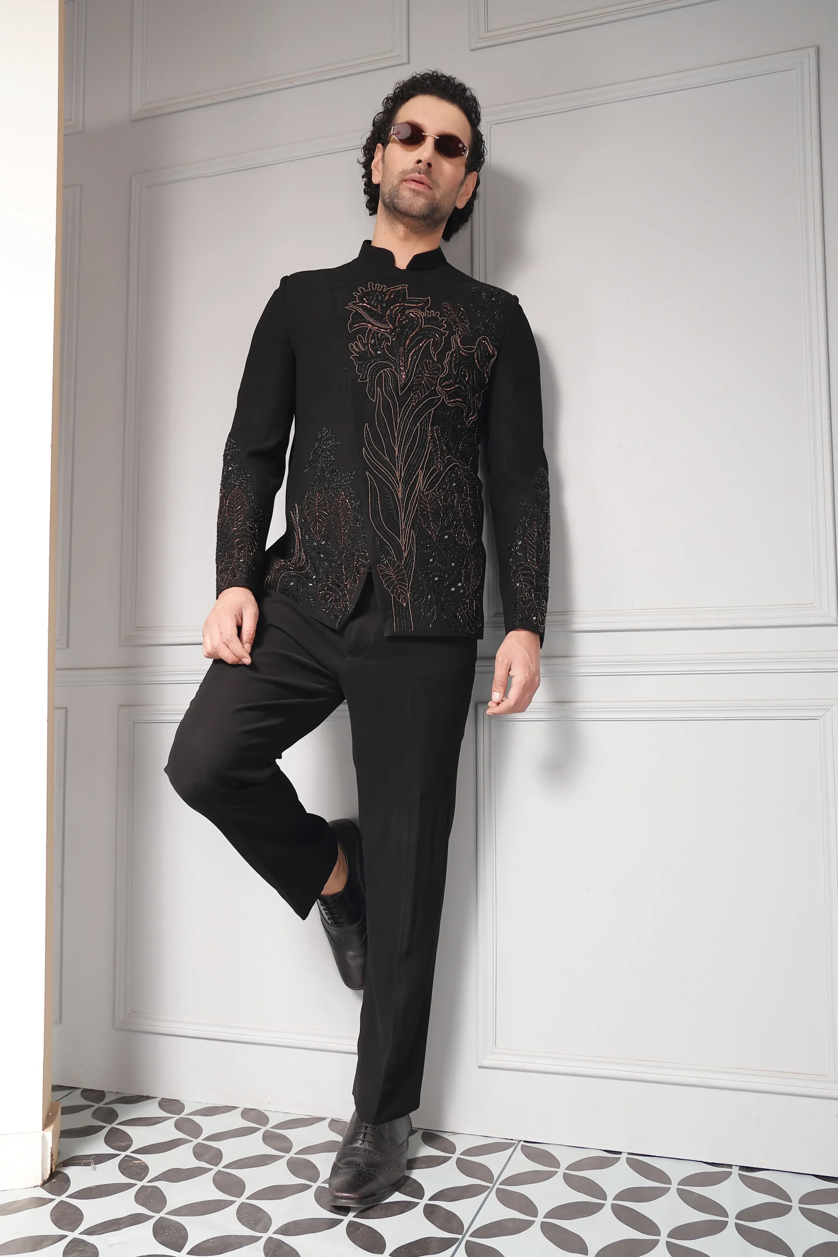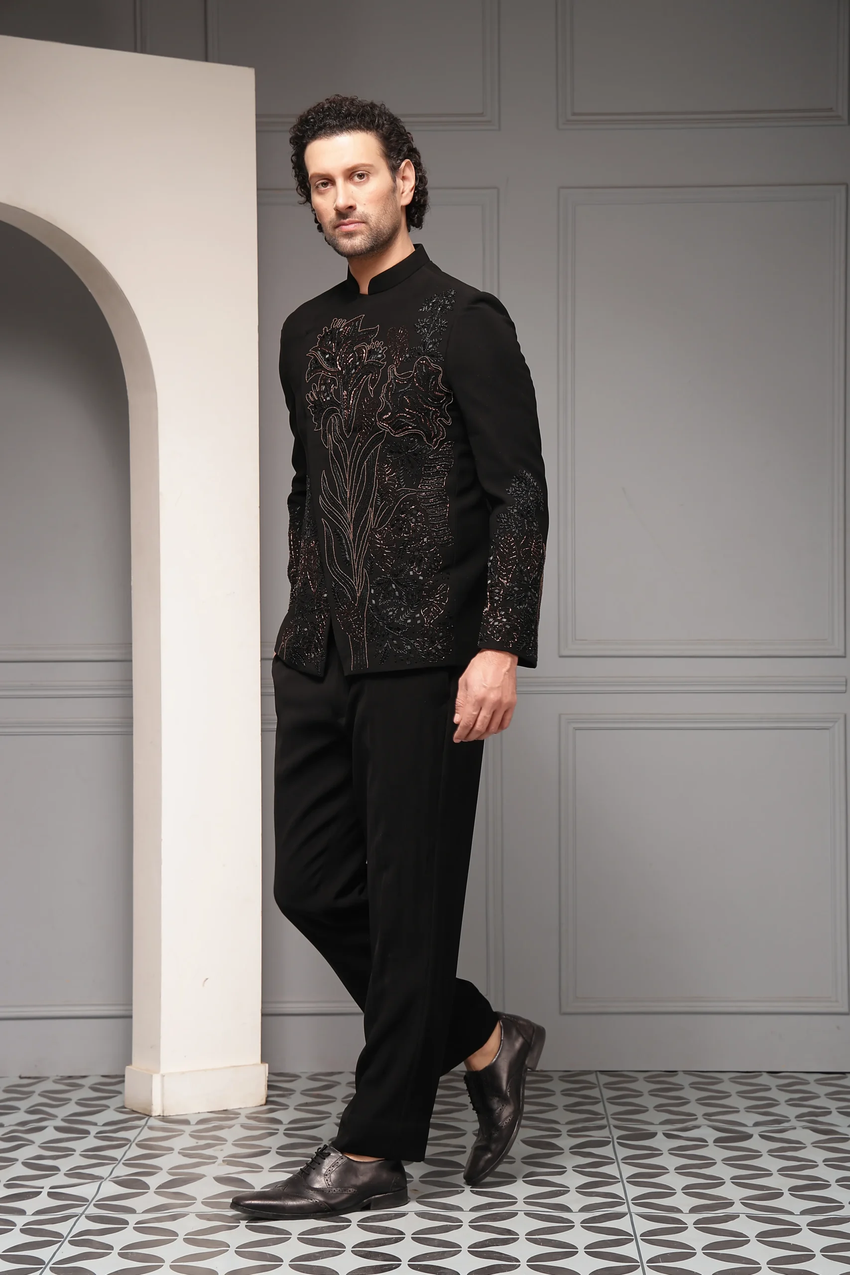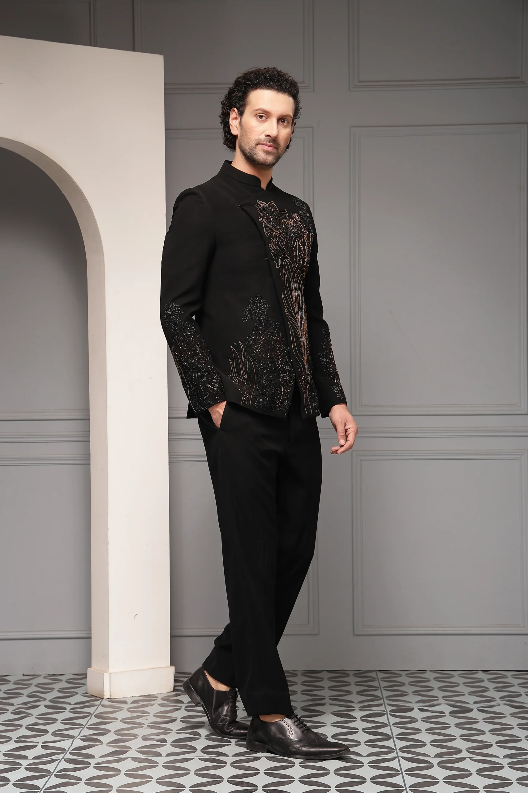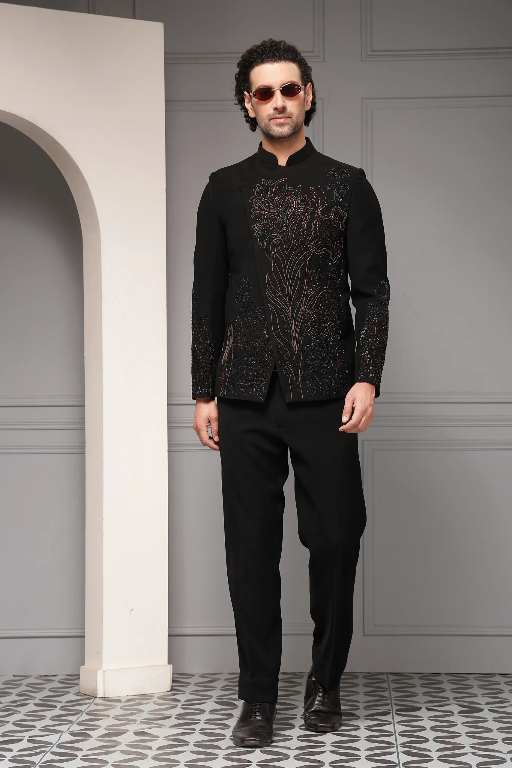 Introducing a refined black bandhgala set designed for elevated ceremonial dressing. The bandhgala jacket features intricate floral embroidery in subtle metallic tones, flowing gracefully across the front and sleeves to create depth and understated drama. Crafted with a structured yet contemporary silhouette, it is paired with impeccably tailored trousers, delivering a polished, regal ensemble ideal for formal evenings and distinguished occasions.