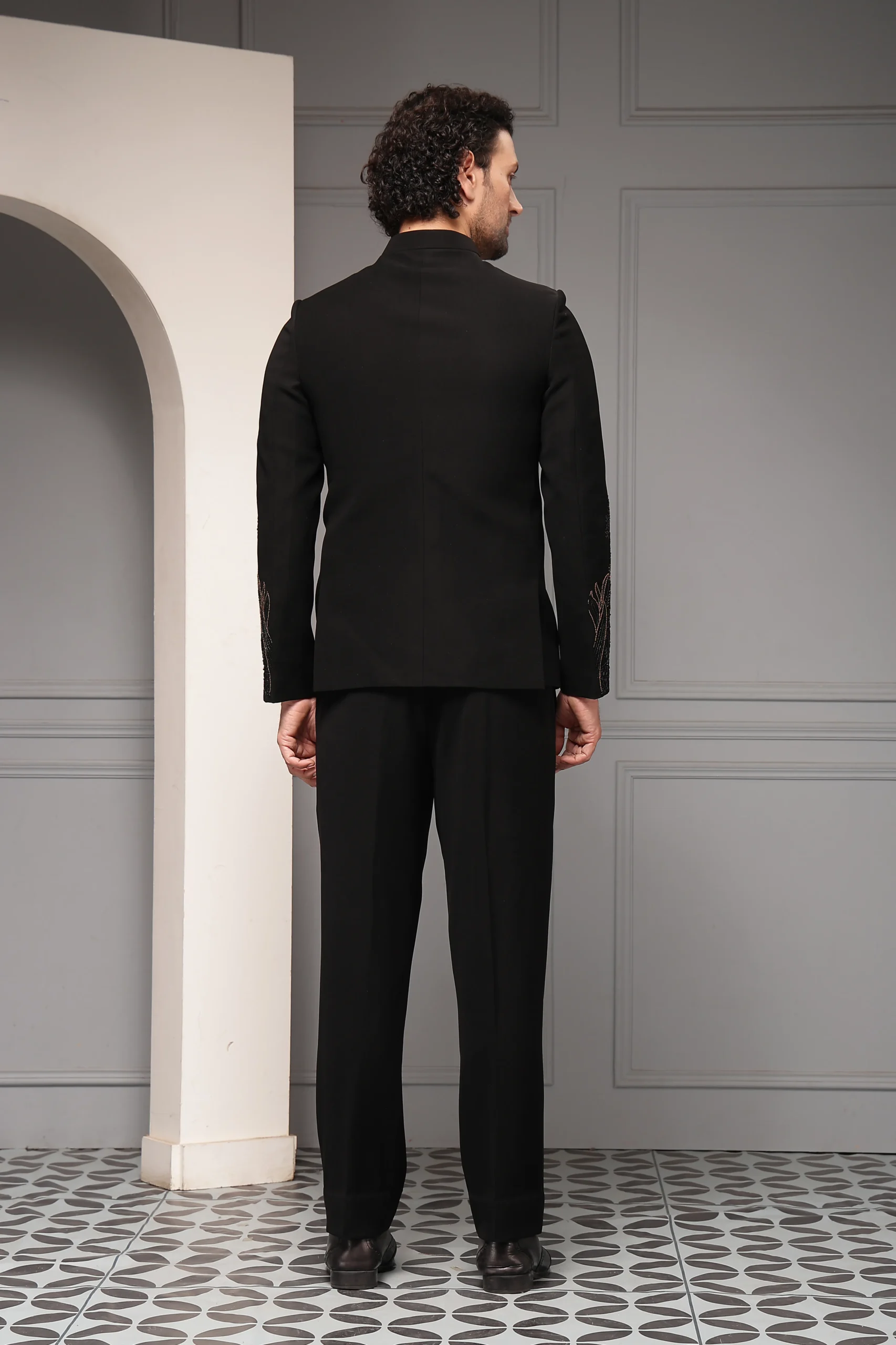 Style this refined bandhgala set with polished black or patent leather mojris for a regal finish. Opt for a minimal brooch or metallic cufflinks to complement the embroidery without overpowering it.