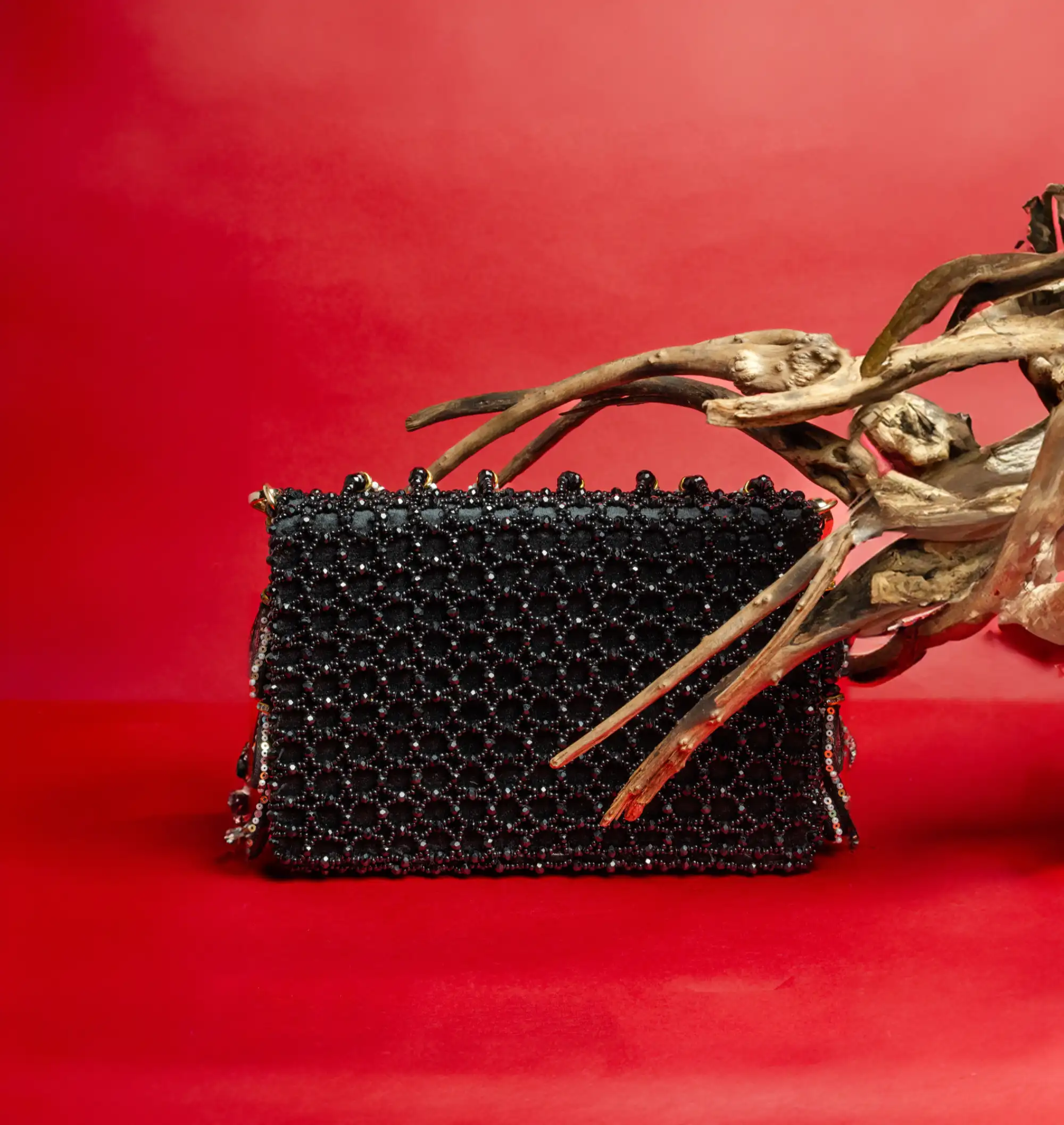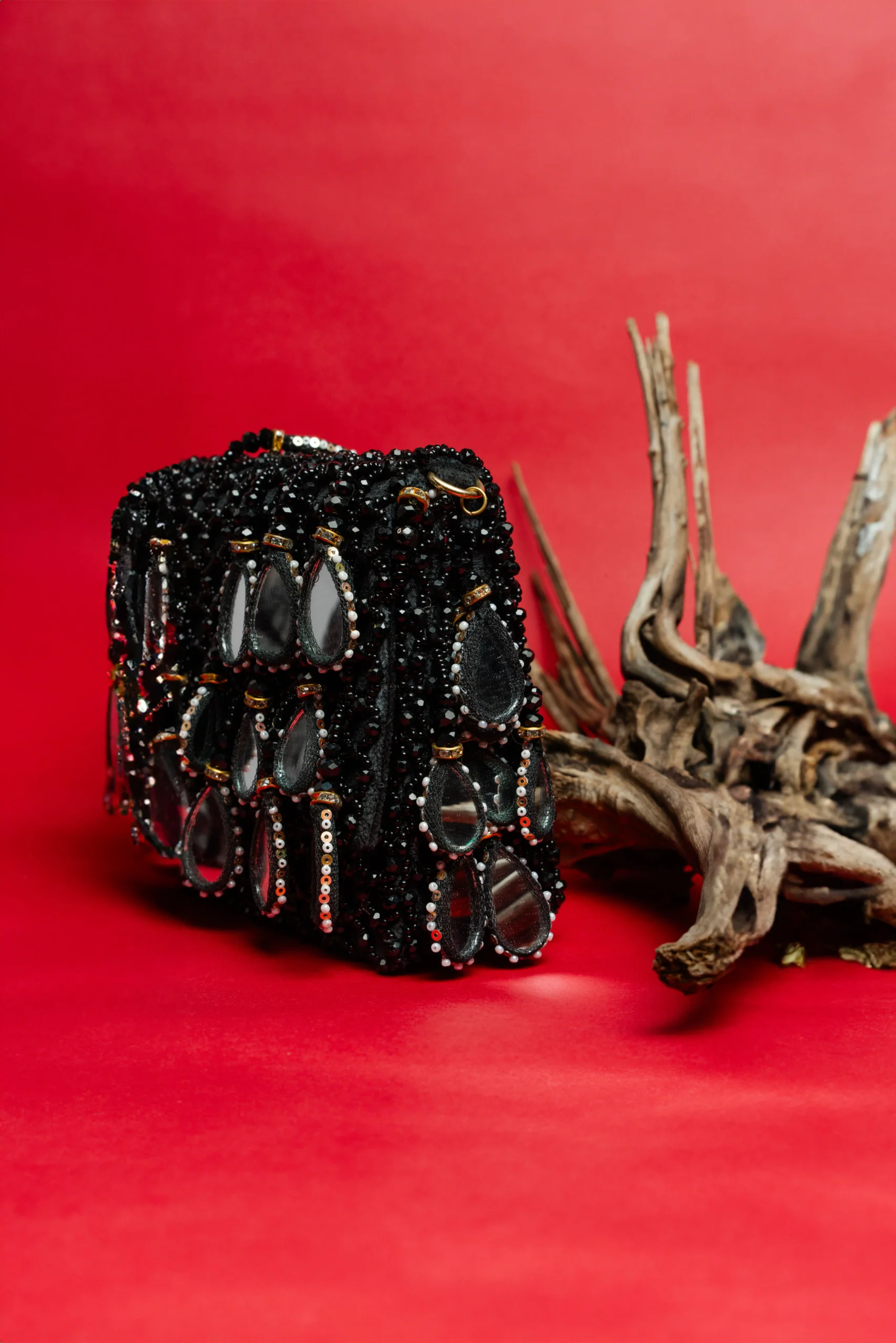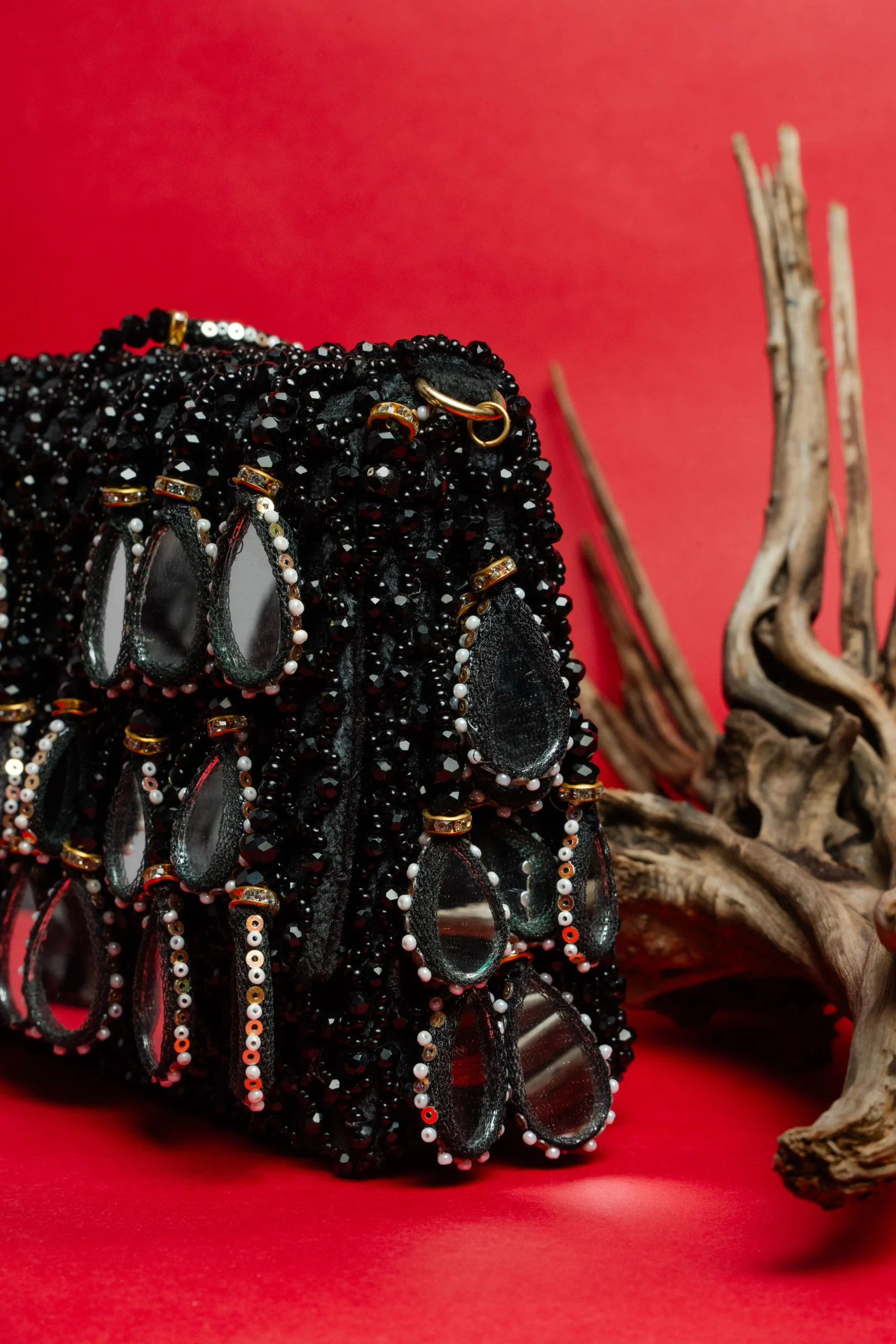 Black Mirror Embellished Box Potli with Pearl Beadwork and Tassel Detail