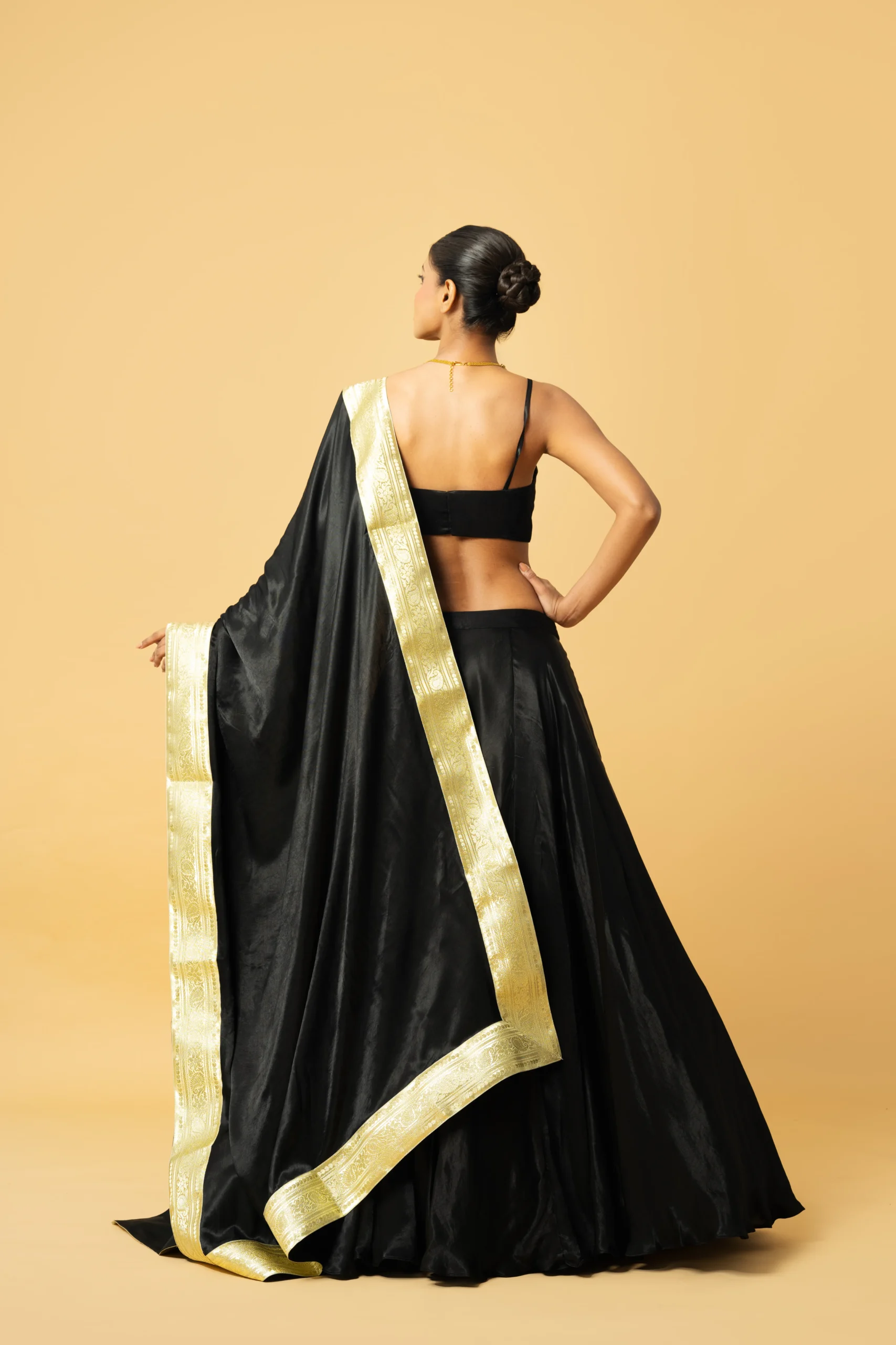 Introducing our elegant Black Modal Satin Lehenga, designed to make a bold yet graceful statement. Crafted in luxurious modal satin, the lehenga features a flattering flare paired with a chic sleeveless blouse for a contemporary silhouette. The ensemble is completed with a dupatta adorned with golden lace detailing and delicate latkans, adding a touch of festive charm. Perfect for weddings, receptions, and evening celebrations, this set blends modern sophistication with timeless appeal.