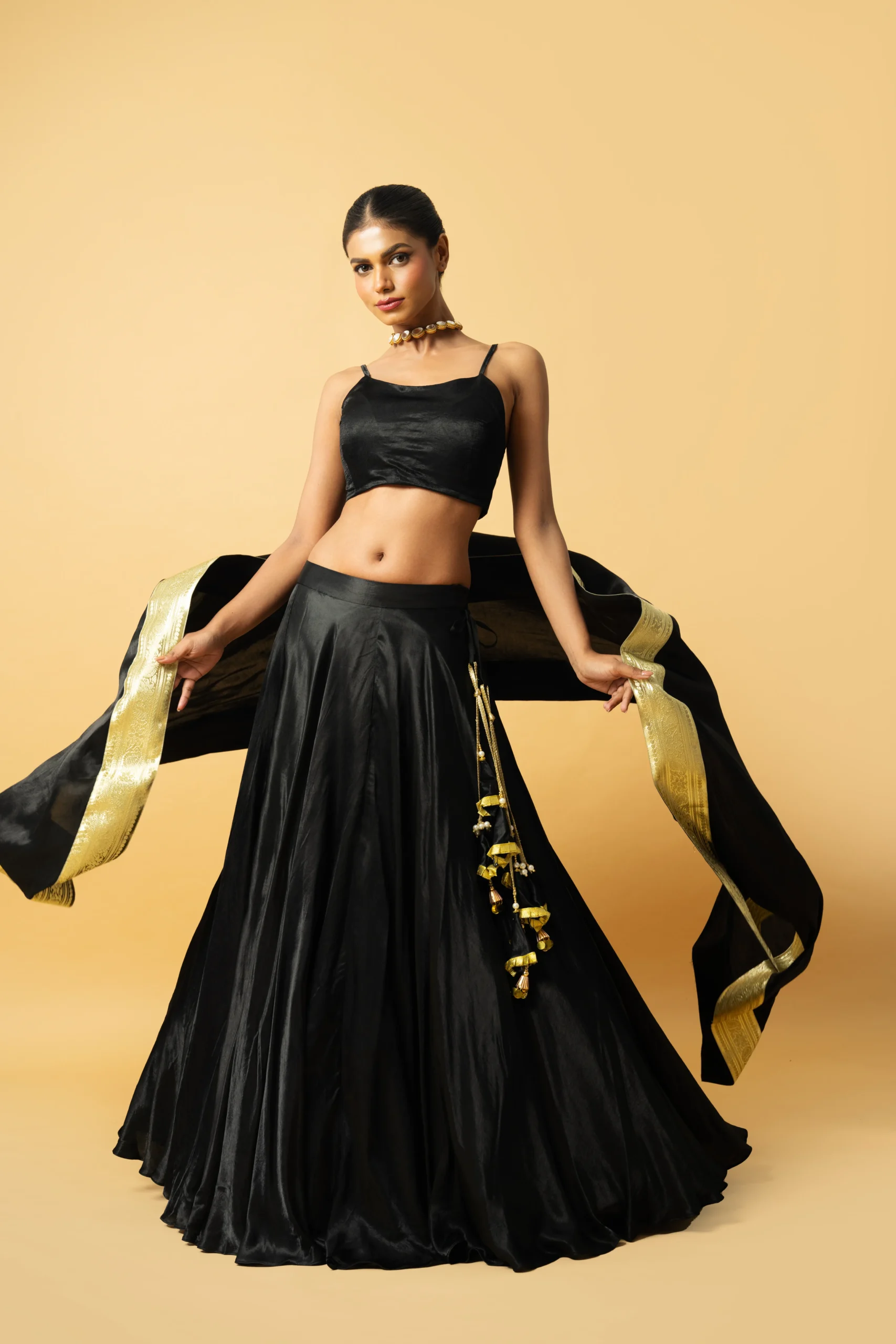 Elevate this black lehenga set with statement gold or kundan jewelry to complement the lace detailing and festive latkans. Pair it with embellished heels or classic metallic stilettos for a refined finish. Complete the look with a structured clutch for weddings and reception evenings.