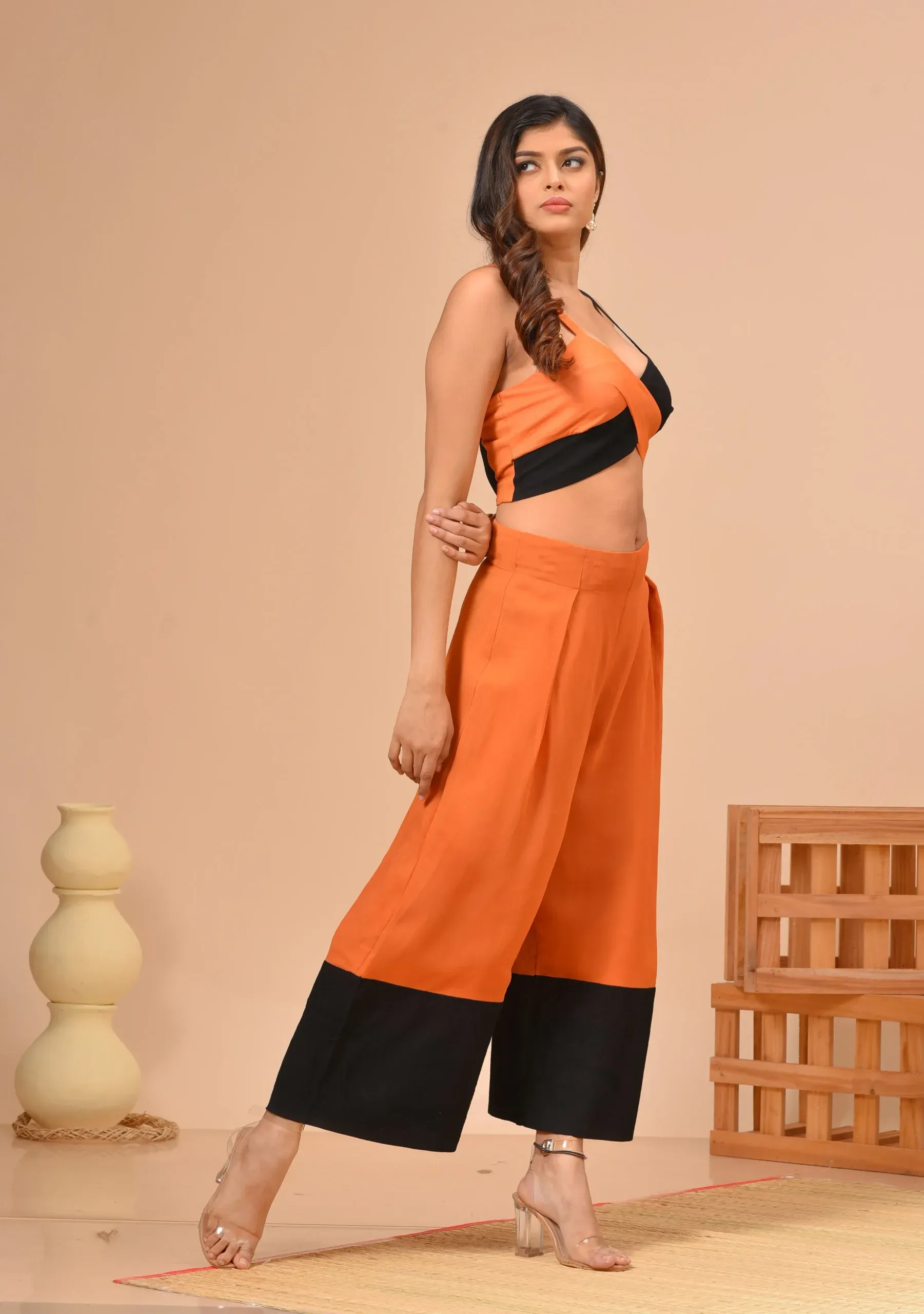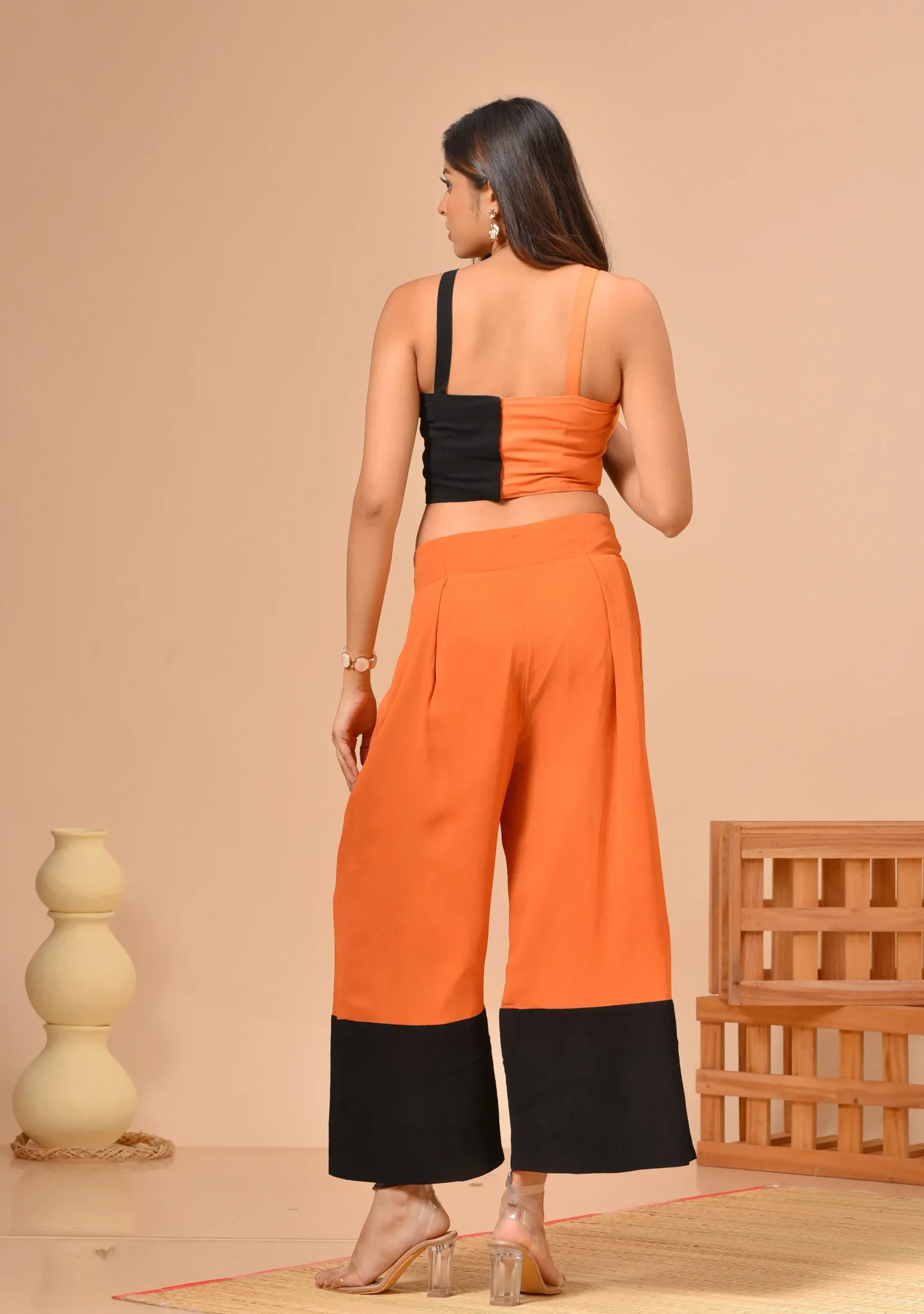 Black & Orange Georgette Pleated Culotte Co-ord Set