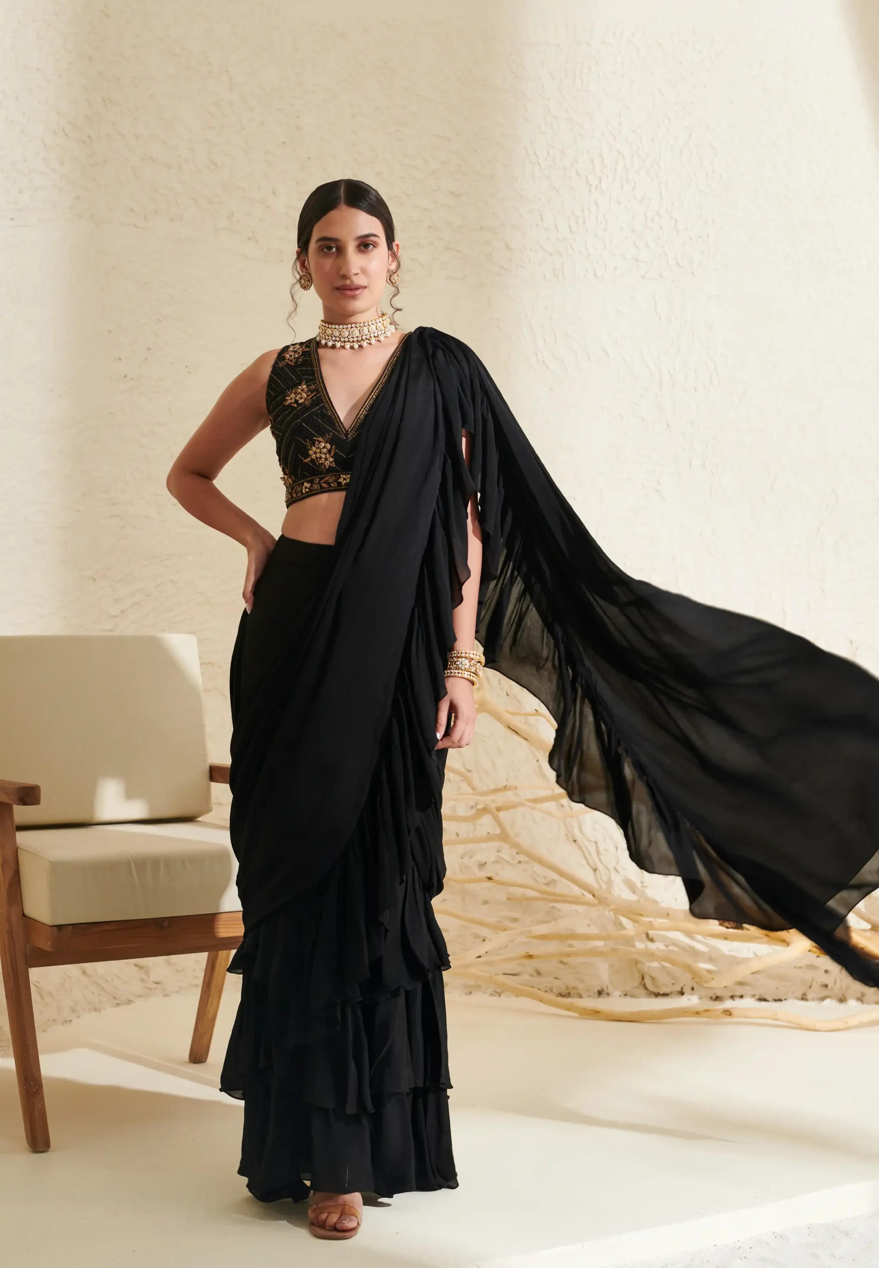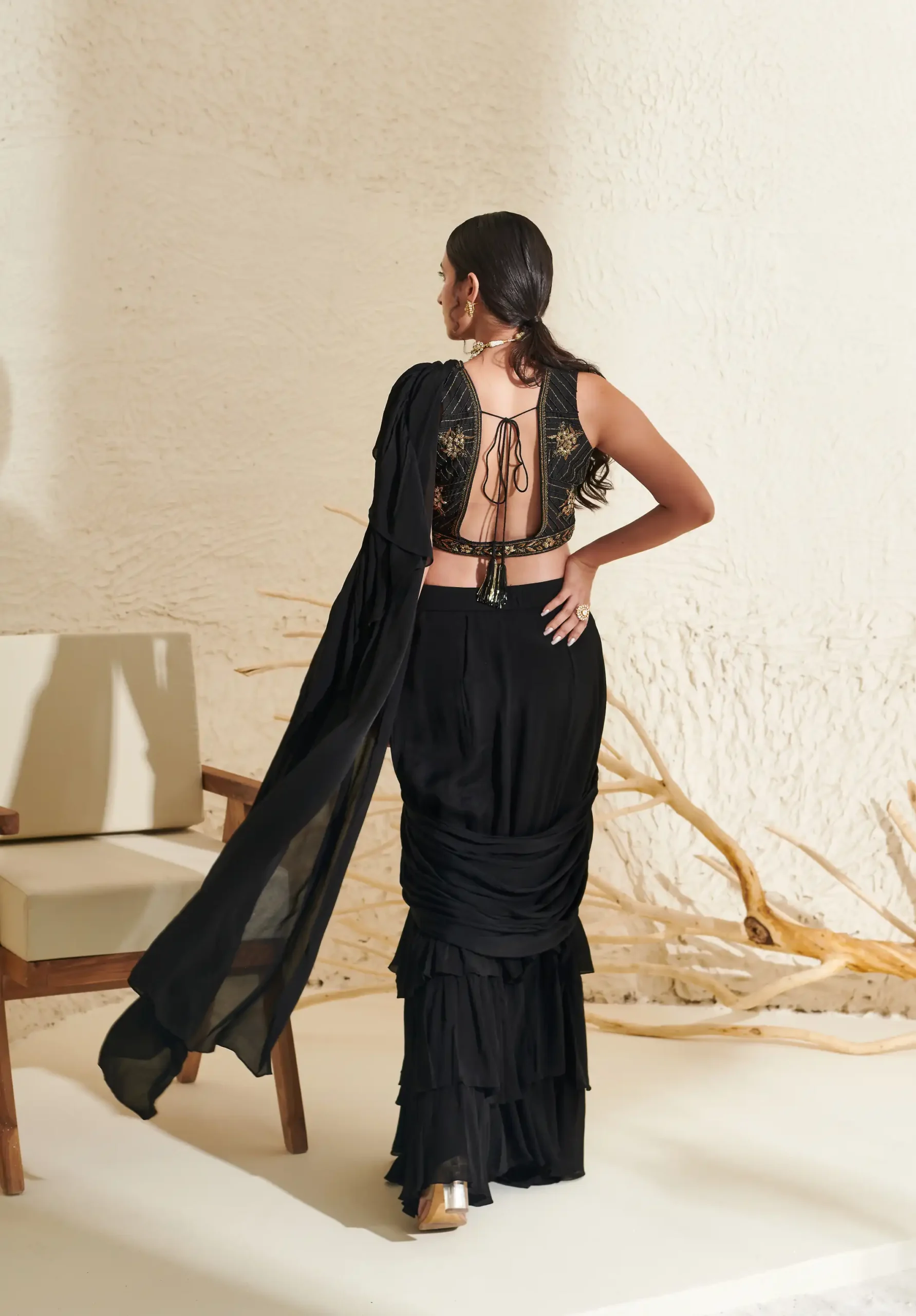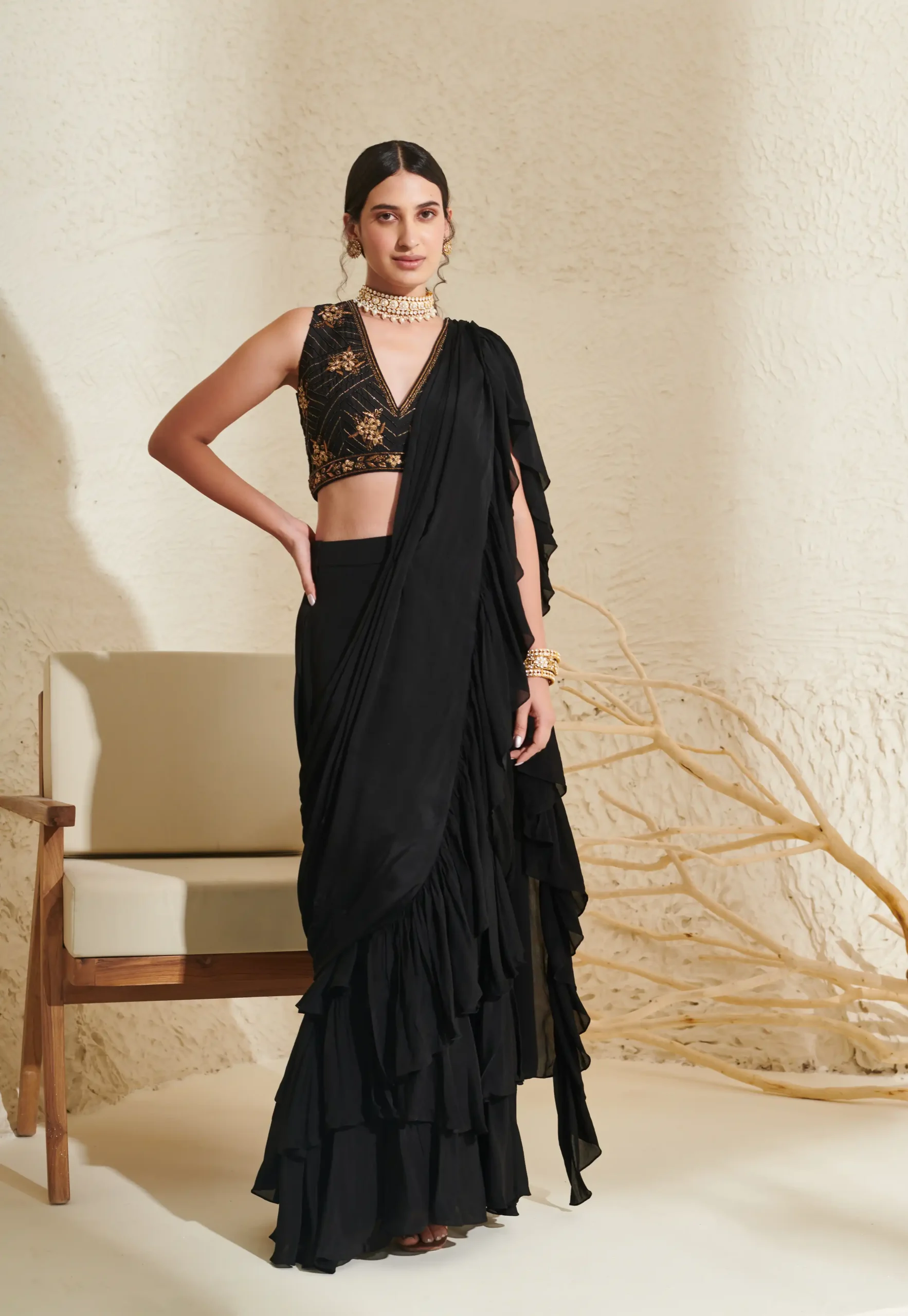 Black Ruffle Pre-Stitched Saree with Hand Embroidered Blouse