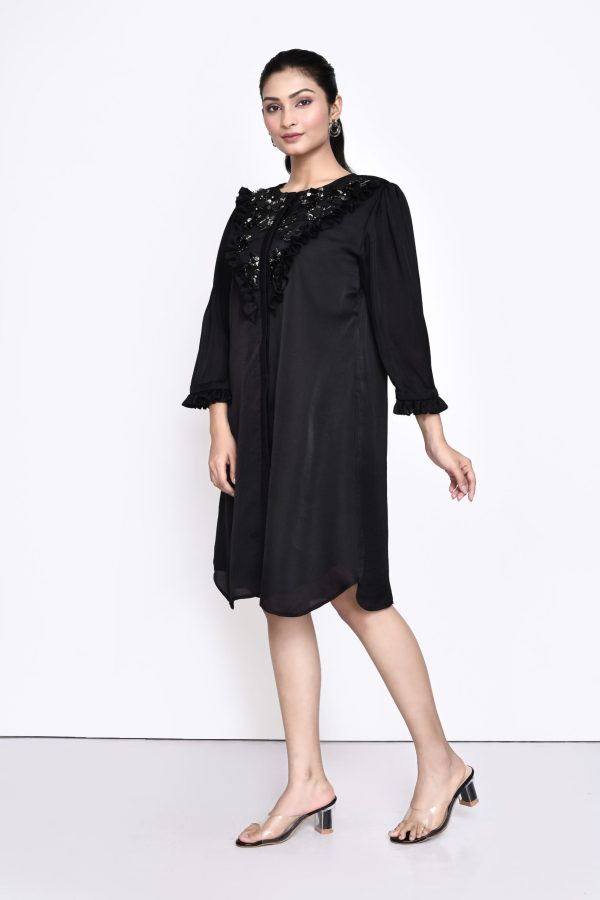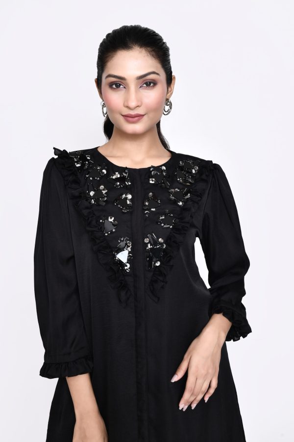 Showcasing a stunning black silk blend dress, crafted to make a striking impression with its bold chunky embellishments on the V-shaped yoke. The fashionable frill detailing adds a hint of femininity and flair, making this dress a versatile choice for any event. Ideal for elevating your wardrobe effortlessly, it beautifully merges classic elegance with contemporary style.
