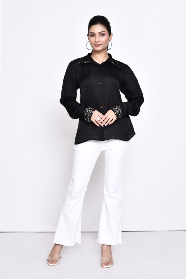 Showcasing black silk blend shirt with exquisite gunmetal handwork on the collar and cuffs, adding a touch of sophistication and elegance. The luxurious fabric drapes beautifully, providing a polished look perfect for professional settings or special occasions.
