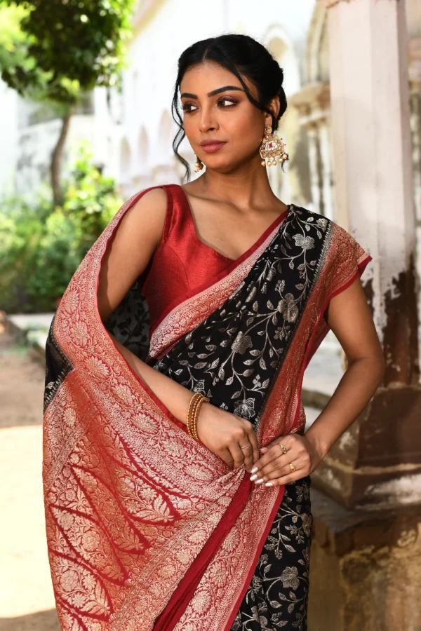 Black Silk Sarees with Gold Zari Jaal and Red Palla
