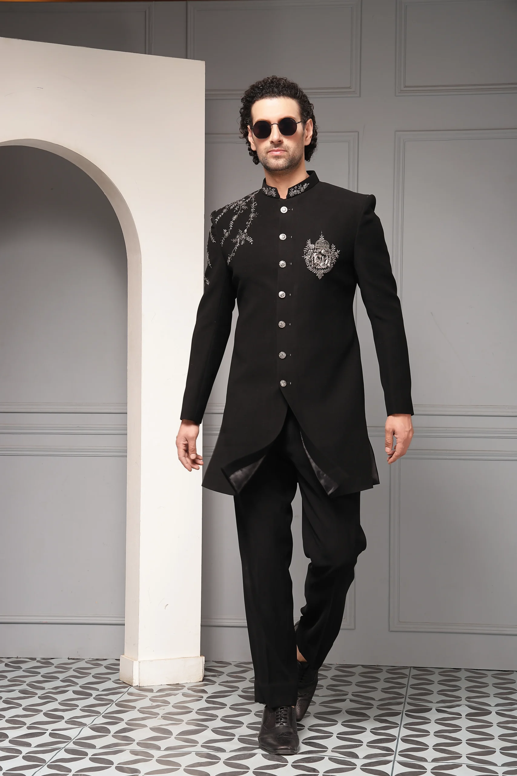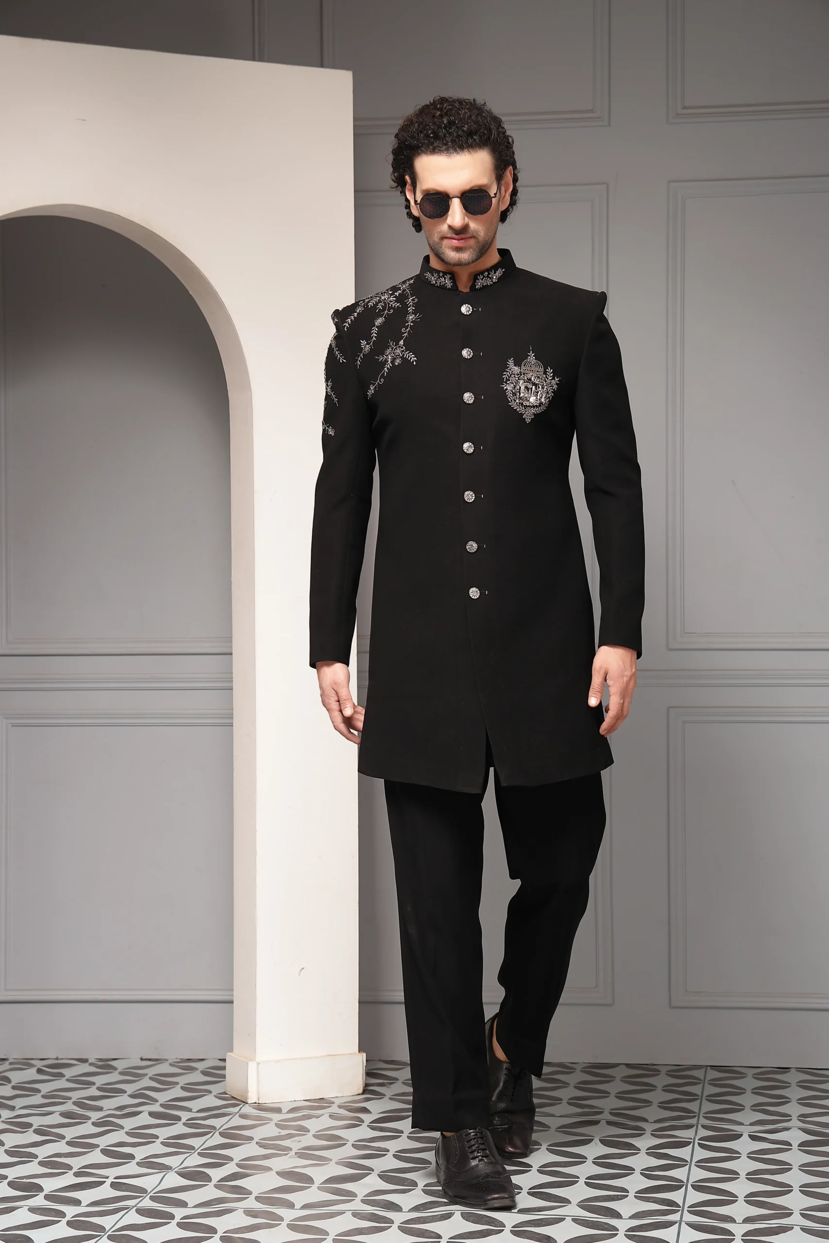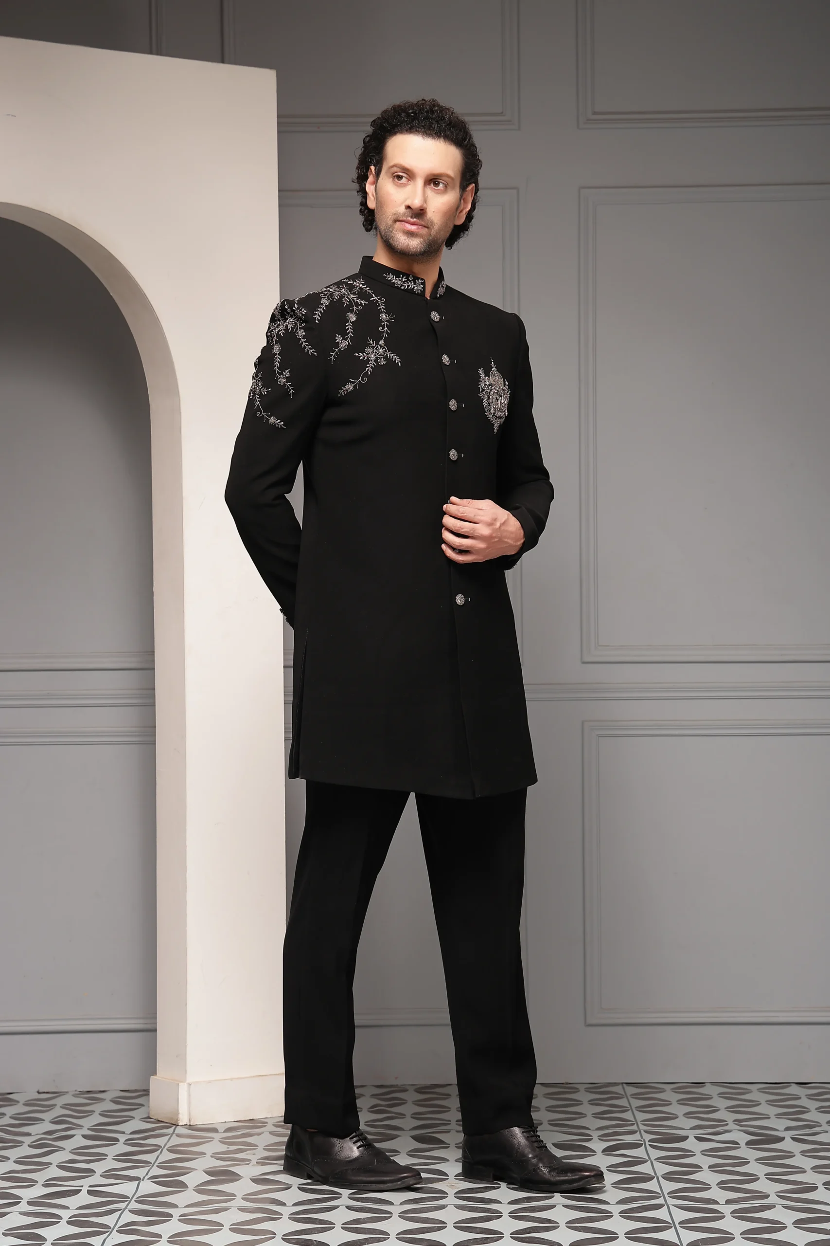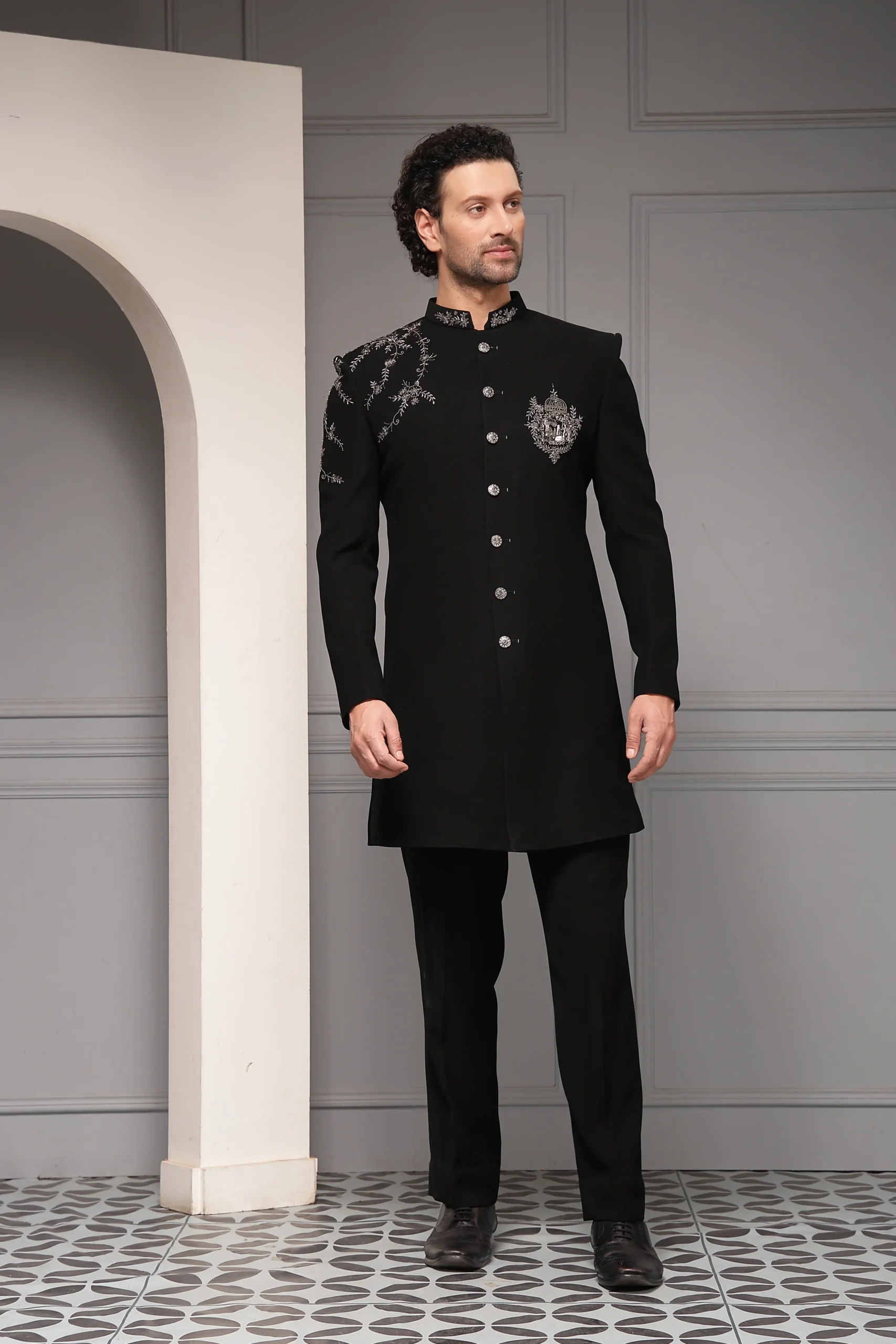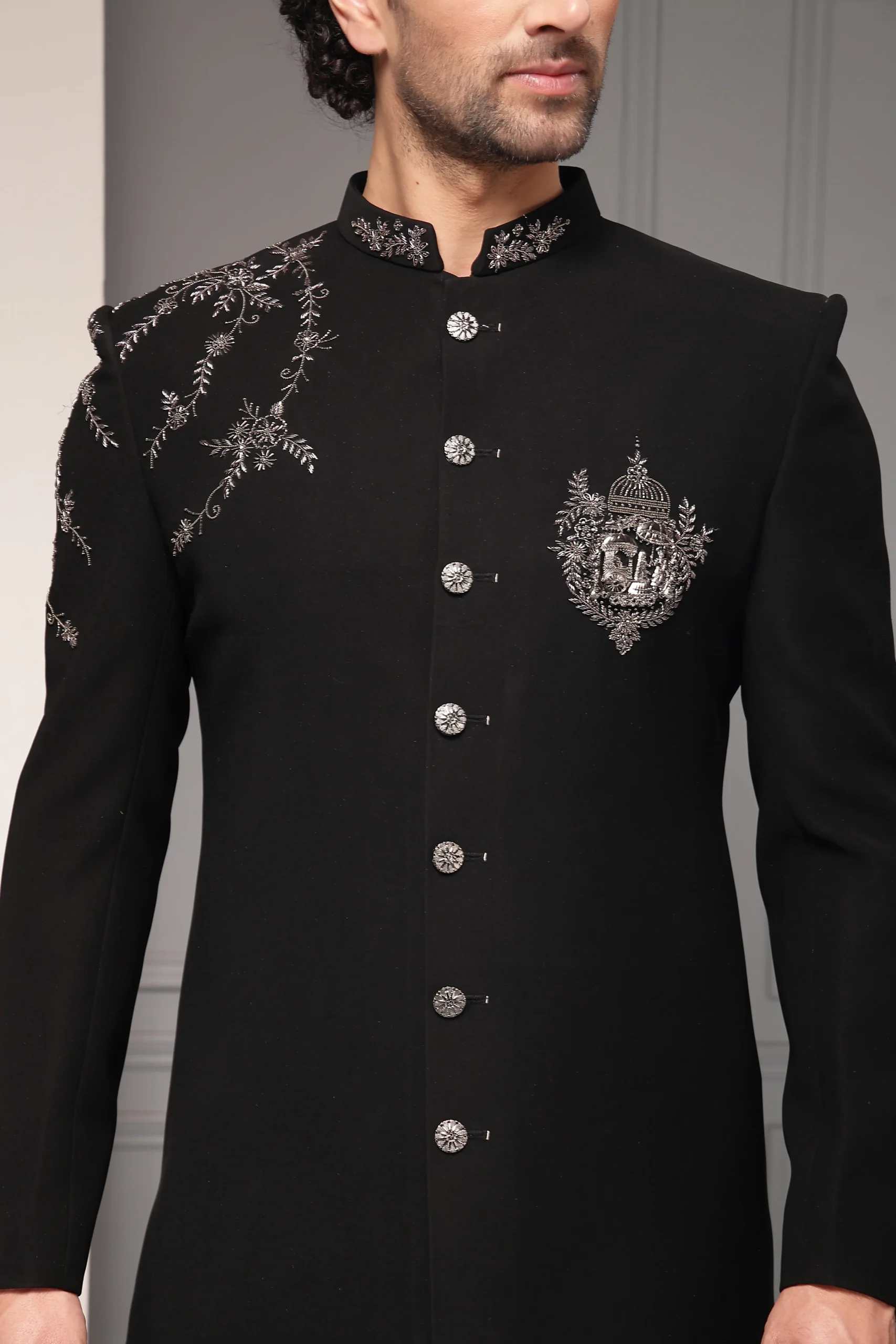 Classic black bandhgala set with monochrome floral embroidery from Golden Muslin By Soniya G